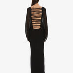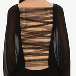 The back is framed by sheer, laddered lace panels, revealing skin through horizontal strips. Long, sheer sleeves extend the line of the silhouette.