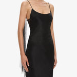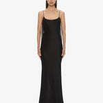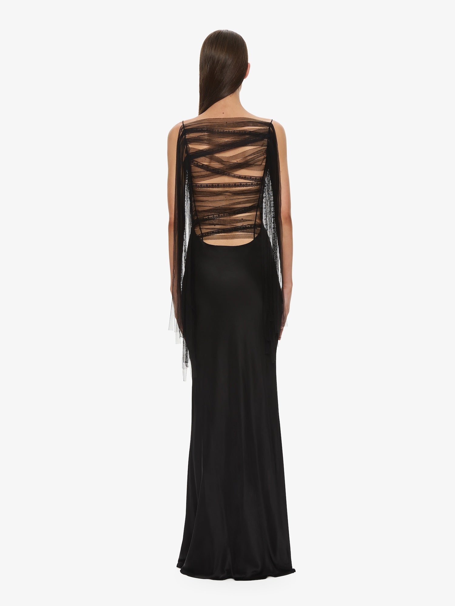 Designed to reveal and conceal with precision, this piece is anchored by slender straps and a softly flared hem. Structured with a floor-length silk silhouette and sheer illusion back, framed by gathered tulle and delicate lace.