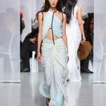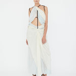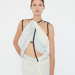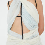Cascades of feather weight silk wrap and adorn the body to create dramatic volume and movement. Crafted from a latticed wool-silk lace, this dress gathers and drapes over the body with fluidity, featuring a bare midriff.