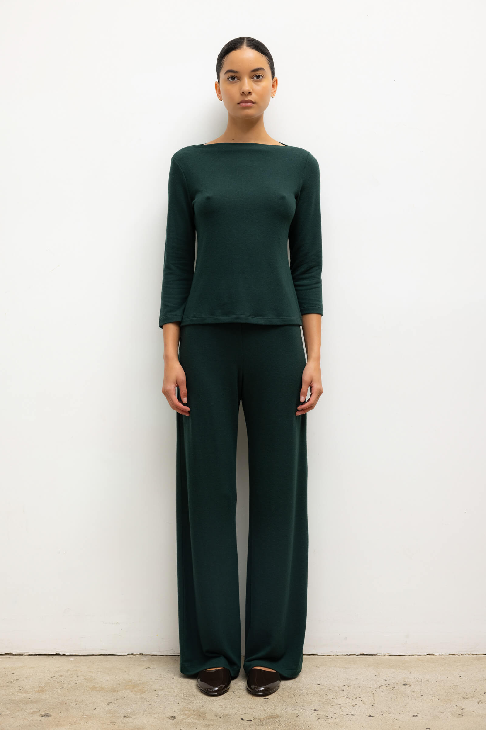 Cut in our buttery soft brushed Lauren Sweater Jersey, The Lauren Wide Leg Pant is an easy, pull-on style pant that features an elastic mid-rise waistband and a relaxed, perfected draped wide leg. Make it a matching set with the Lauren Bracelet Top.