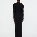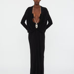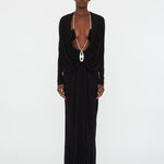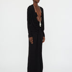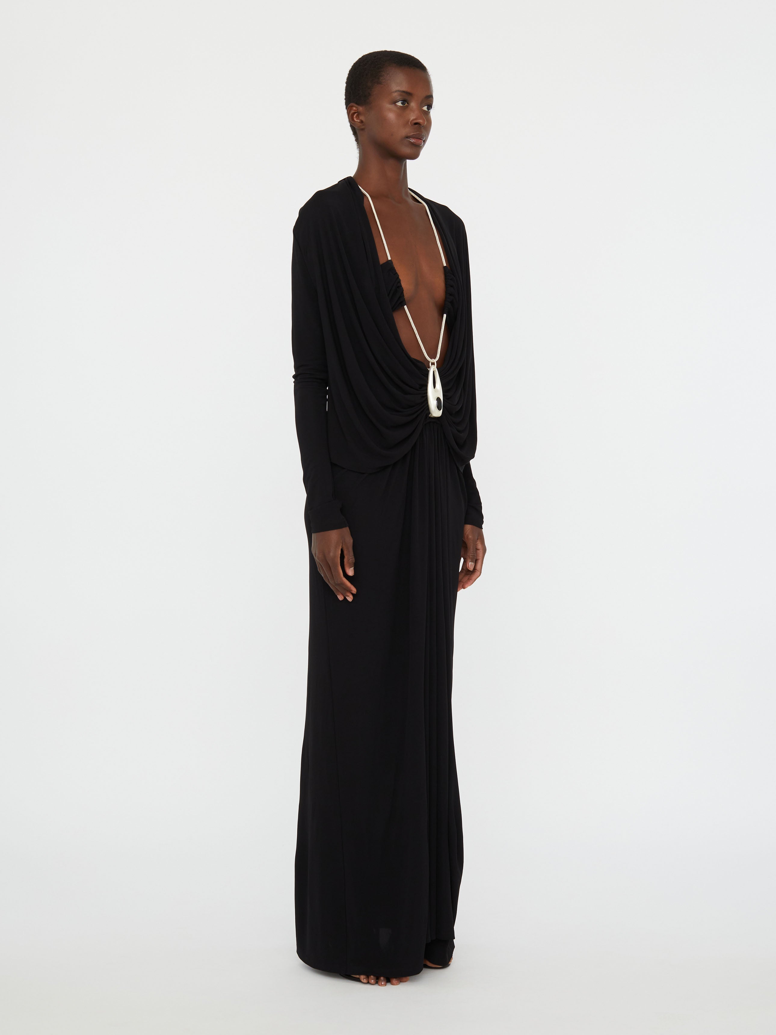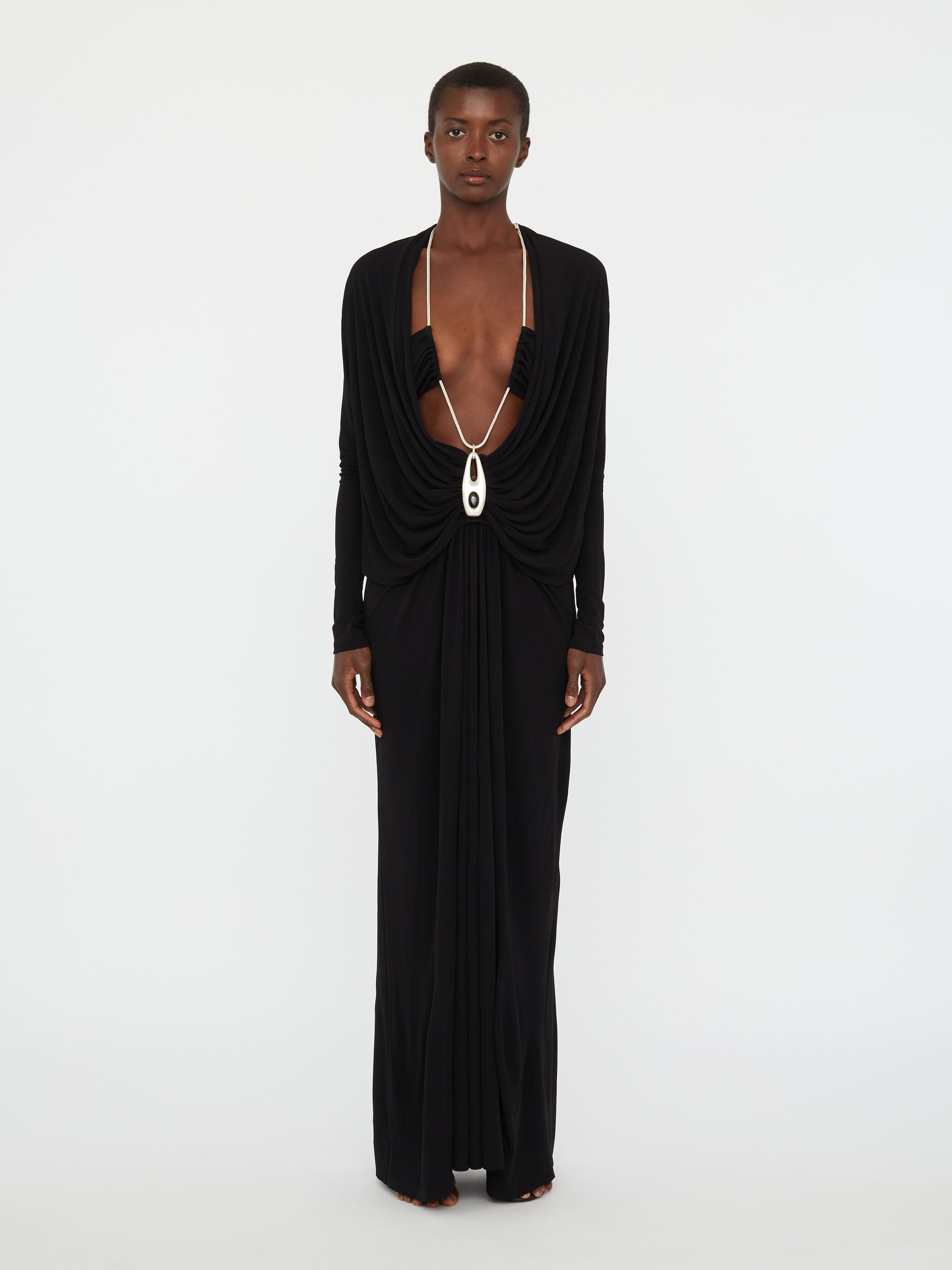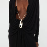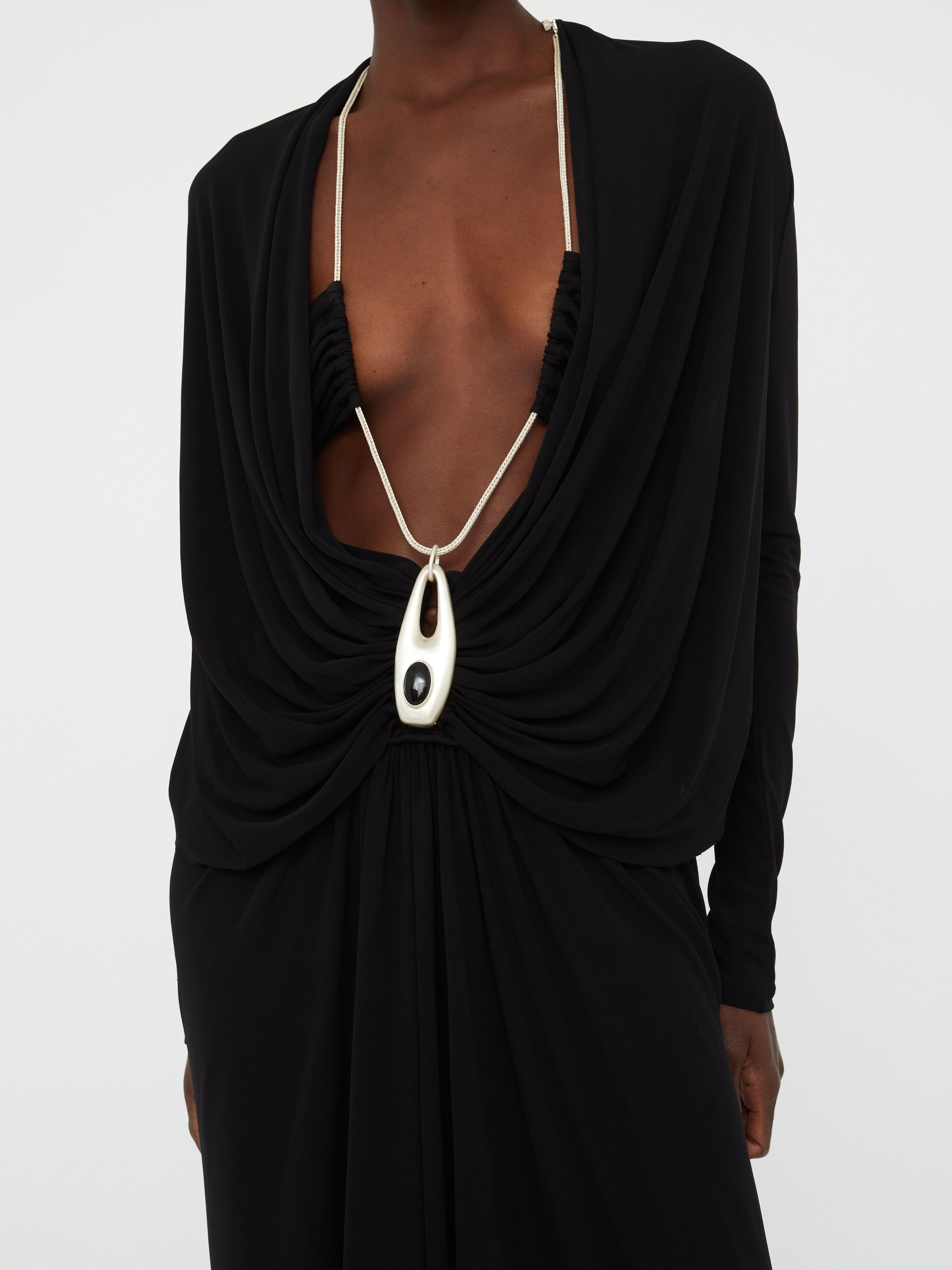 Sculptural hardware anchors fine jersey to form around the body. A refined long sleeve top exposes the décolletage, finished with hand-polished black agate stone, anchored at the waist with modern twist detailing.