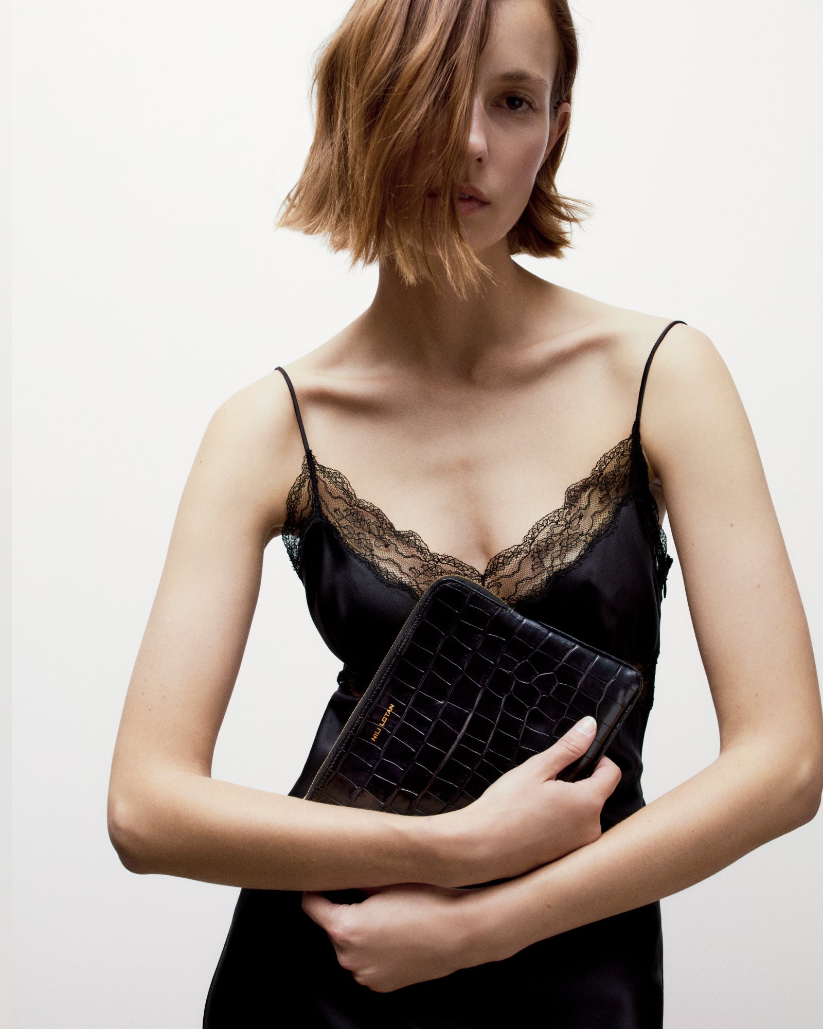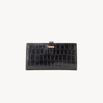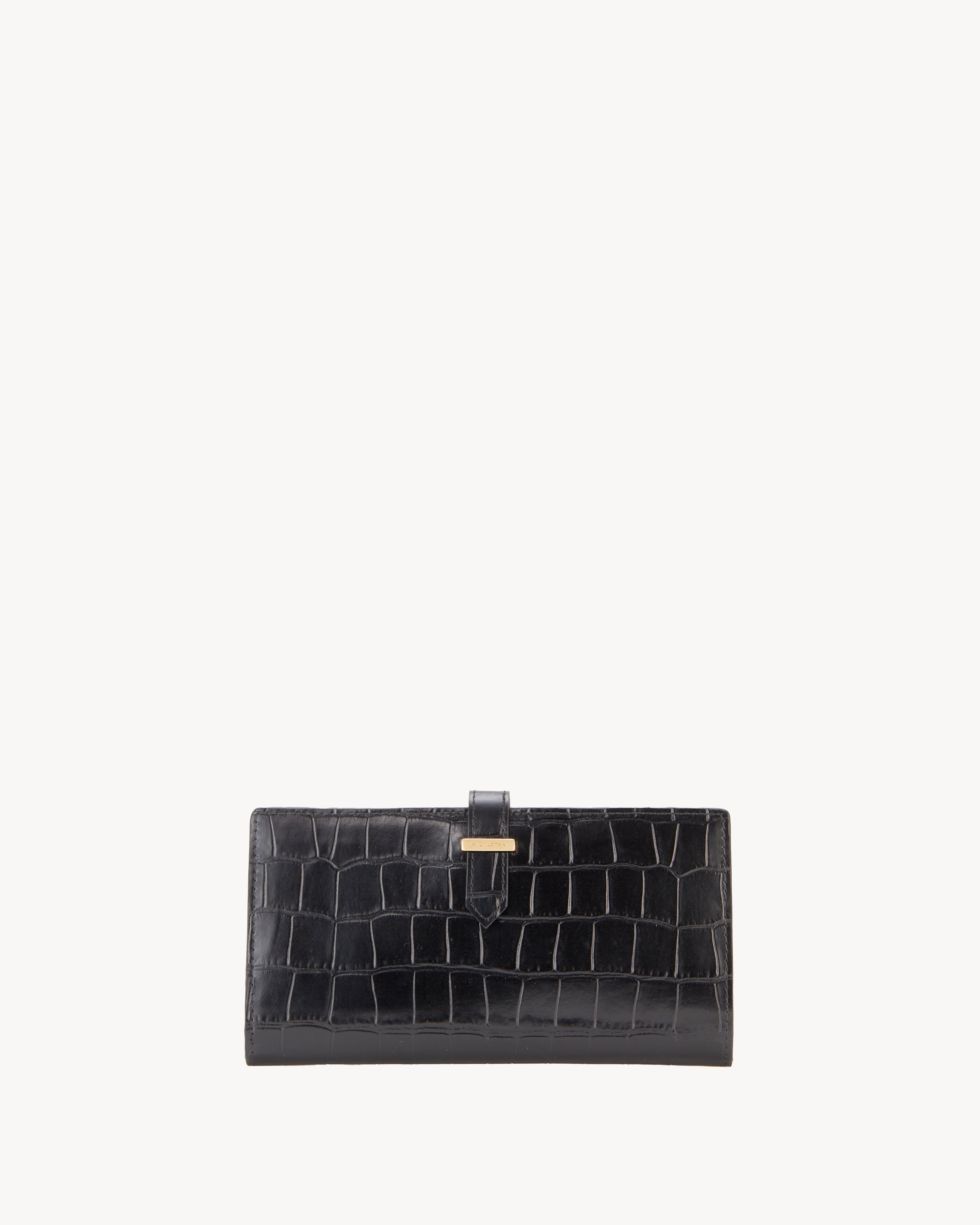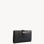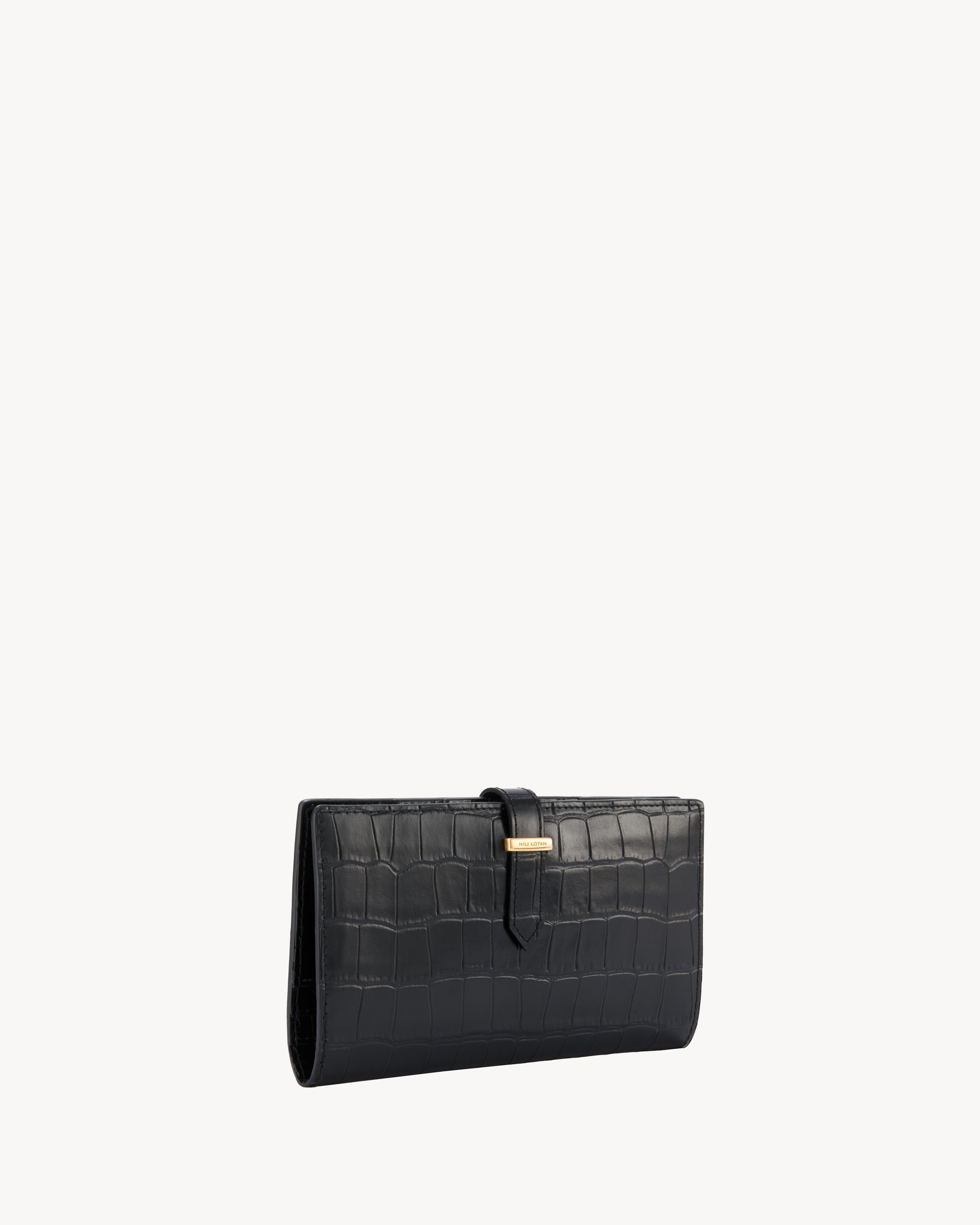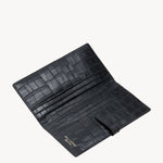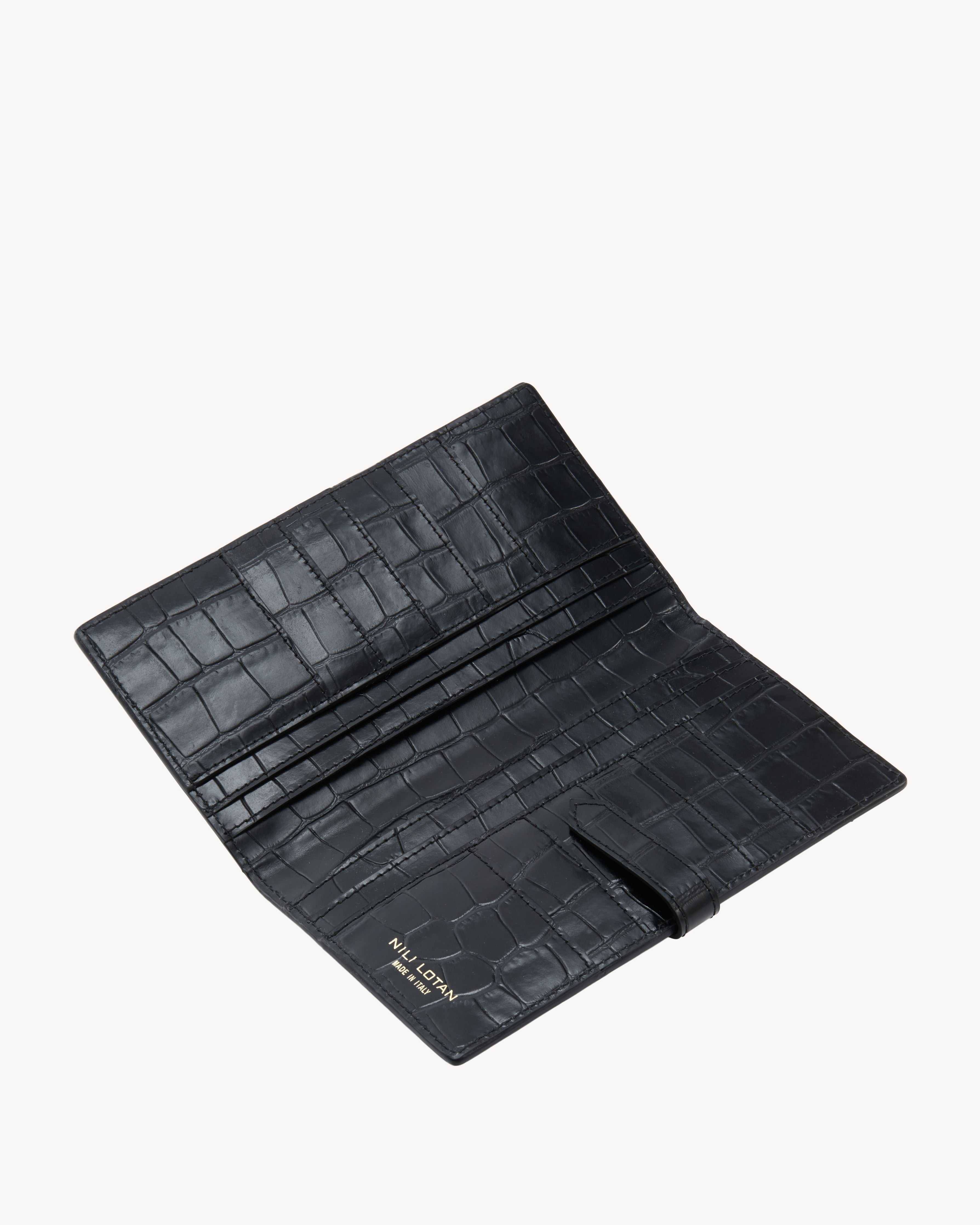 Wallet in Italian embossed calfskin. Crocodile pattern. Interior credit card slots. Interior bill compartments. Leather strap closure. Custom branded clasp hardware in custom antique gold finish.