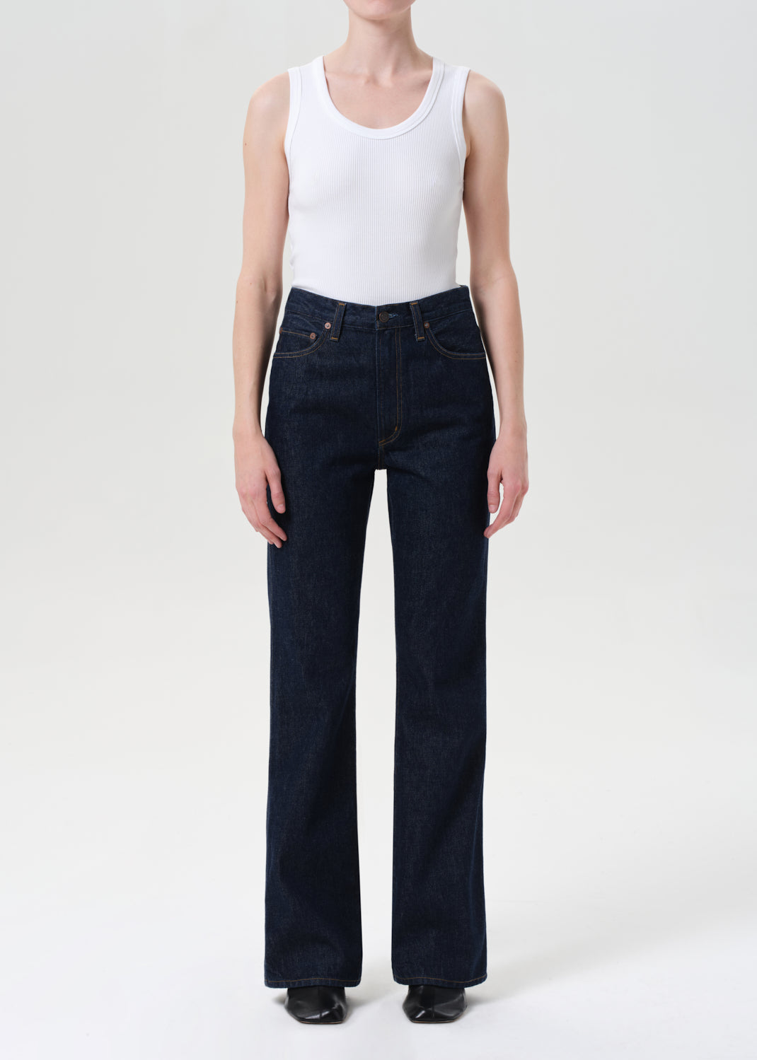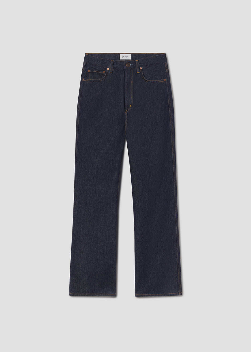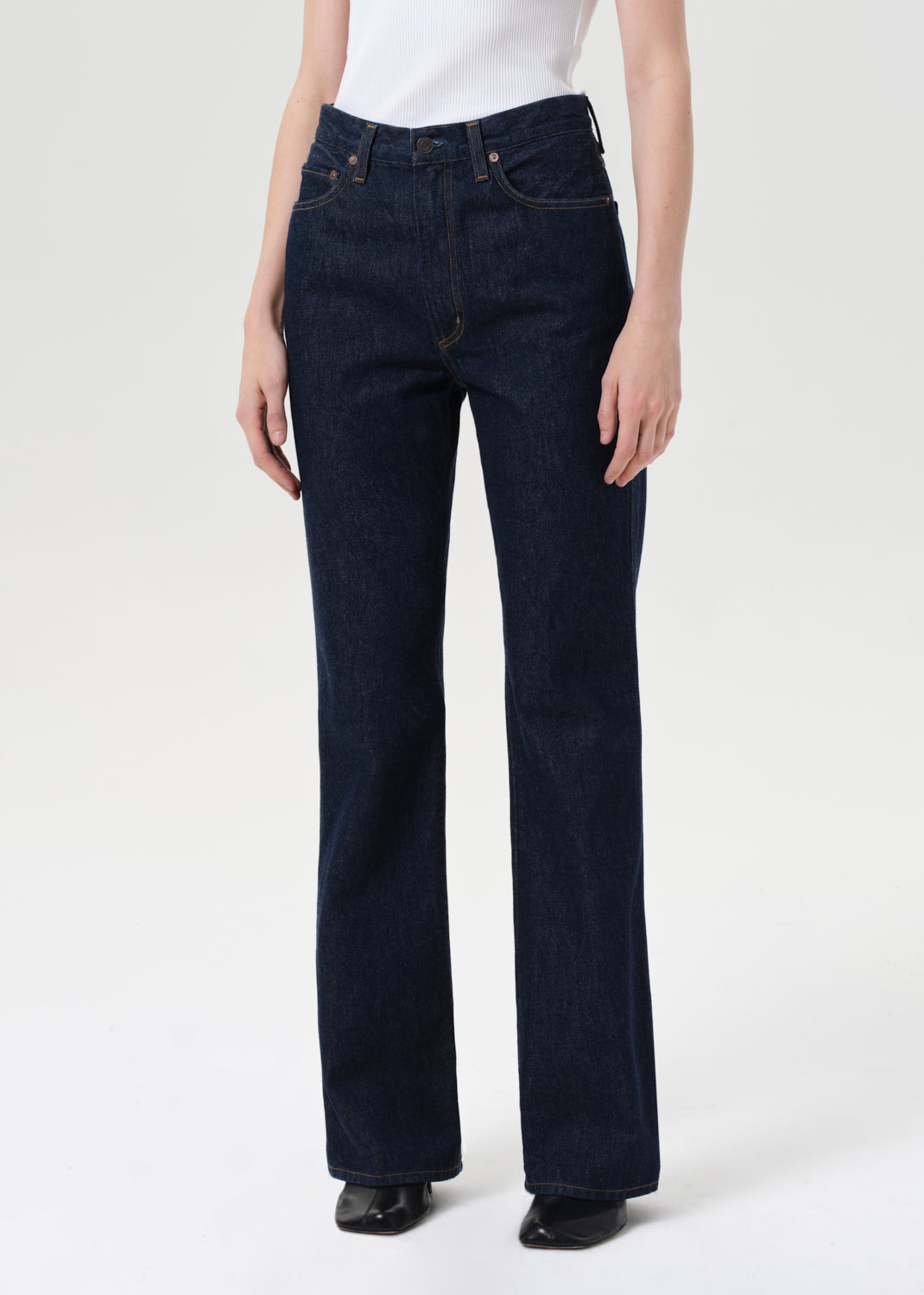 Designed to elongate and flatter, the Leena features a high rise and full-length flare that hugs through the hip before subtly kicking out. Crafted from rigid, non-stretch regenerative cotton denim with a soft hand, and finished in a medium indigo with marbled fading, whiskering, and a raw hem. Style with a sleek tank or tonal denim top for a clean, head-to-toe look.