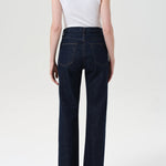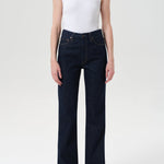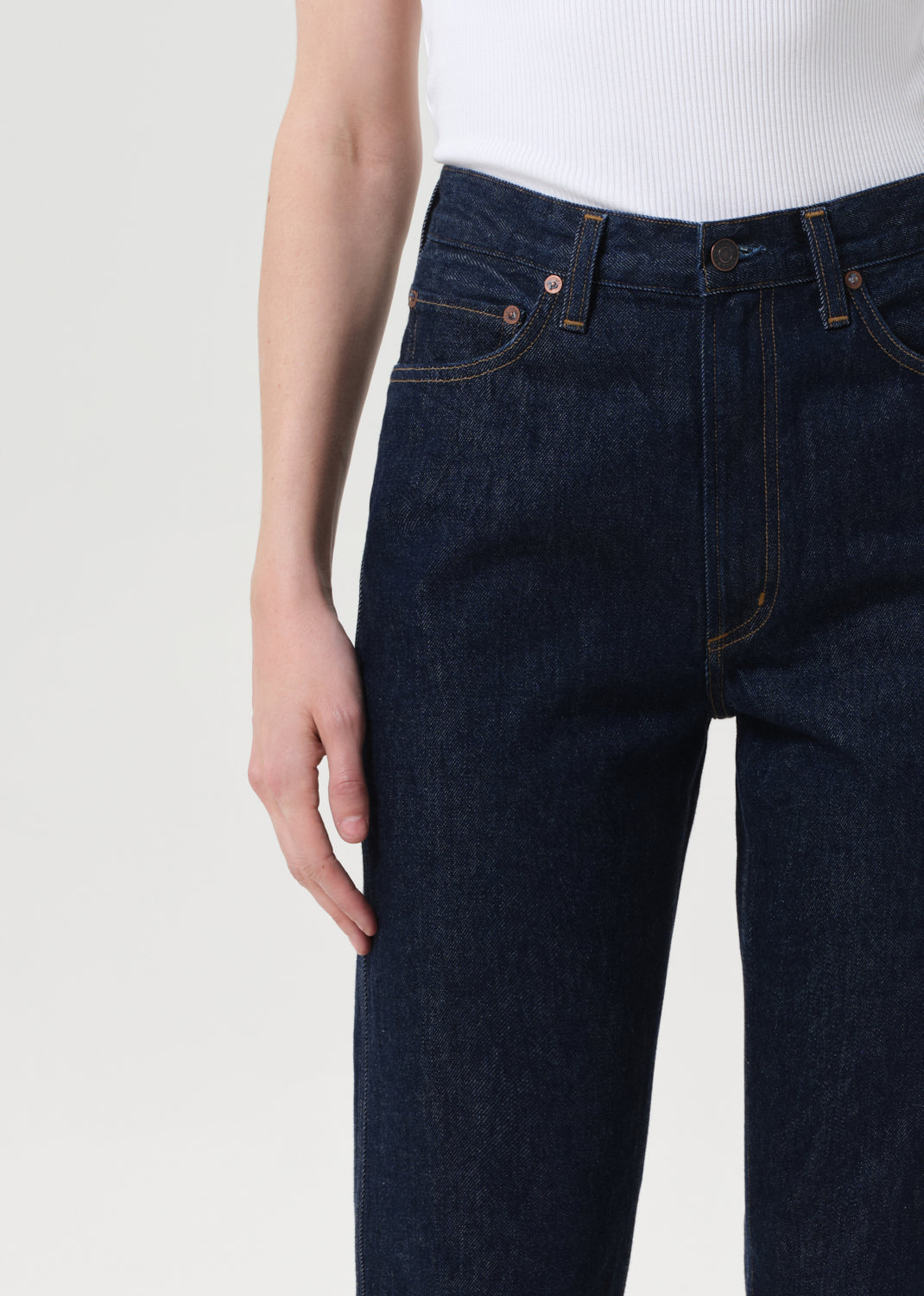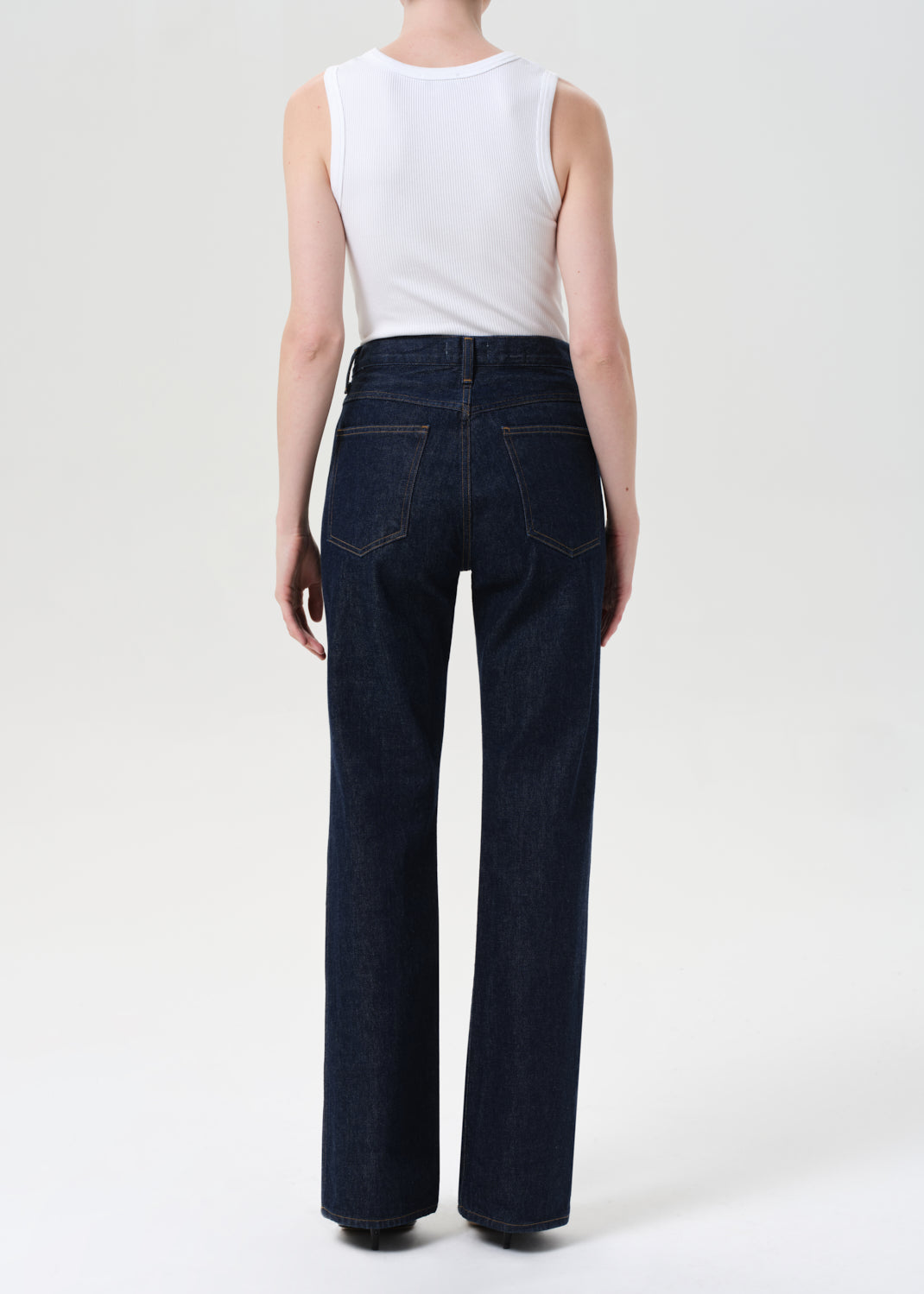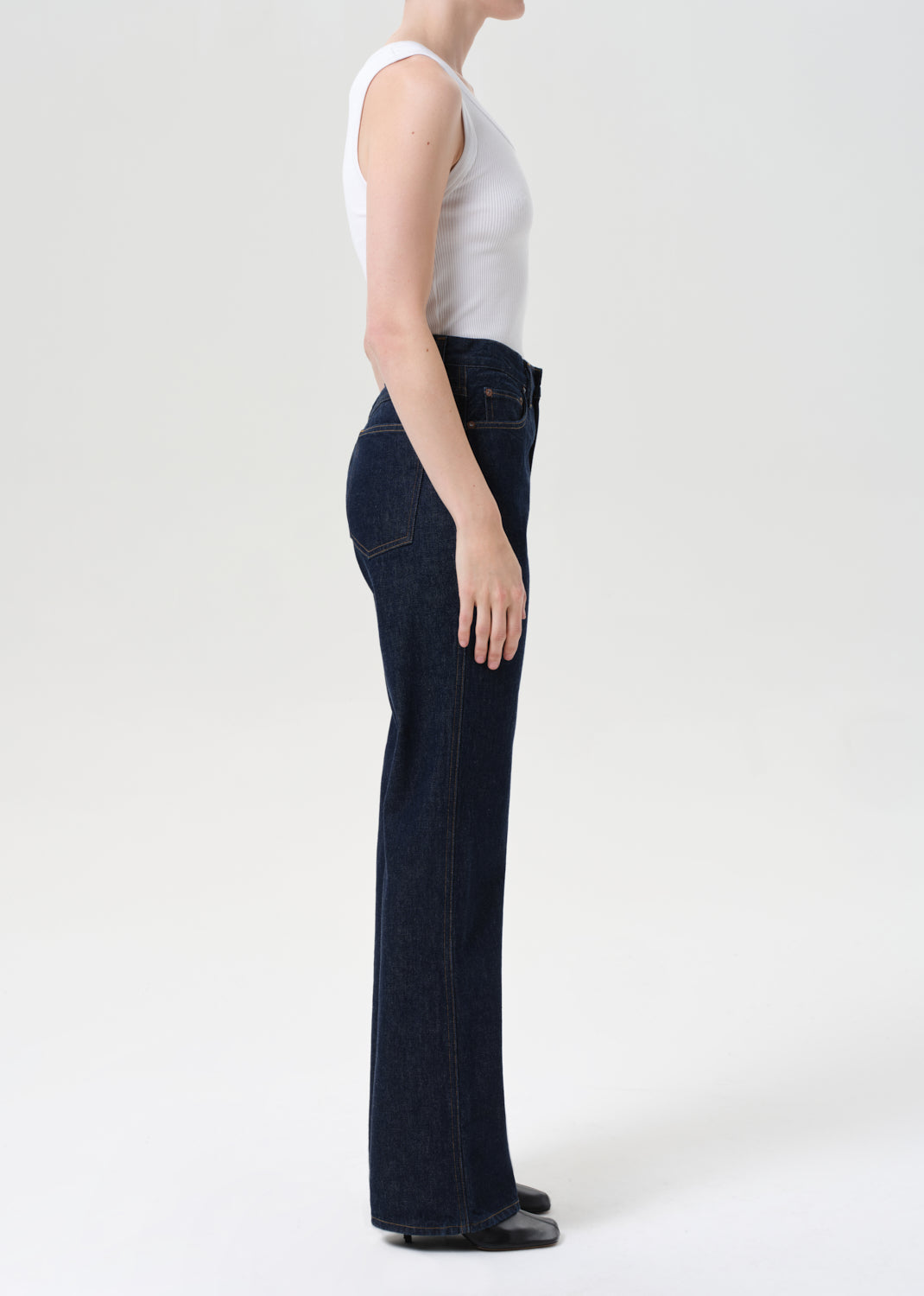 Designed to elongate and flatter, the Leena features a high rise and full-length flare that hugs through the hip before subtly kicking out. Crafted from rigid, non-stretch regenerative cotton denim with a soft hand, and finished in a medium indigo with marbled fading, whiskering, and a raw hem. Style with a sleek tank or tonal denim top for a clean, head-to-toe look.
