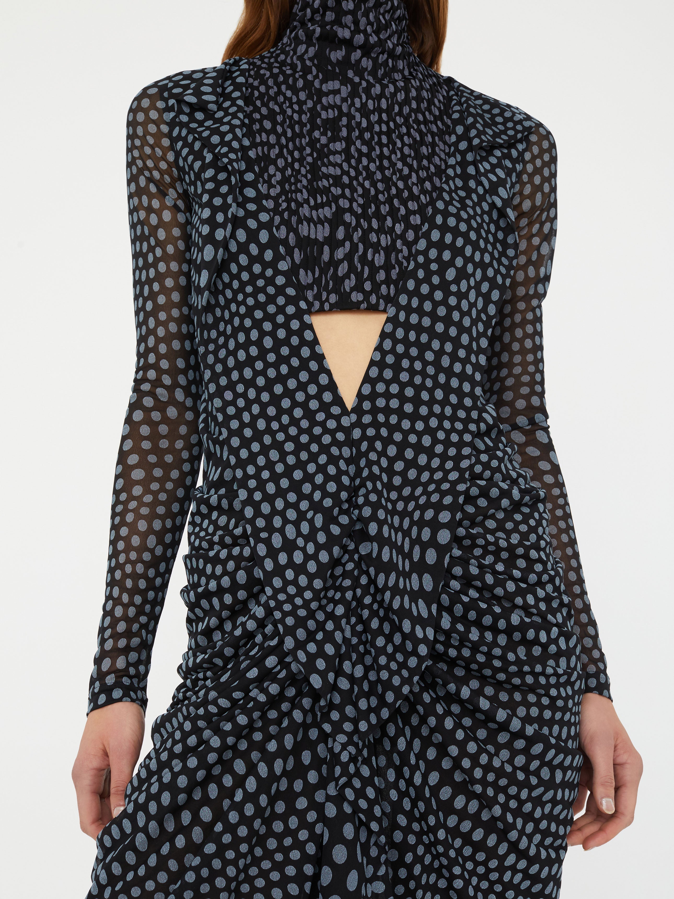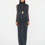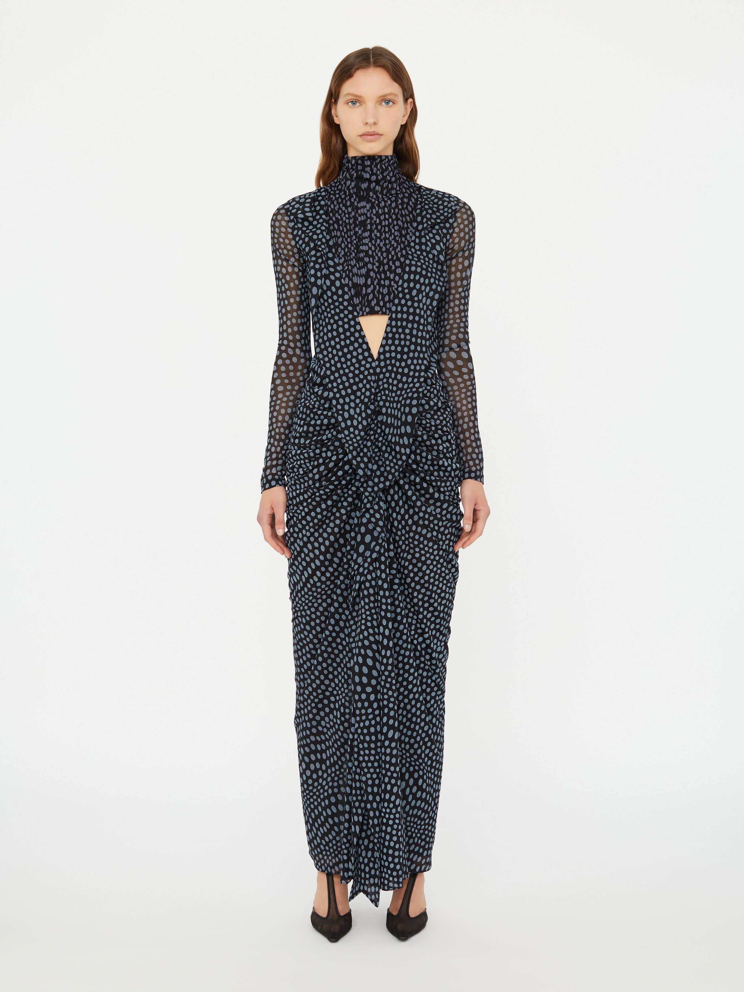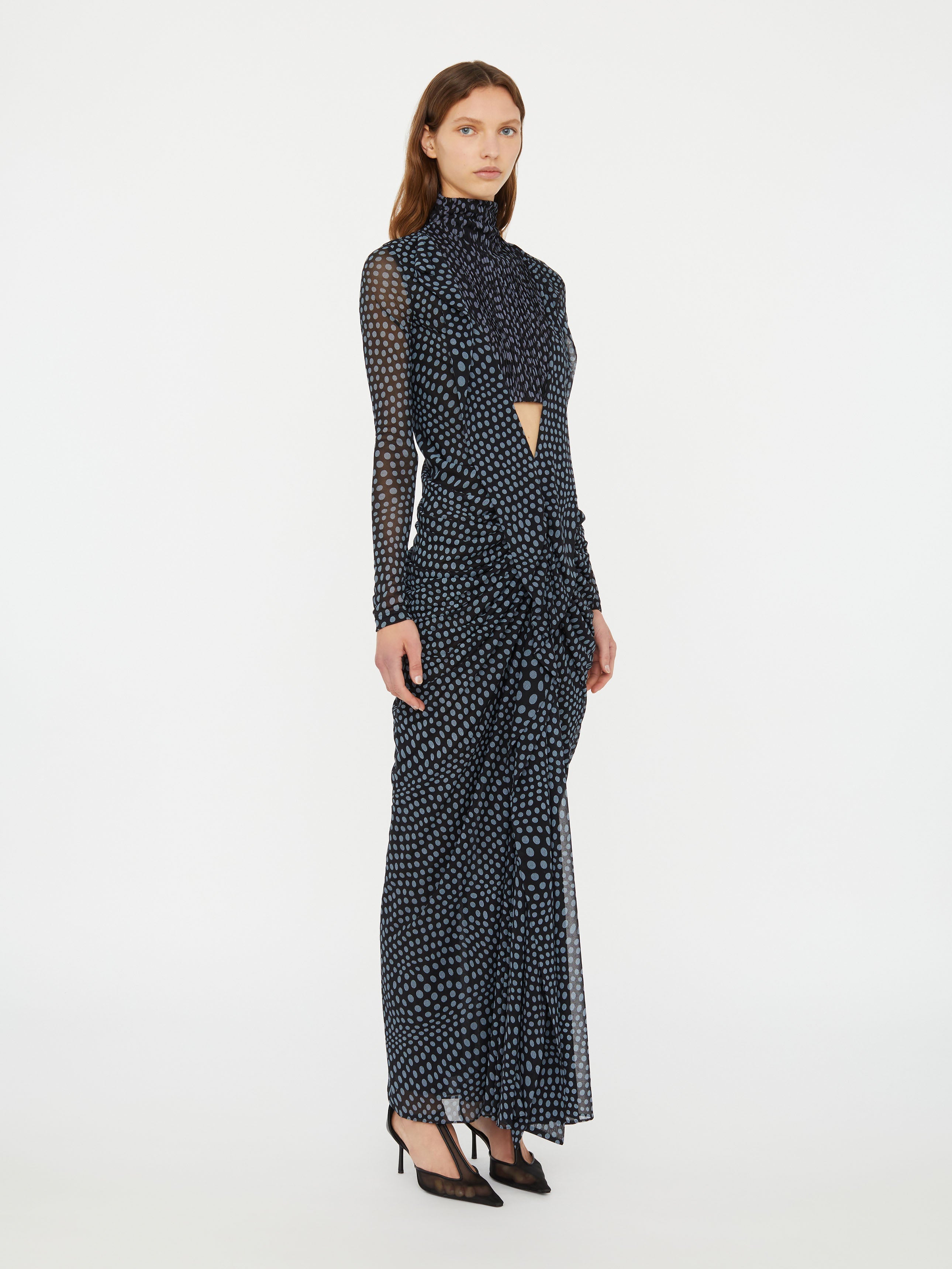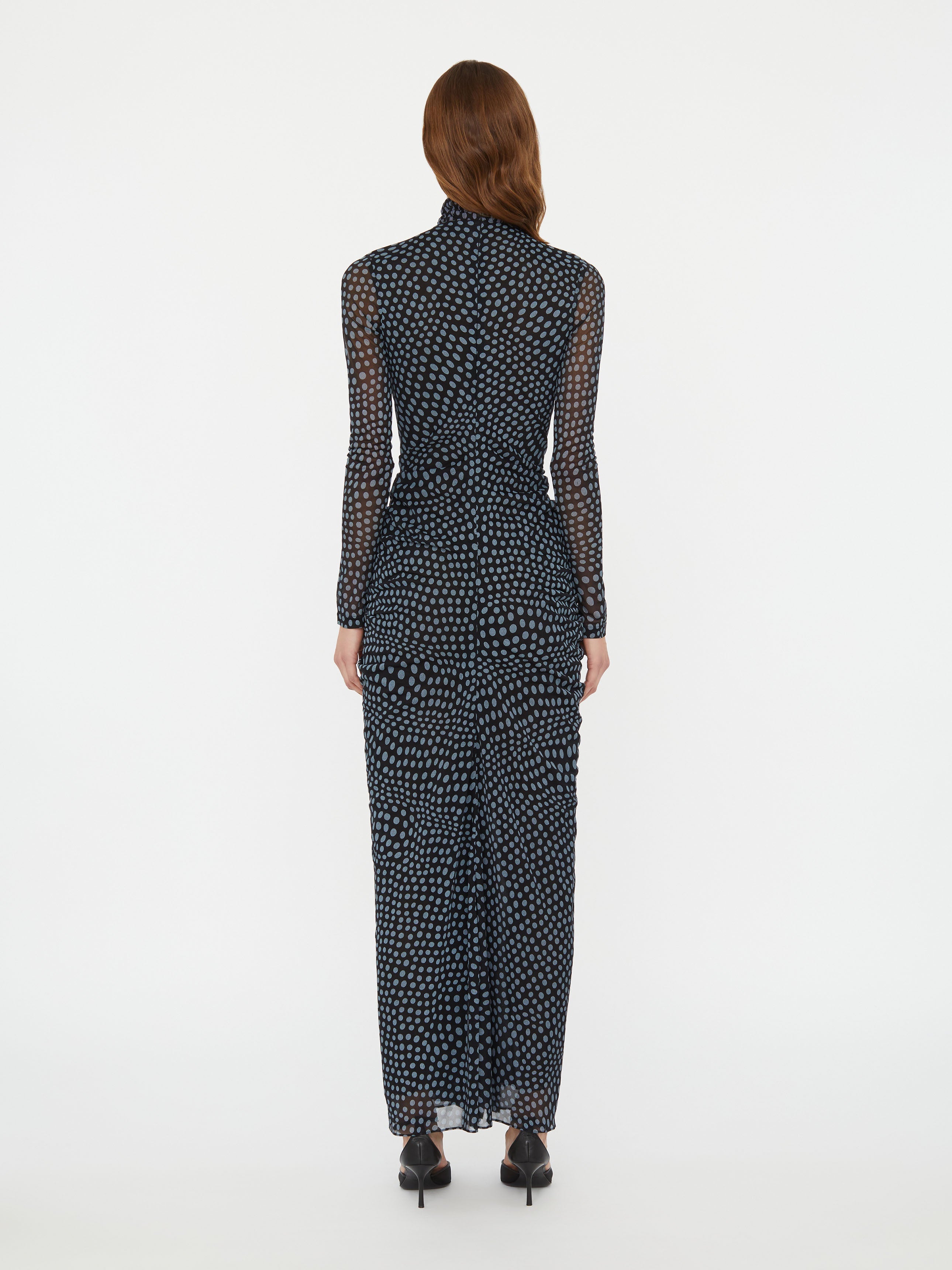 Blue on black warped polka dot print channels low-tech 90s and the subtle chaos of a summer rain shower. Warped dot print is gathered, tucked and cinched to distortion in these lavishly draped maxi dress. Cascading drapes amplify dimension and movement.