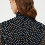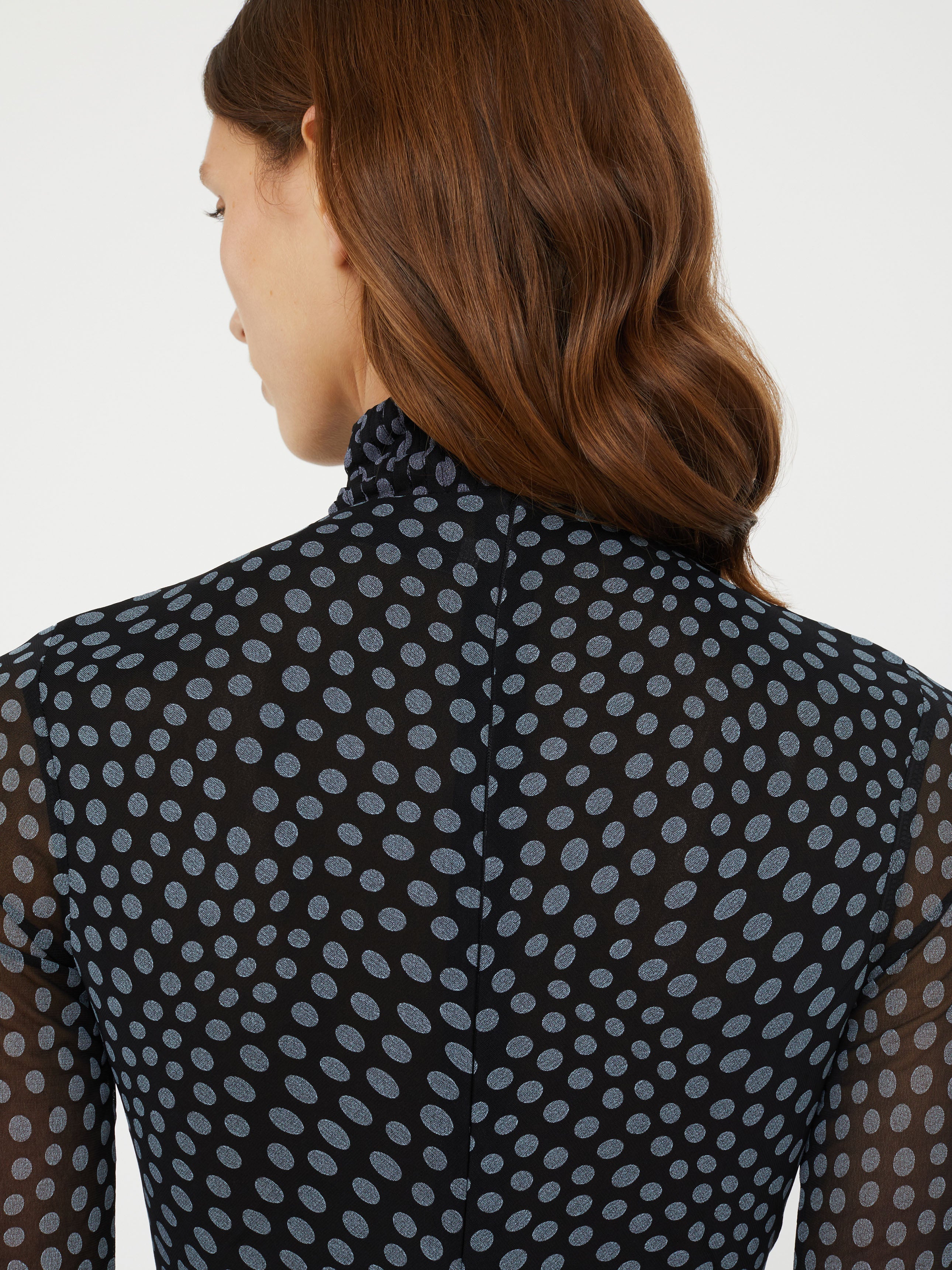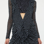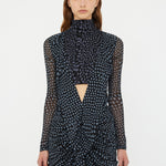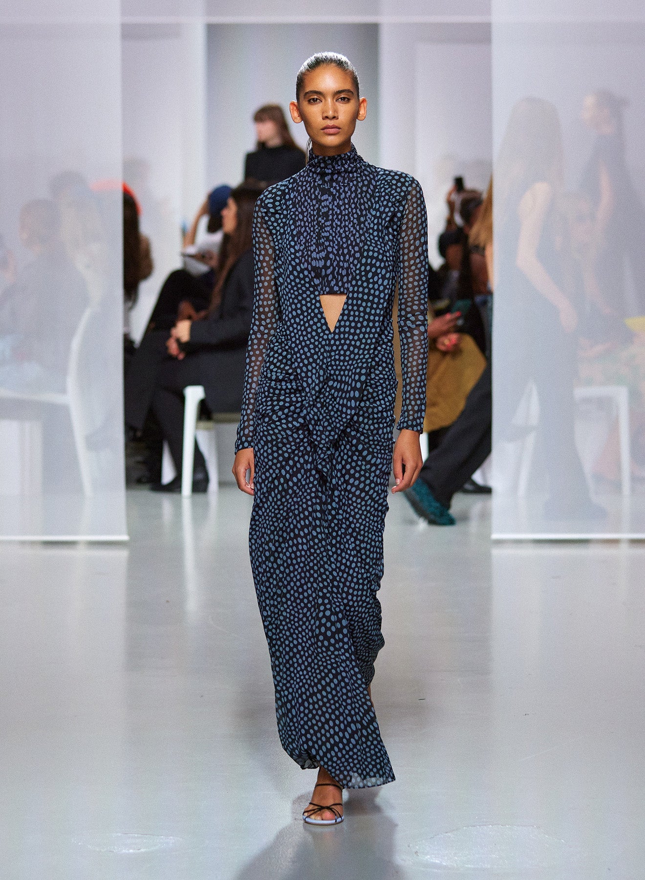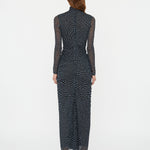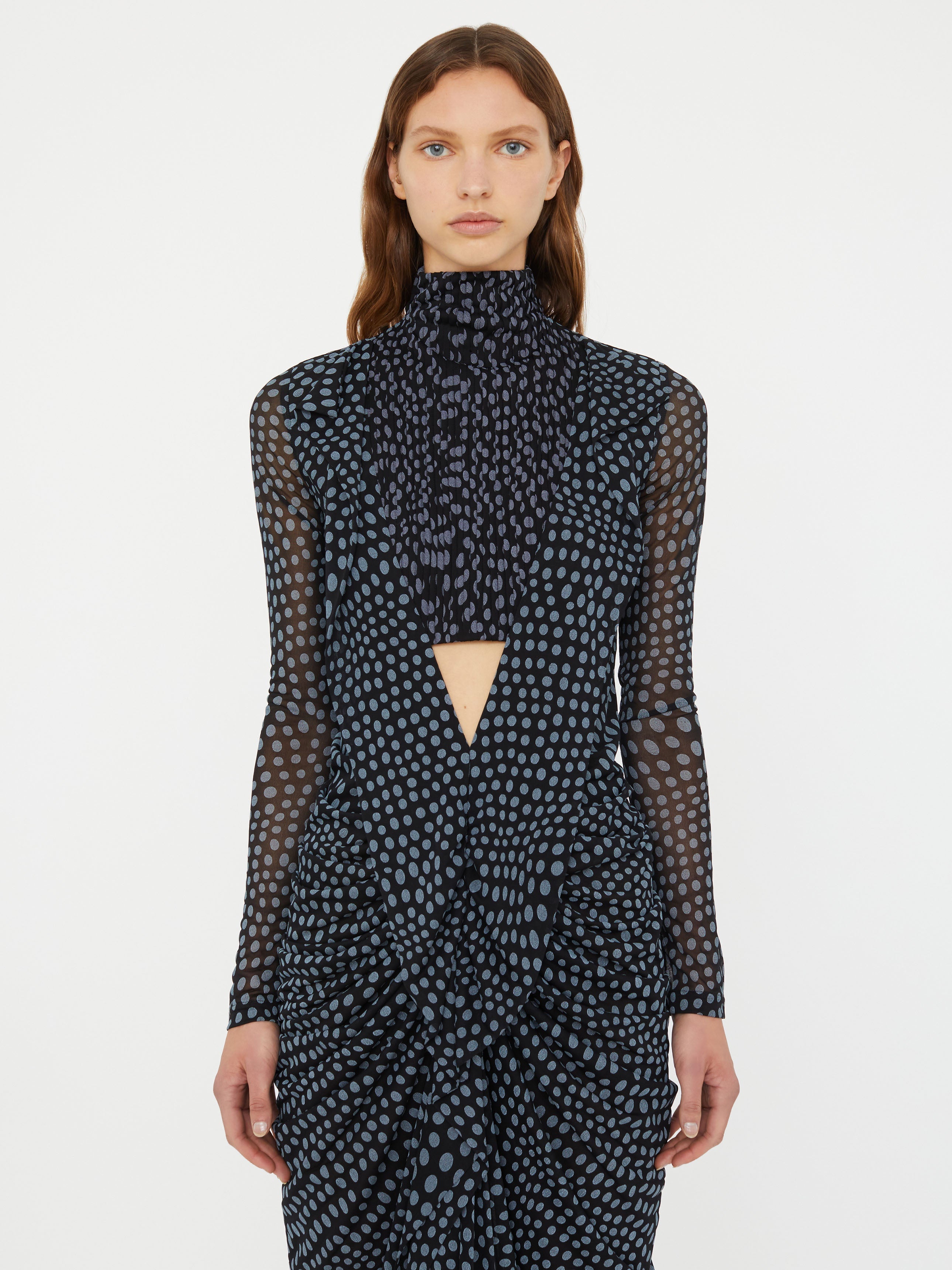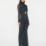 Blue on black warped polka dot print channels low-tech 90s and the subtle chaos of a summer rain shower. Warped dot print is gathered, tucked and cinched to distortion in these lavishly draped maxi dress. Cascading drapes amplify dimension and movement.