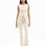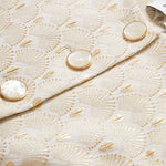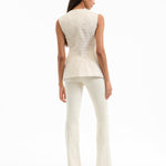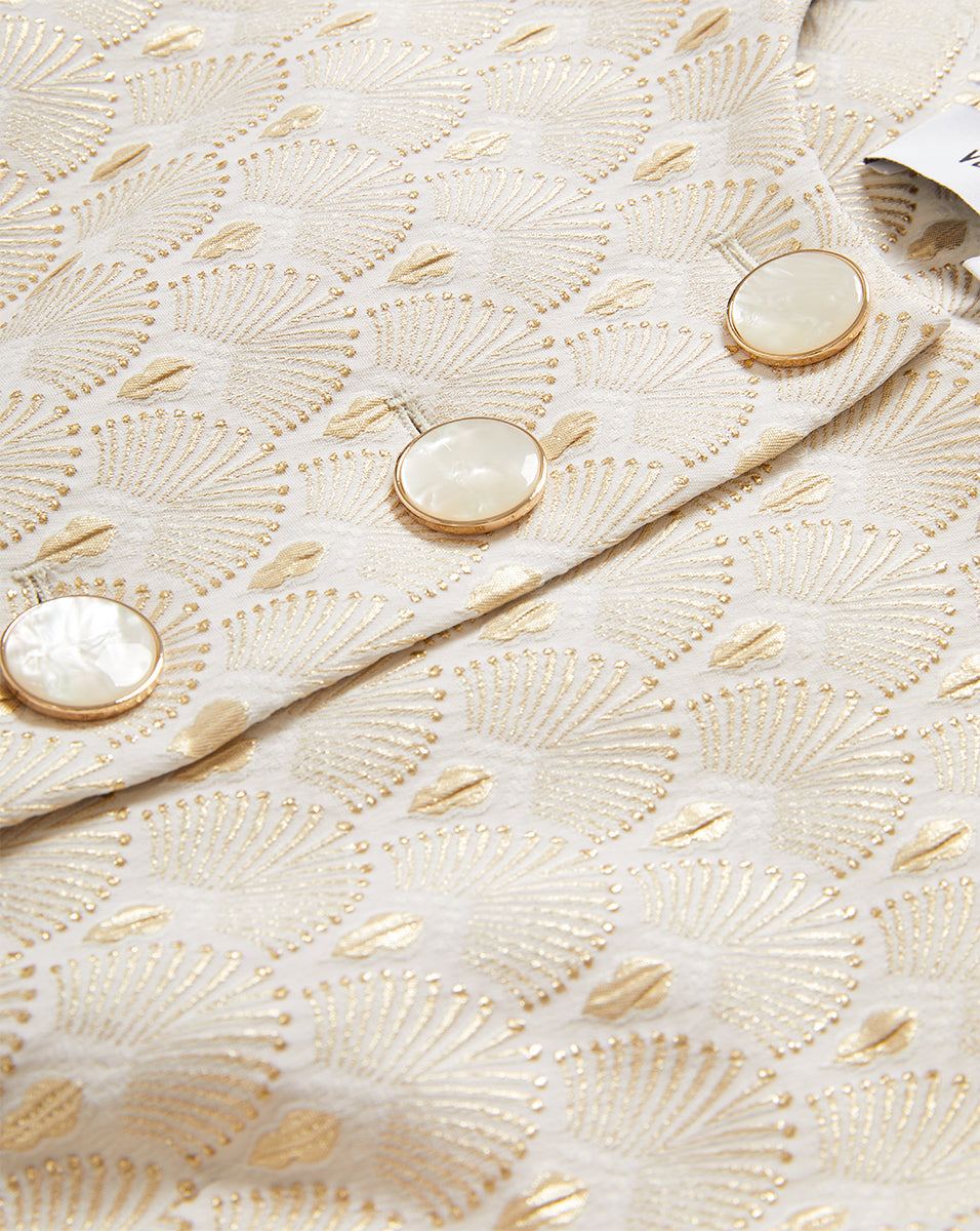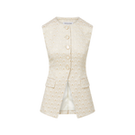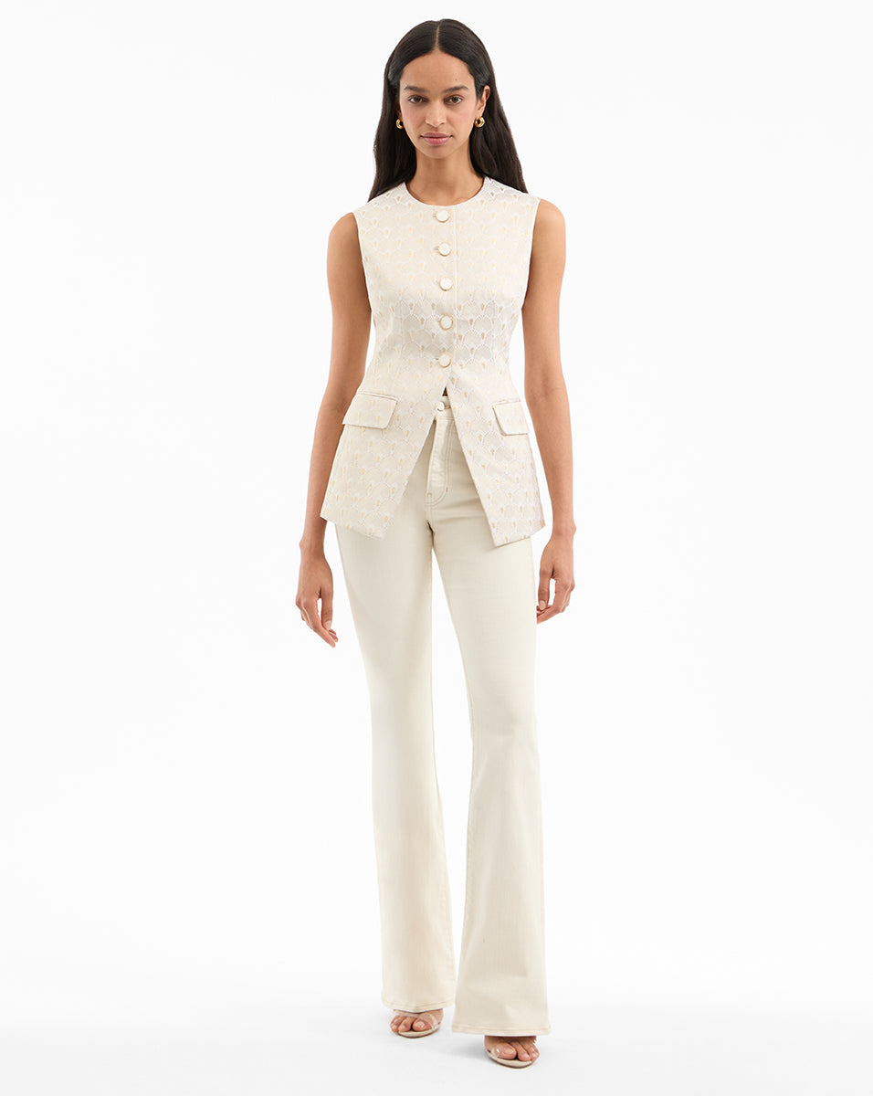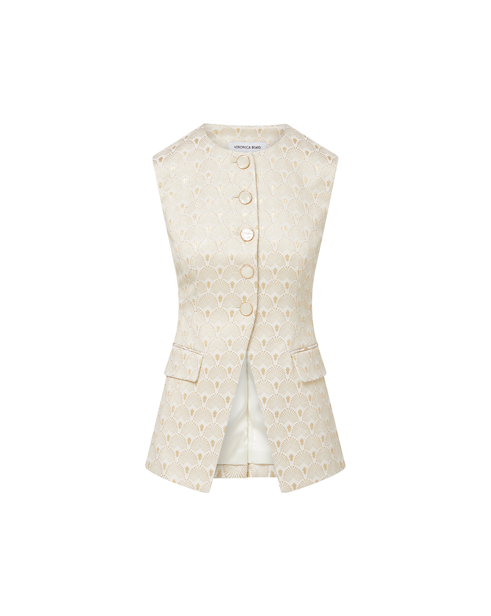 A fashion-forward take on the vest. Expertly tailored from a premium stretch blend, the Lois top boasts a chic Art-Deco-like scallop pattern—in metallic gold—and an exaggerated cutaway hem. With a clean, slim silhouette and darting at the bodice for waist definition, this style is great on its own or as a top layer. Pair with the coordinating Jazmin short for a memorable matching-set moment.