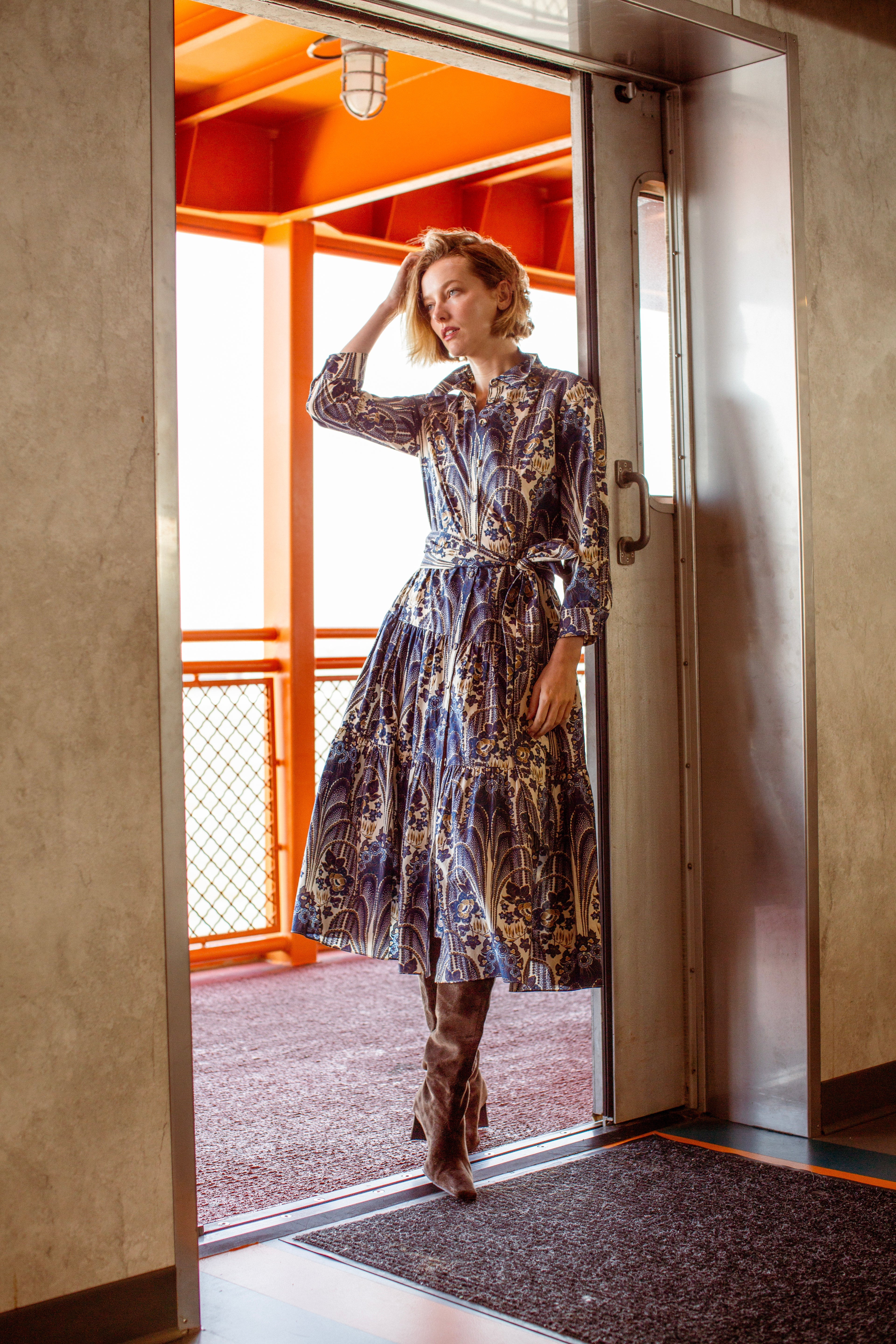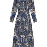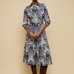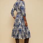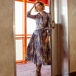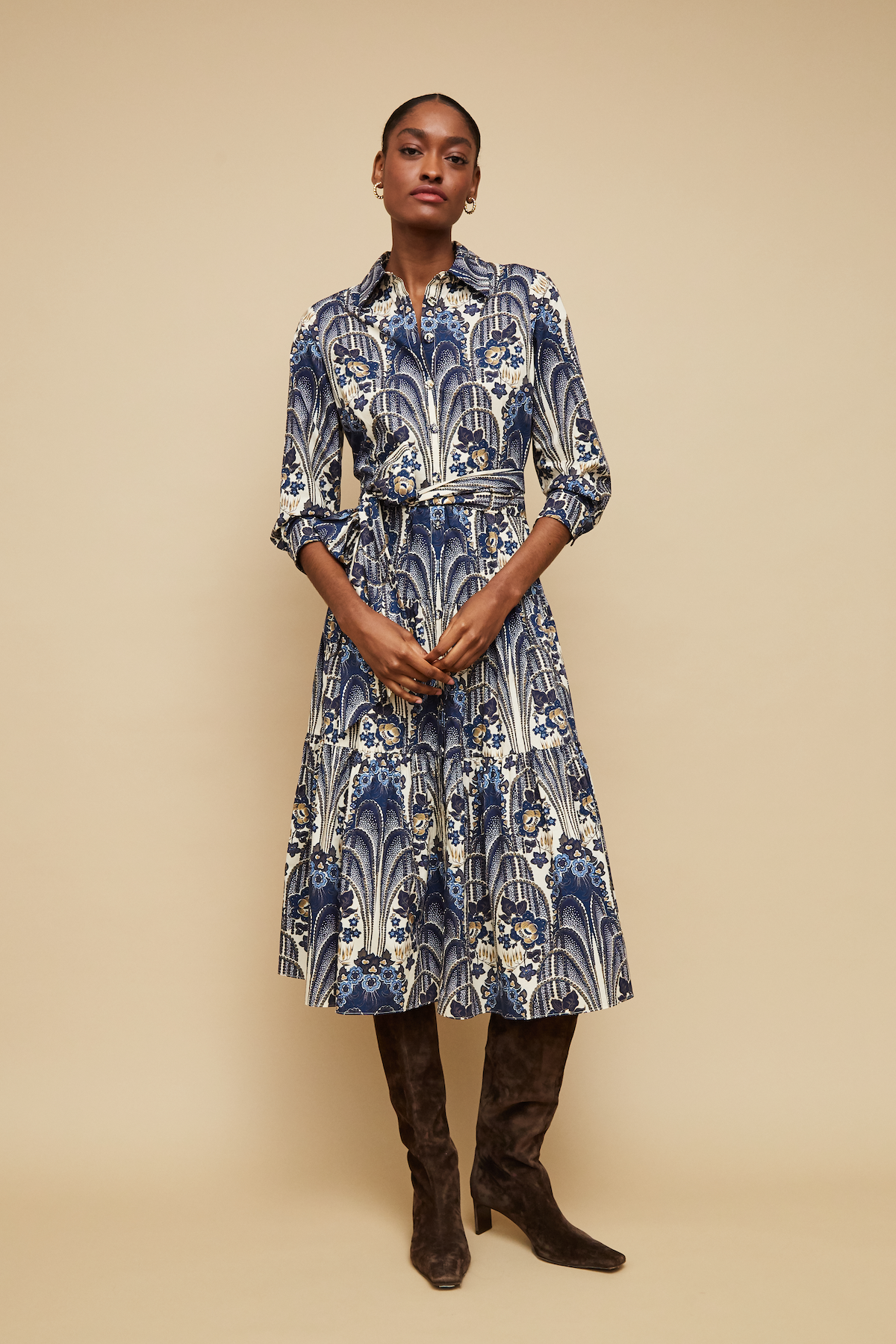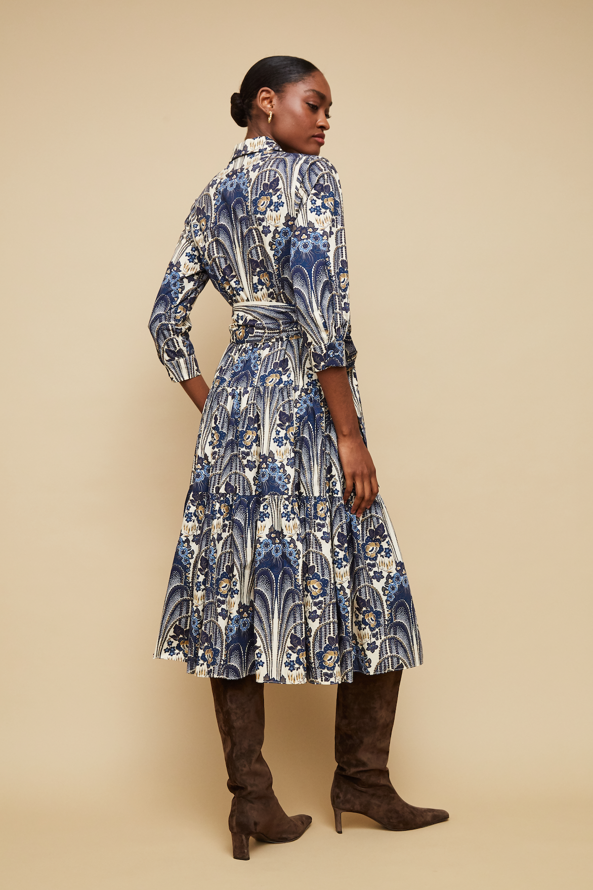 The Lolita Dress reimagines the shirtdress in an intricate print. Cascading tiers start at the waist adding a structural spin to this festive, collared midi. A wide, removable sash offers styling versatility.