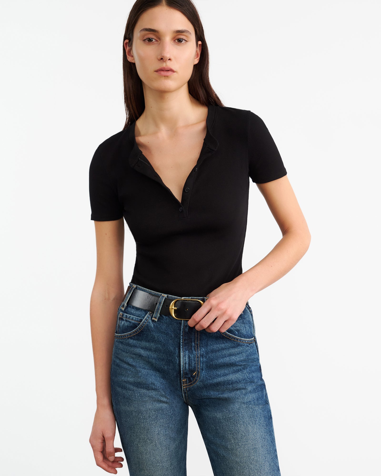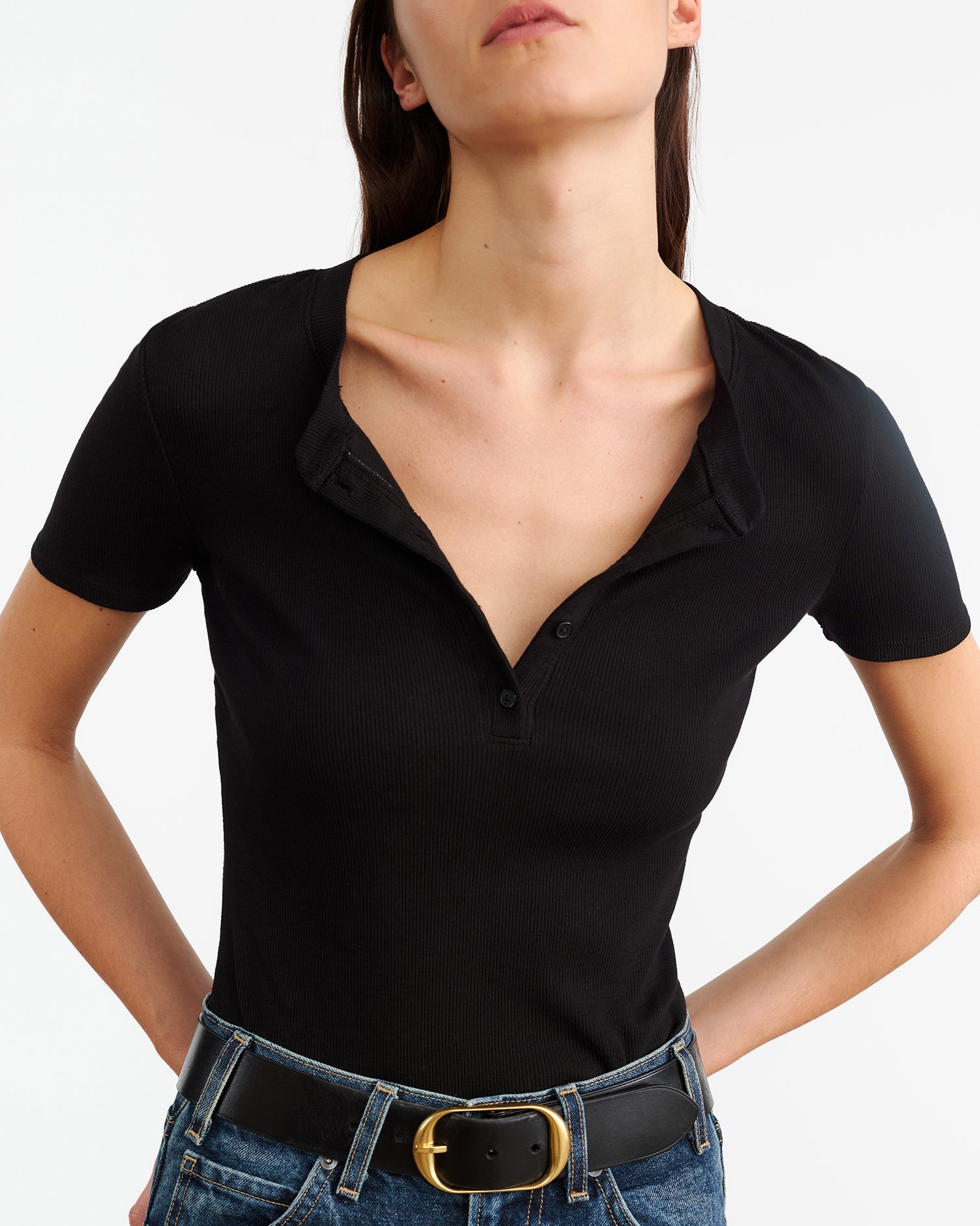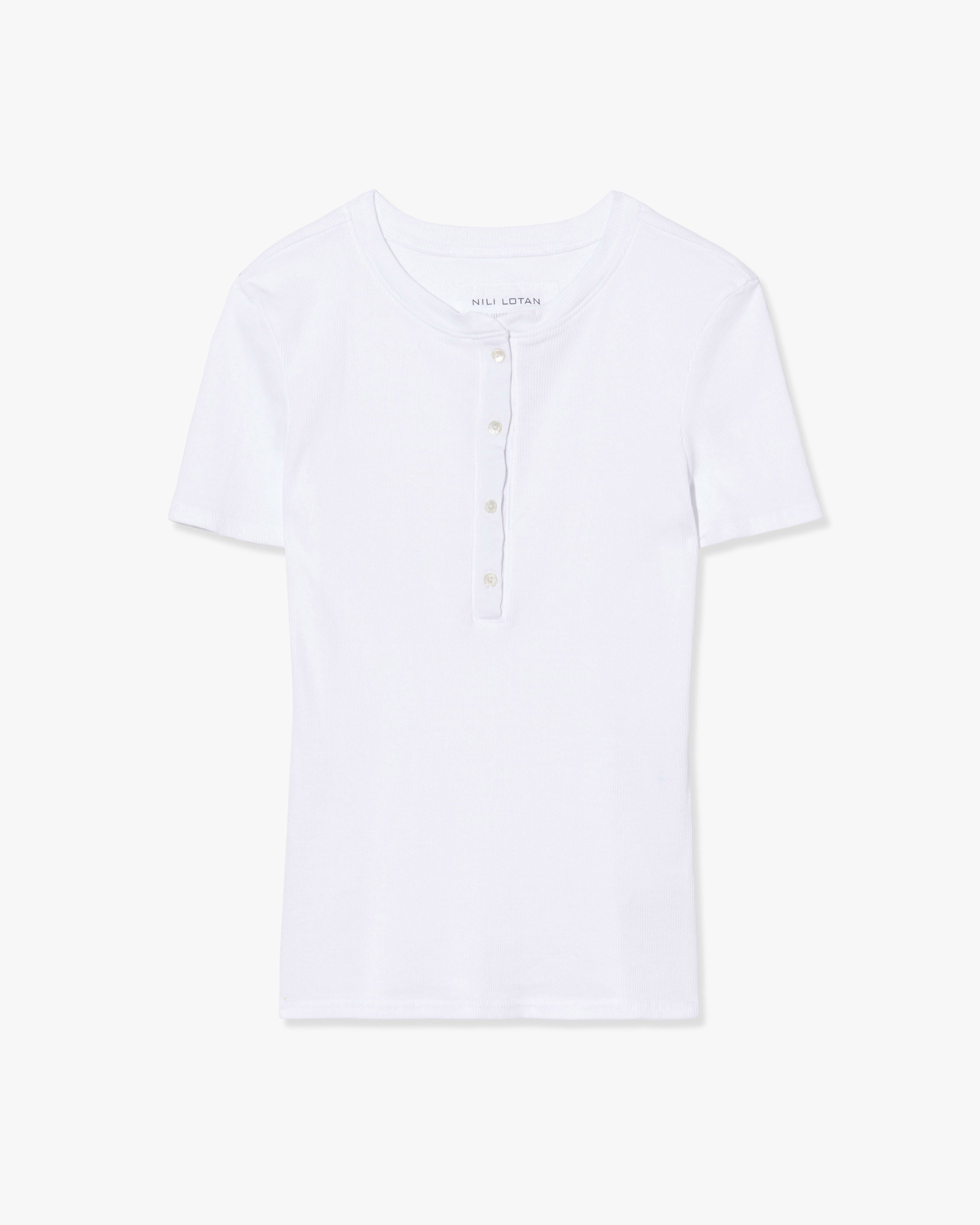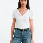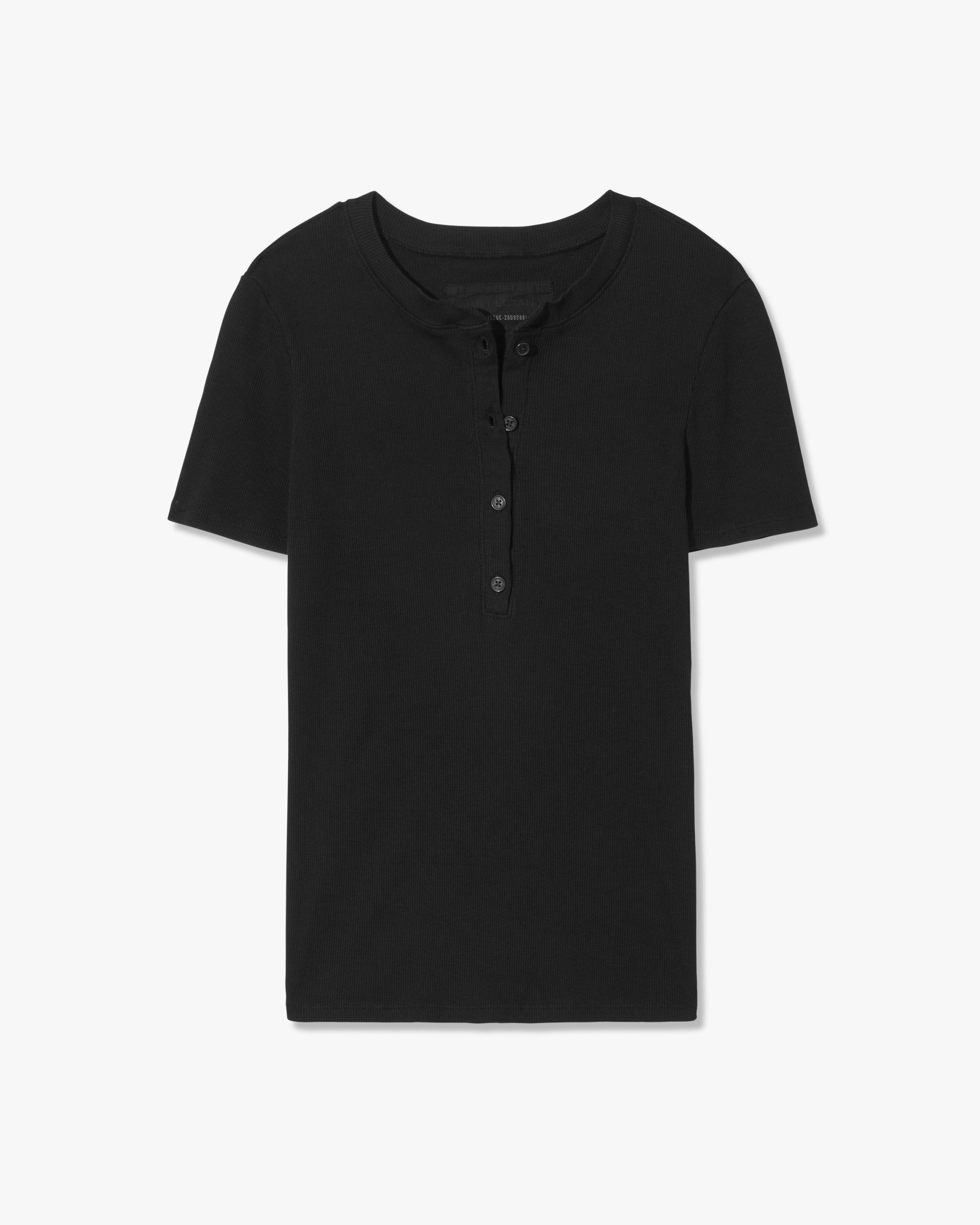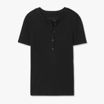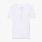 Slim rib short sleeve henley tee. Five center front buttons. Short vintage sleeve. Neck and placket finished with self trim.