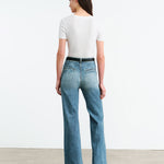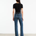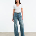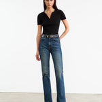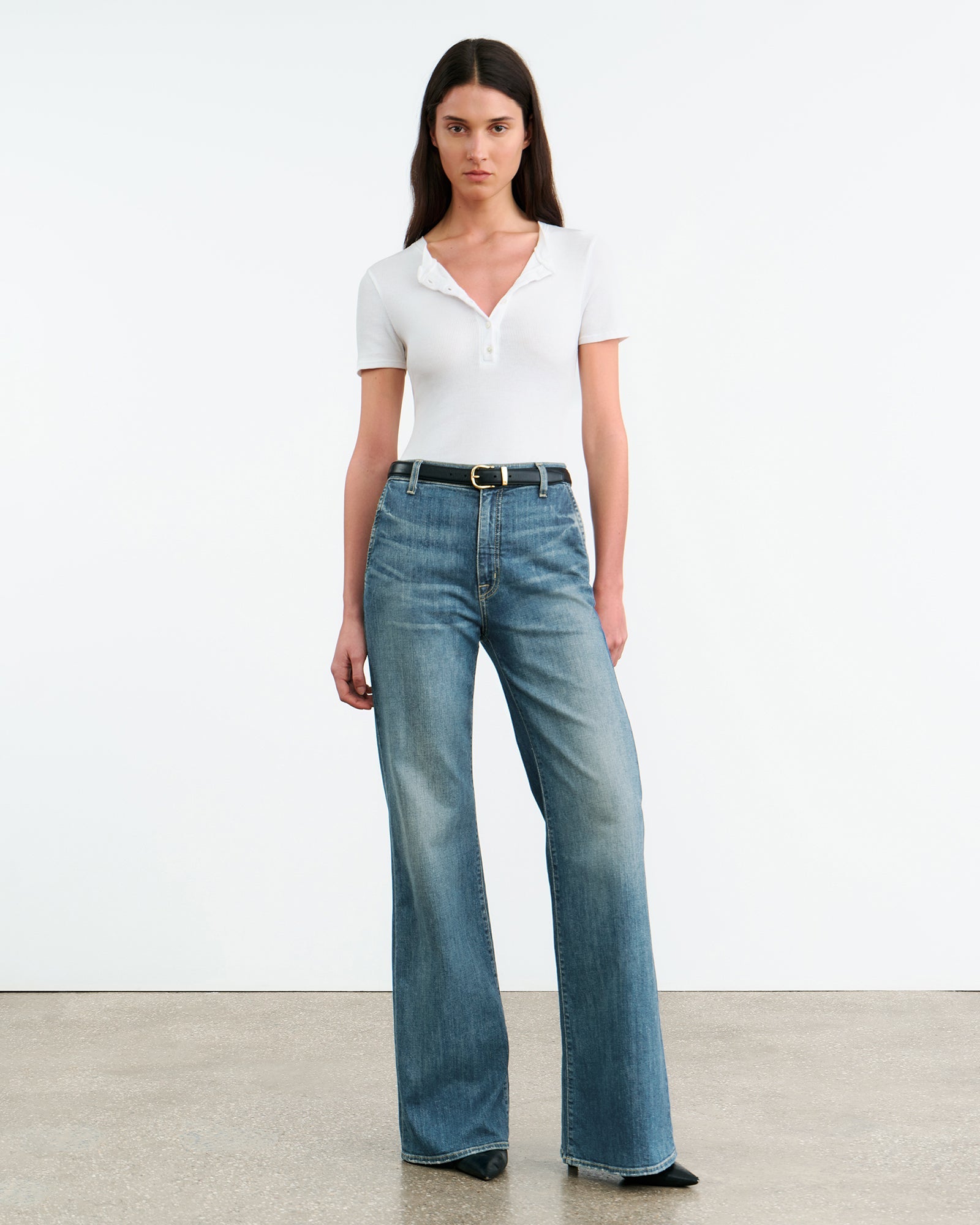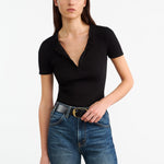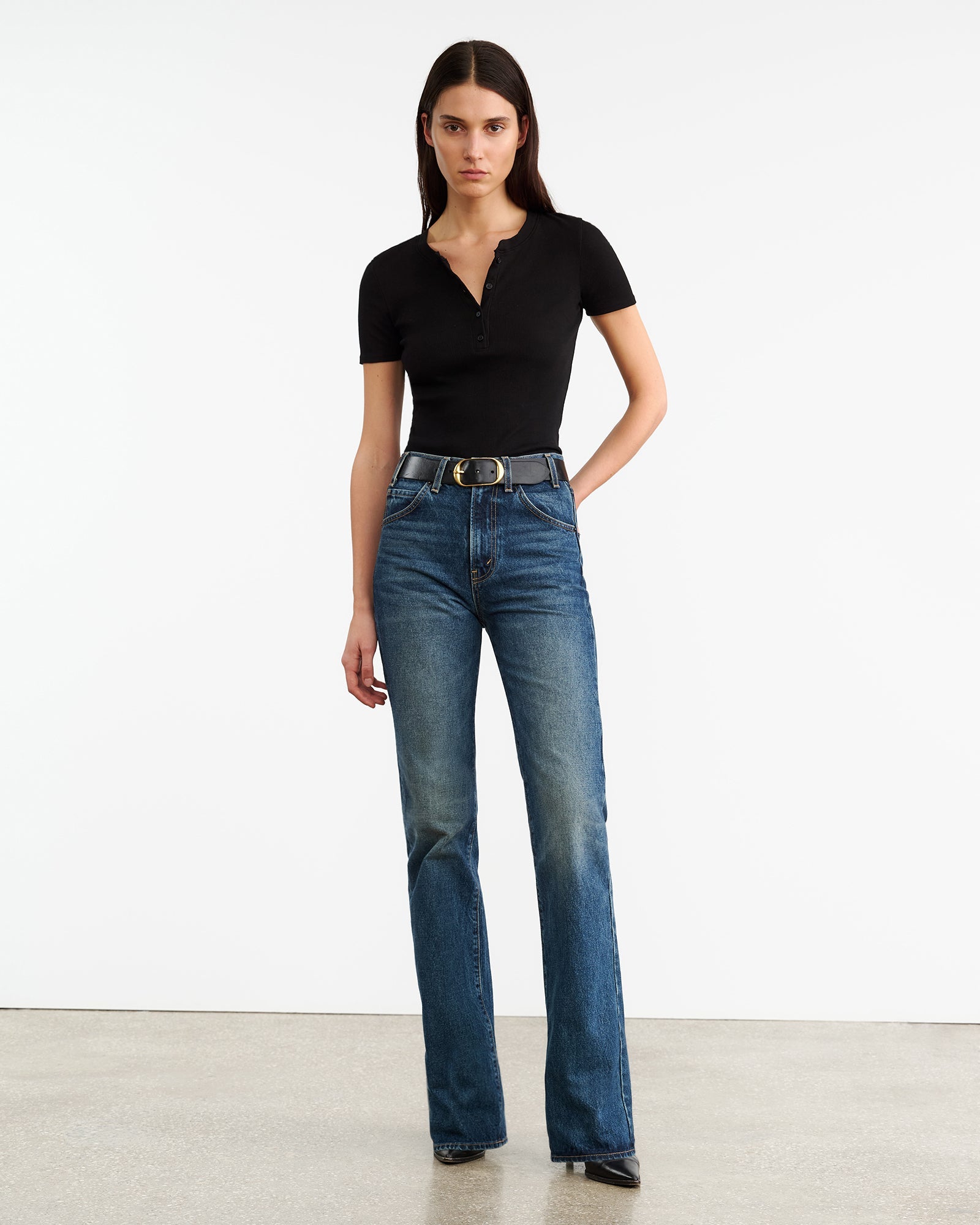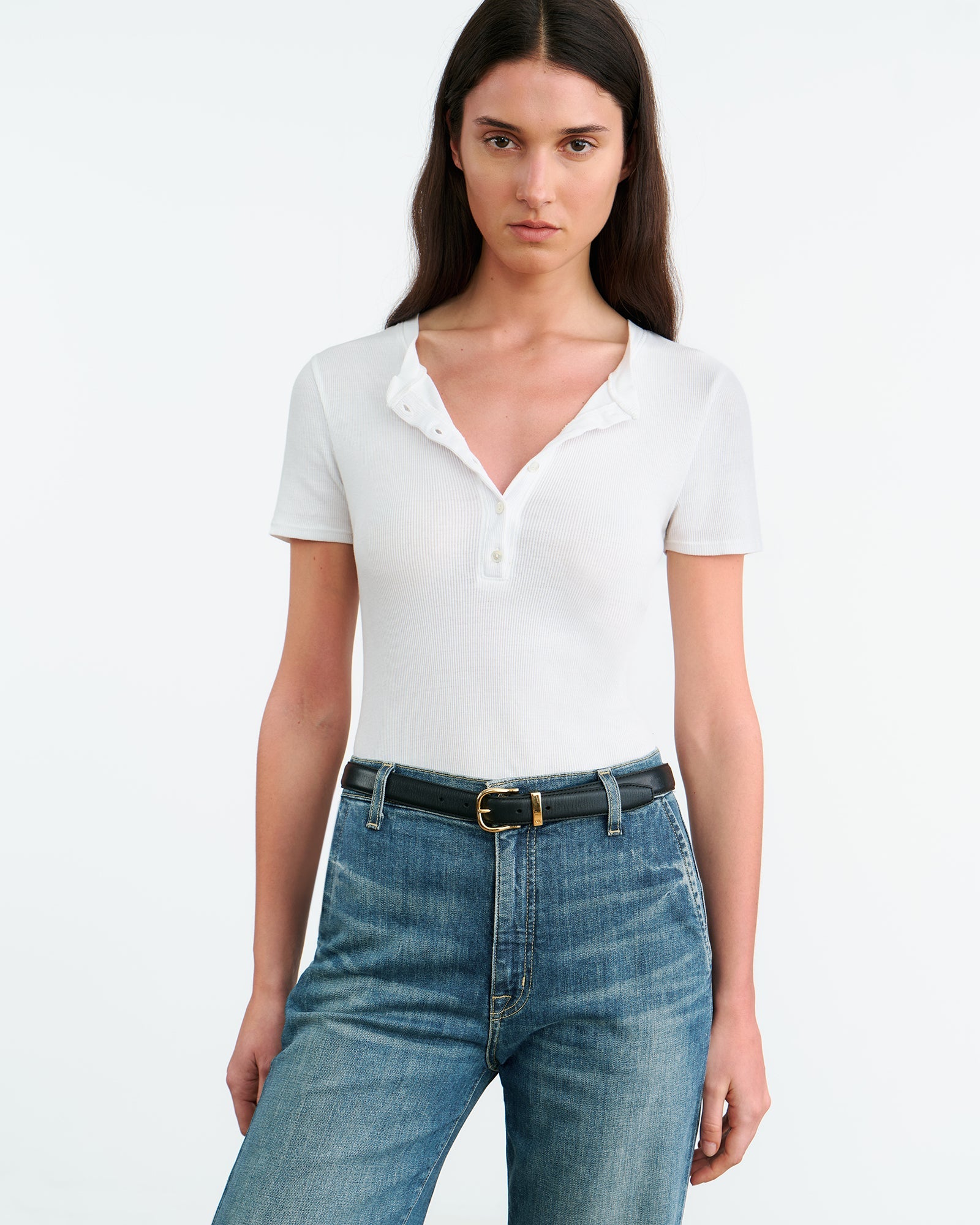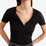Slim rib short sleeve henley tee. Five center front buttons. Short vintage sleeve. Neck and placket finished with self trim.