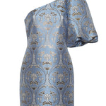 The Lucia Mini Dress in our in-house developed custom jacquard stars an asymmetric, one shoulder neckline, bubble sleeves and is designed in a sheath silhouette. The extremely flattering, mini dress features side slits at the bottom for an easy, comfortable fit.