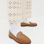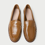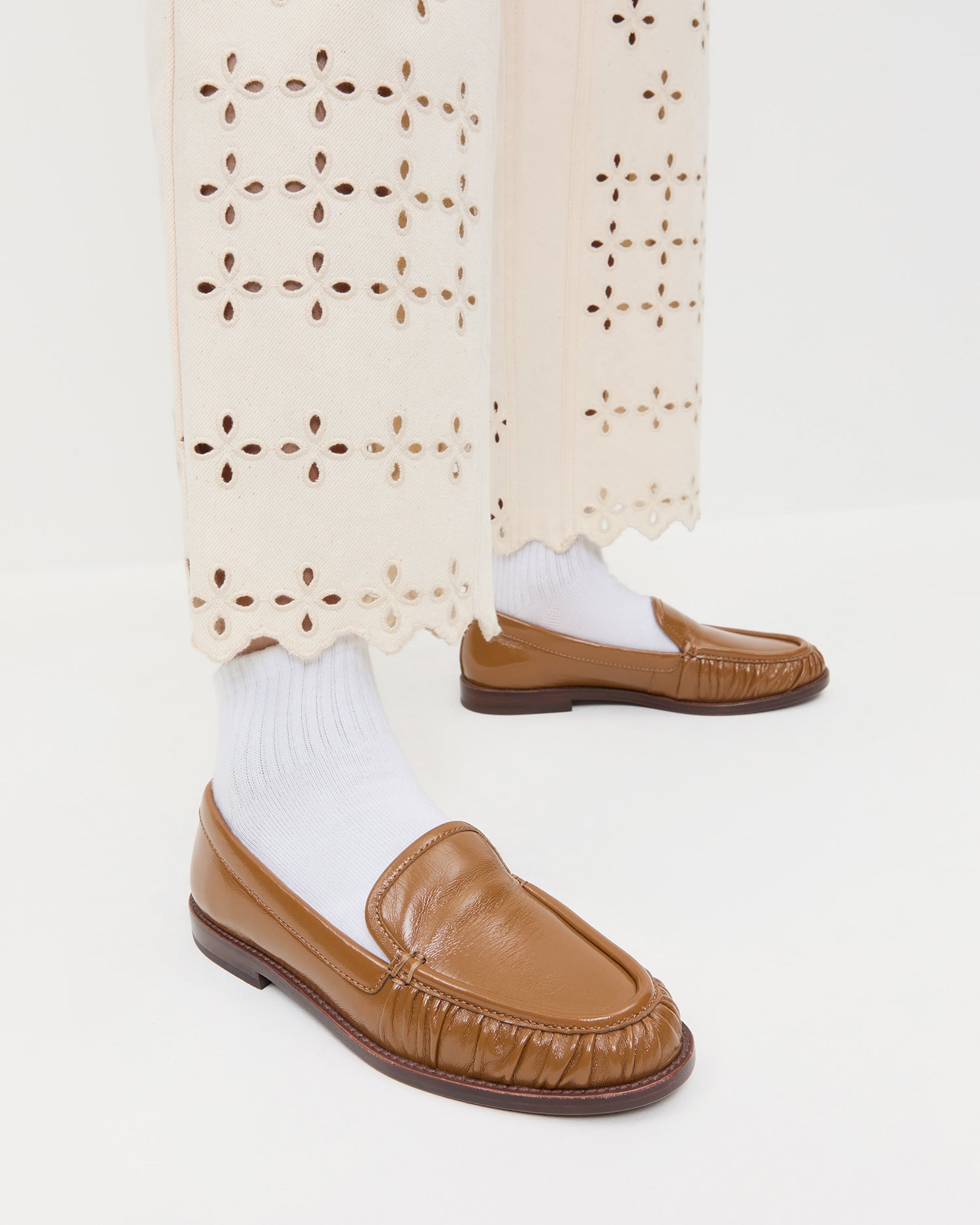 Loafer in patent safari nappa leather. Features a rounded toe, gathered leather details, visible stitchwork at the seams, a padded leather footbed with gold stamped logo and a slip-on design.