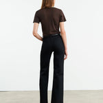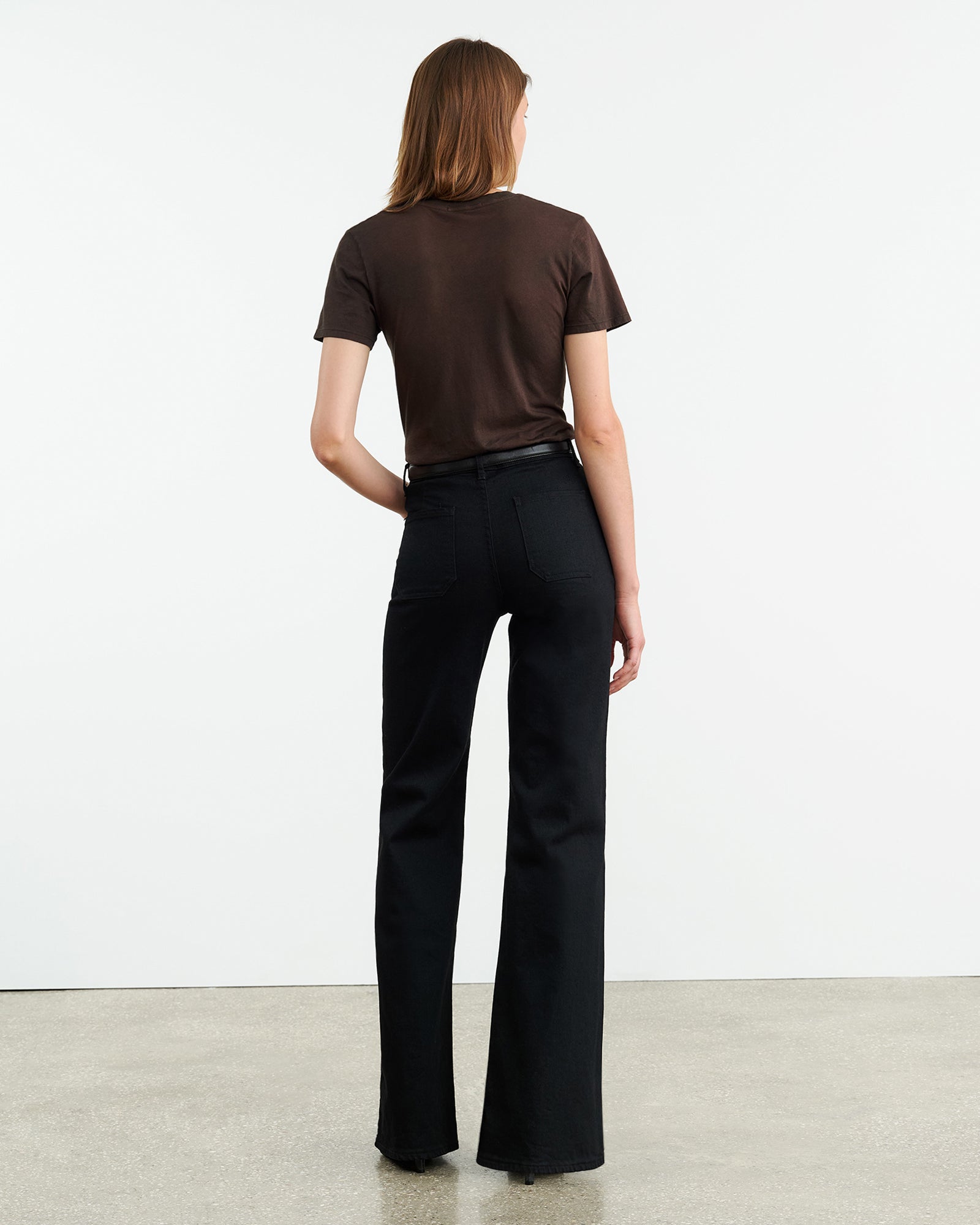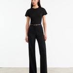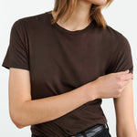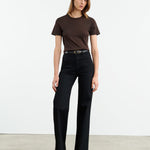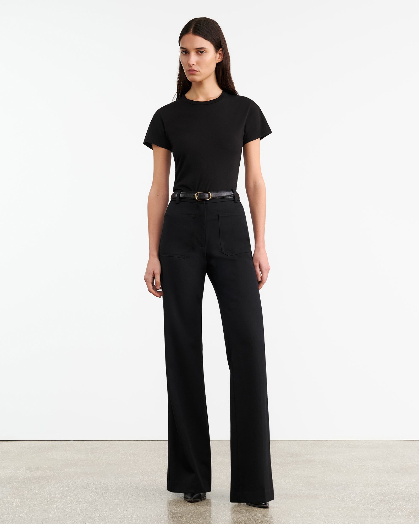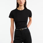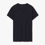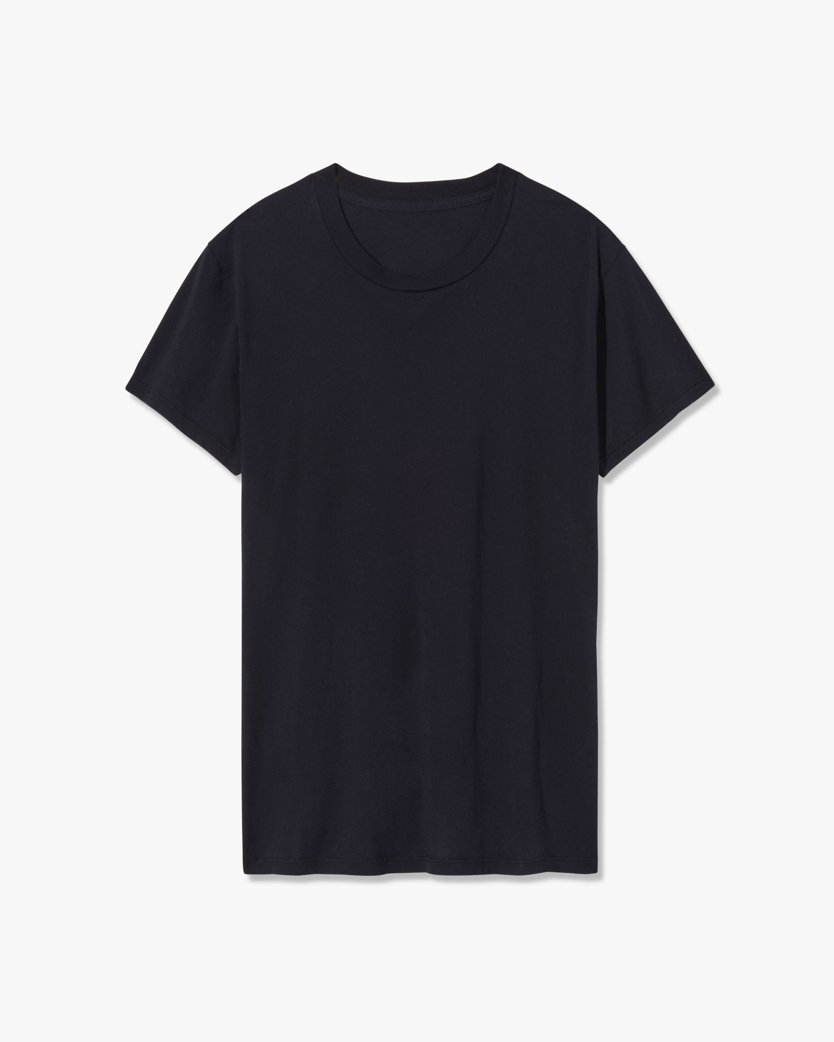 Slim crewneck tee. Higher collar. Smaller neck opening. Slightly shorter body. Vintage pitched sleeve.