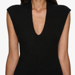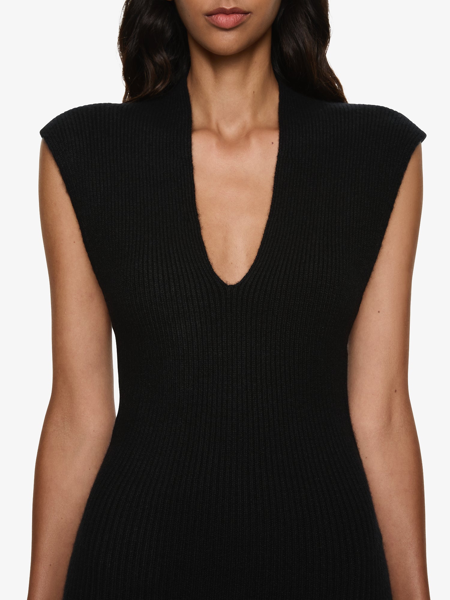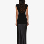 An evolution of signature house knitwear, the Moulded Scarf Monument Dress contrasts a structured ribbed bodice with the fluid drape of a satin skirt. The deep V neckline is framed by sculpted shoulder lines, creating a clean, elongated silhouette that falls to a floor-length hem.
