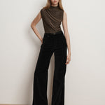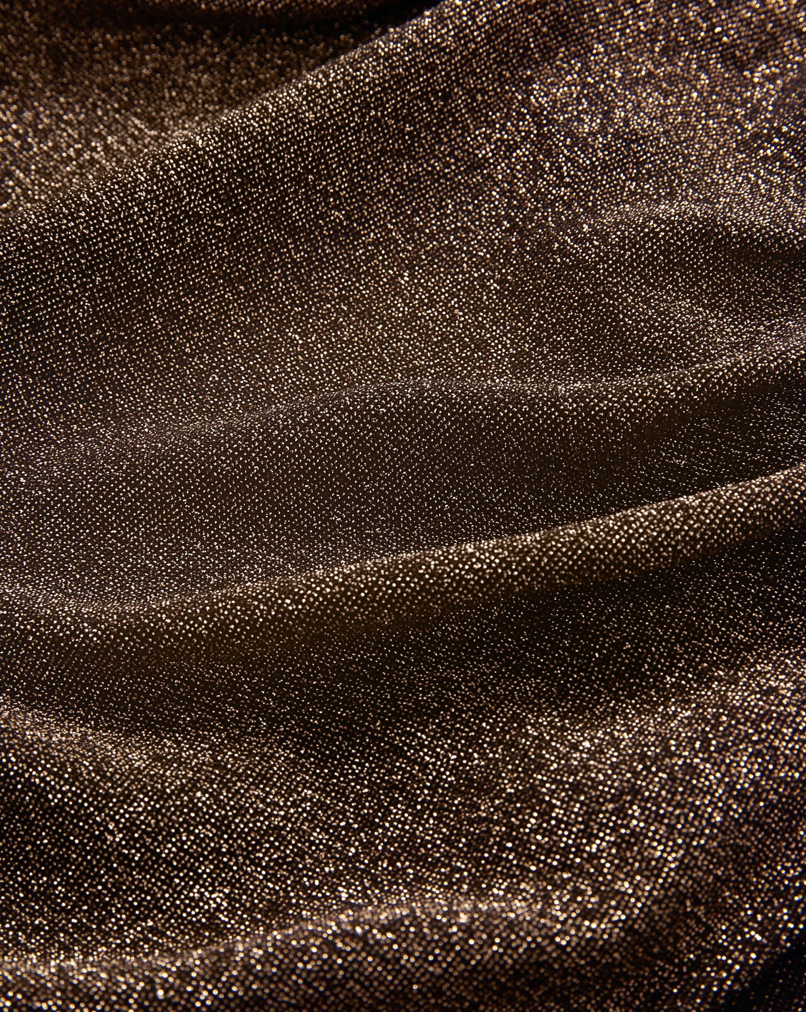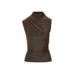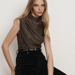 An essential, elevated. Crafted from a stretch blend in striking metallic gold, the Mylie reimagines the classic tank with a mock neck and gentle side ruching. Endlessly versatile—wear it with the coordinating pants for a statement set or pair with jeans for a more laid-back look.