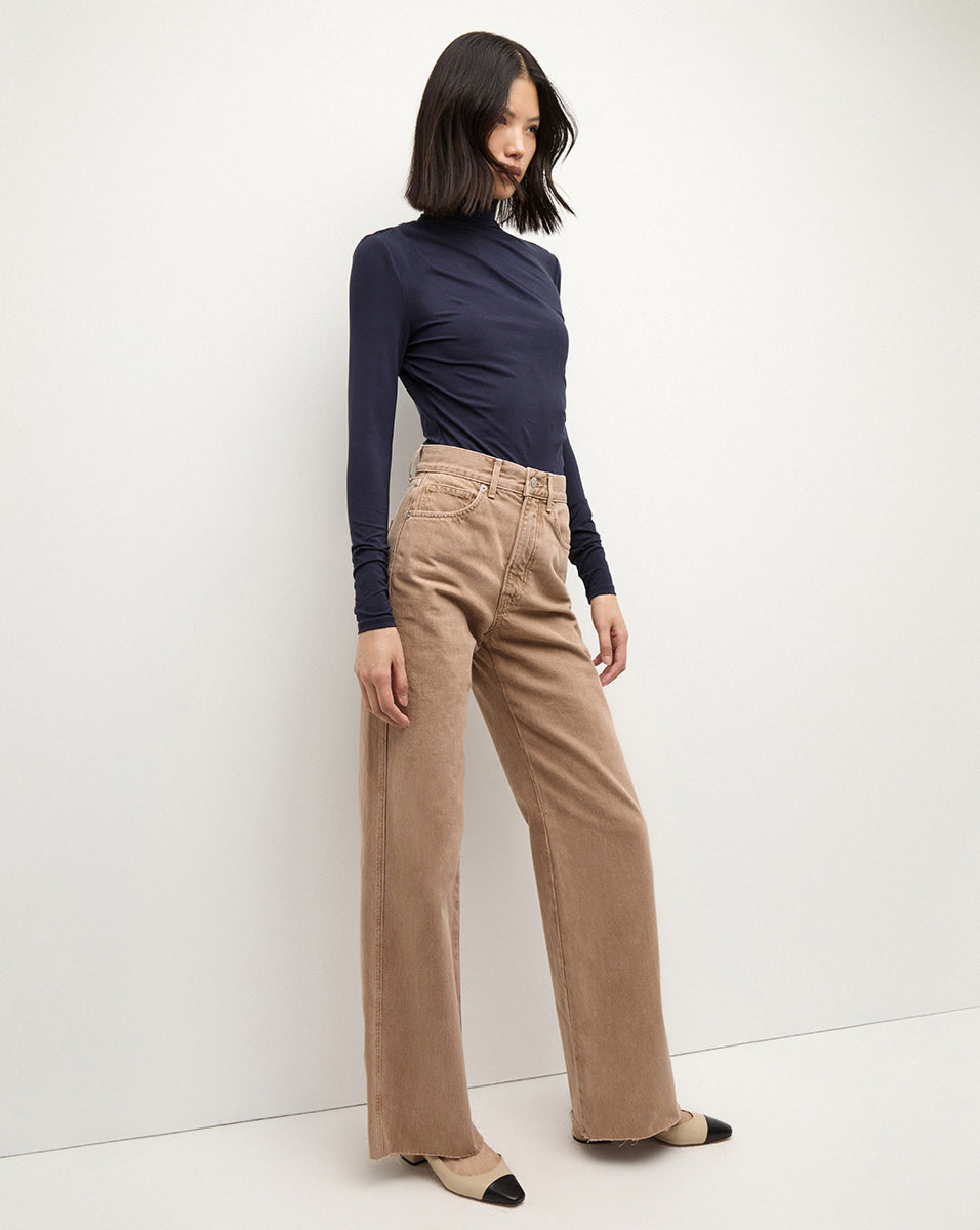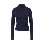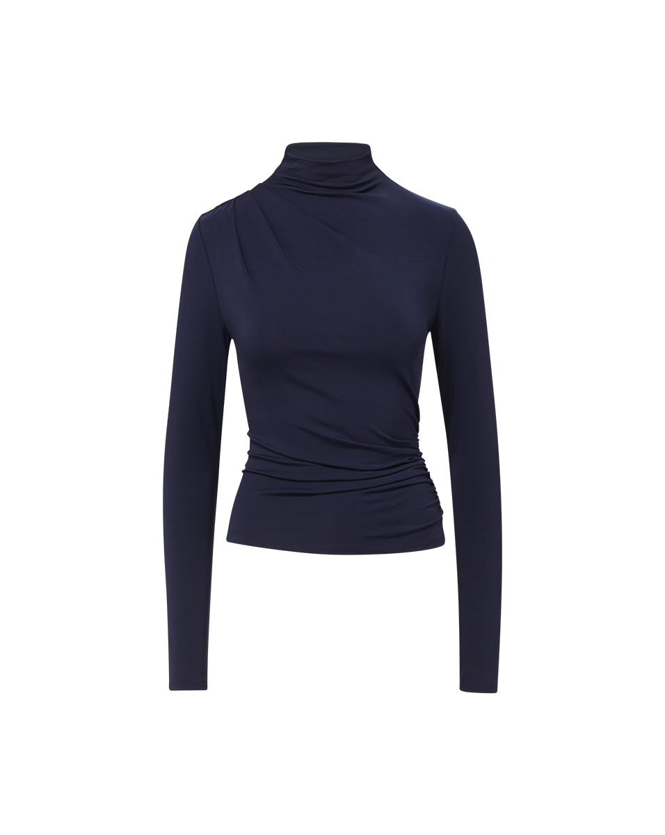 An essential, elevated. Made from a soft, silk-like stretch fabrication, the Mylie reimagines the simple turtleneck with gentle ruching on the sides. This is the ultimate foundation piece—dressed up or down, perfect on its own or as a base layer.
