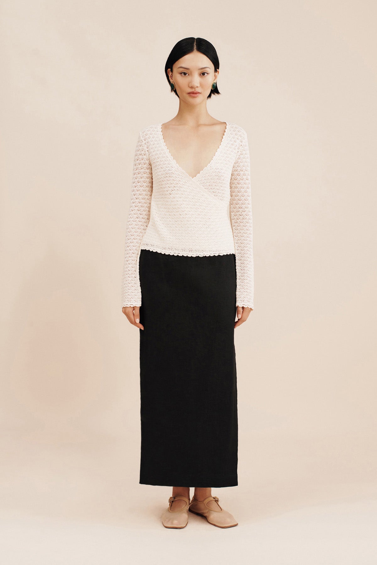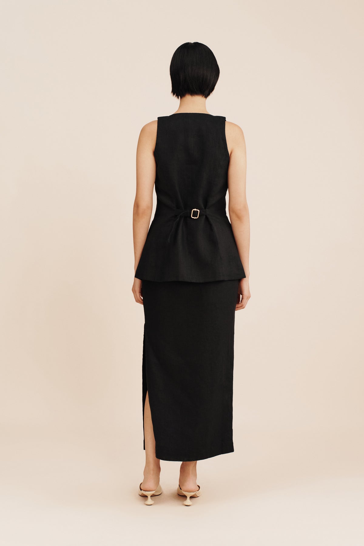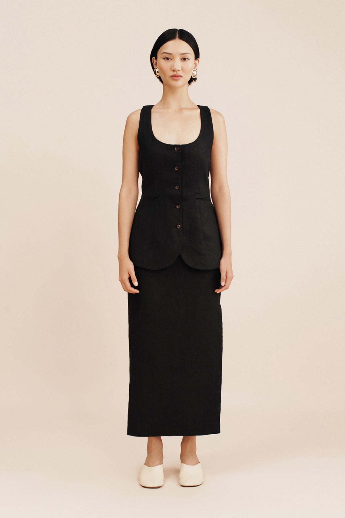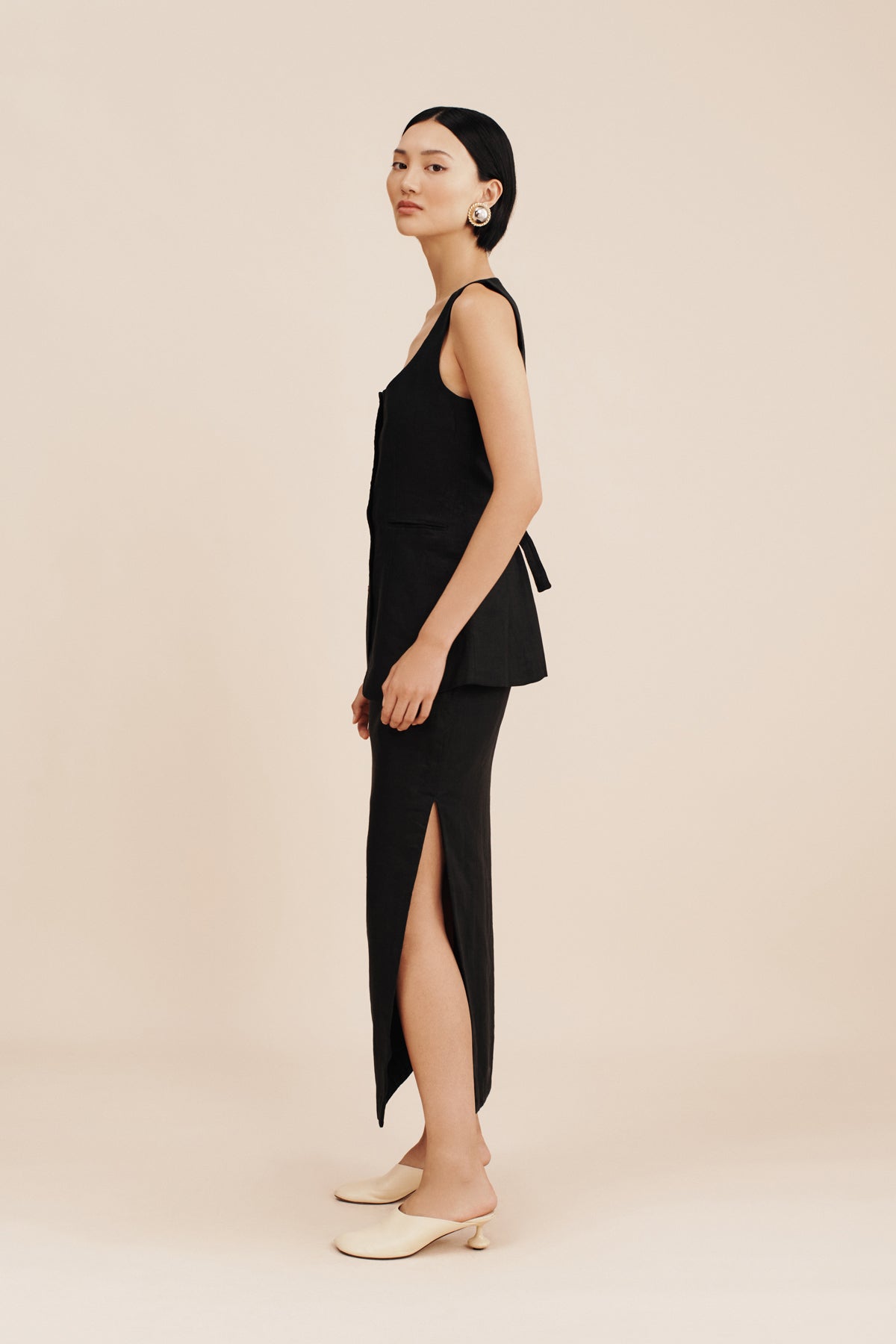 The Nancy Skirt is cut from certified linen in a classic pencil silhouette . Designed to sit high on the waist, it falls to an elegant maxi hem and has a statement split at the side to allow for movement. Style yours as a set with the coordinating Ruben Gilet.