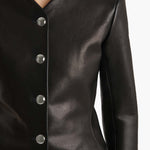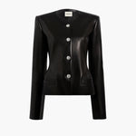A collarless, high-necked jacket shaped by soft peplum contouring and decisive details, including reinforced shoulder pads. Single-breasted silhouette designed for a close, cropped fit. Faux pockets. Cupro twill lining.
