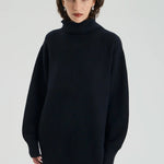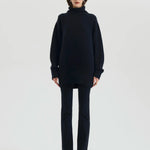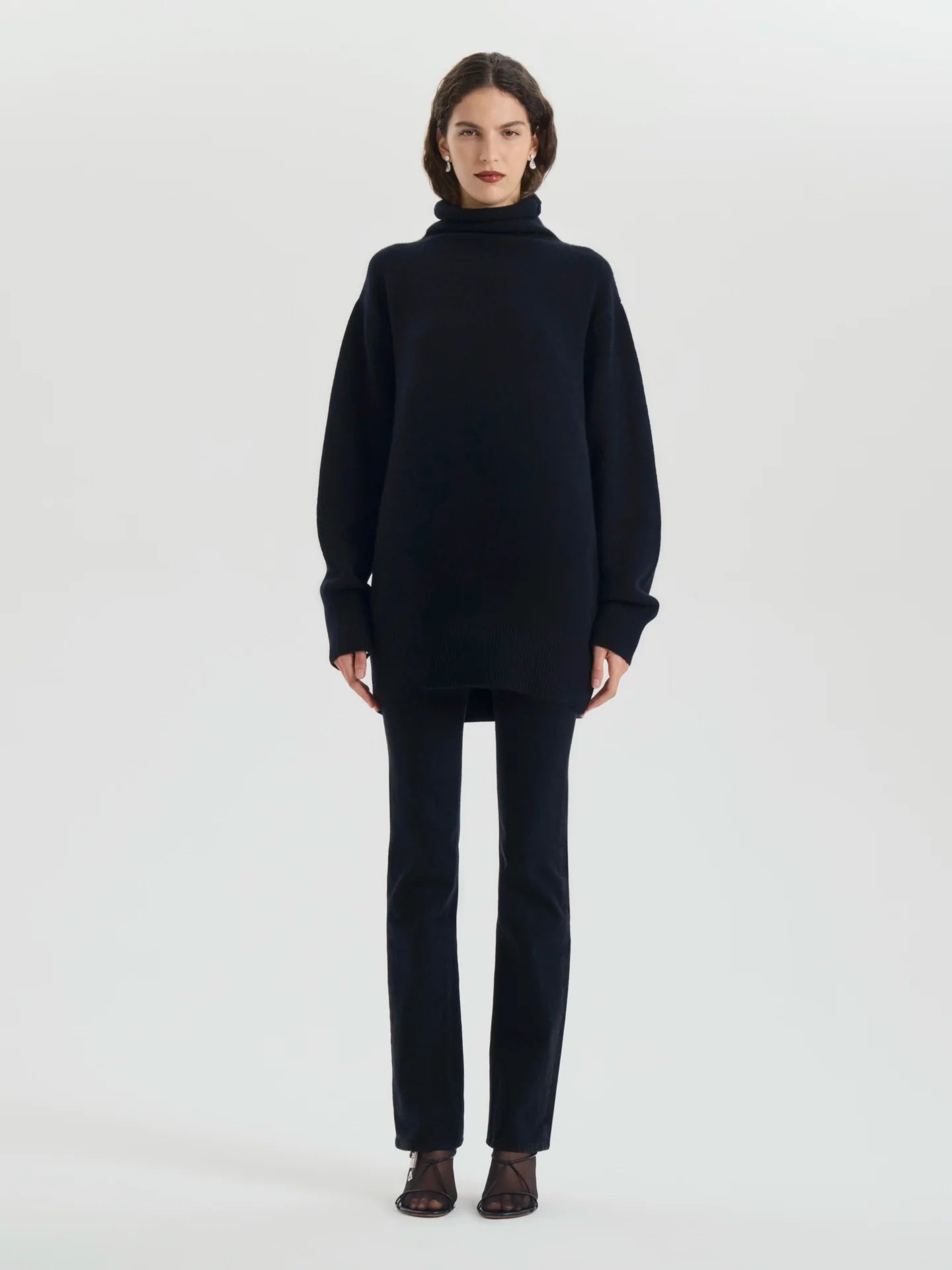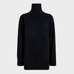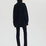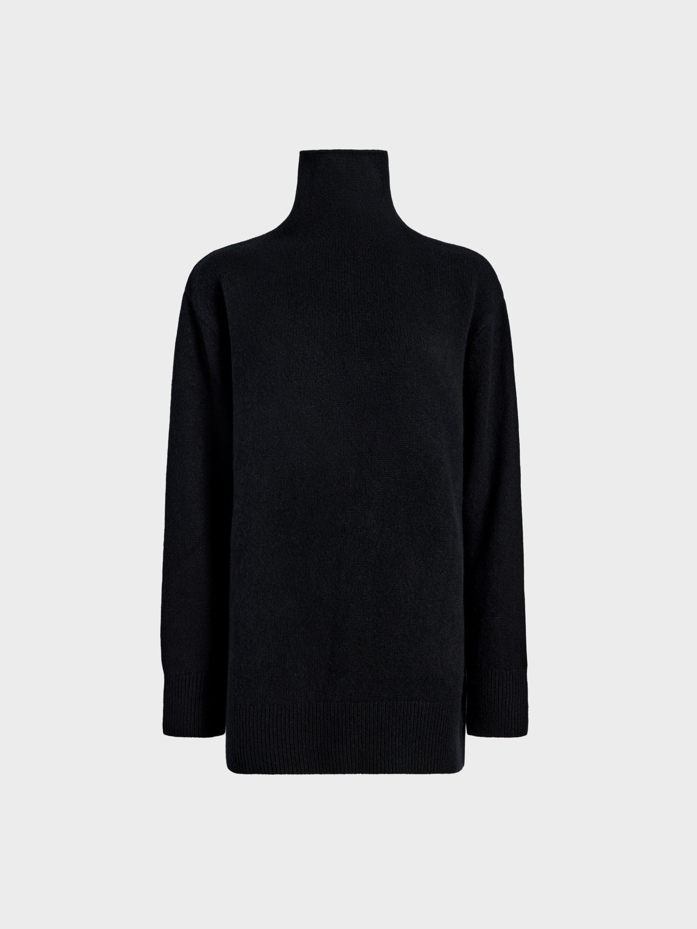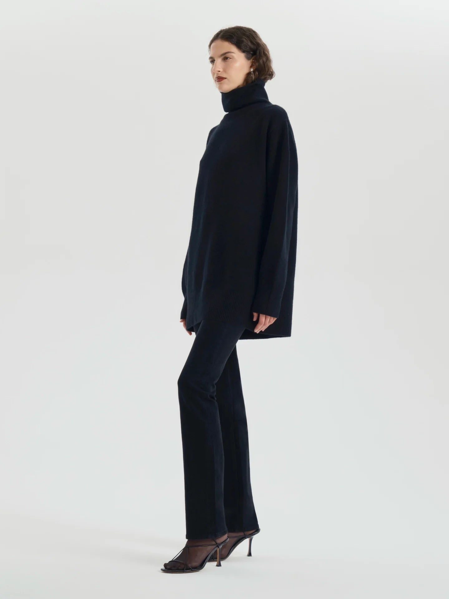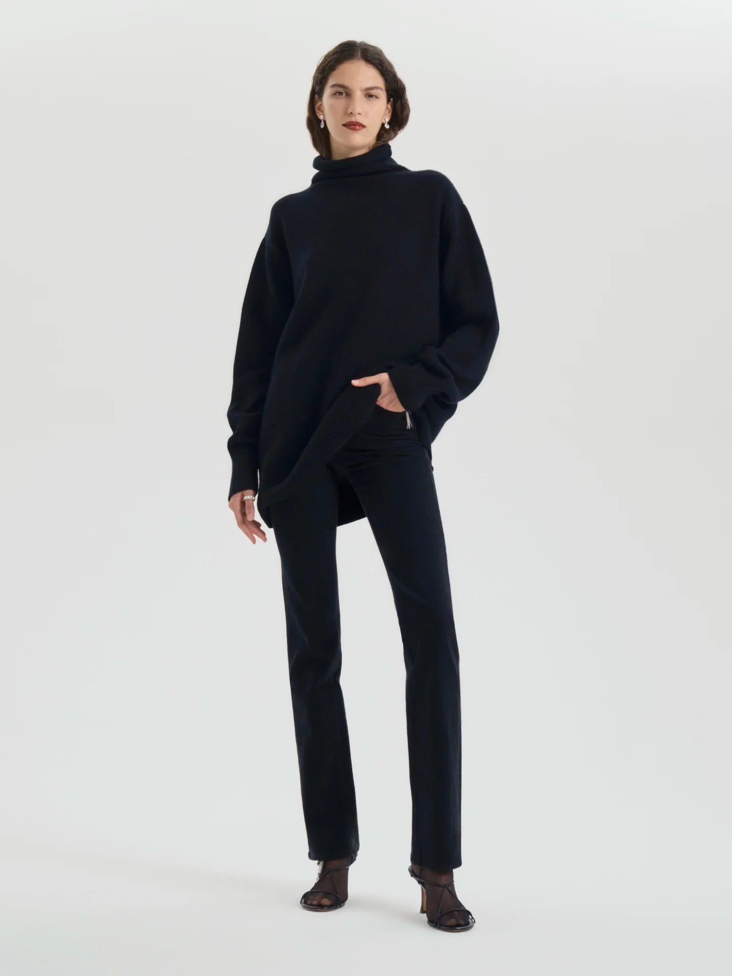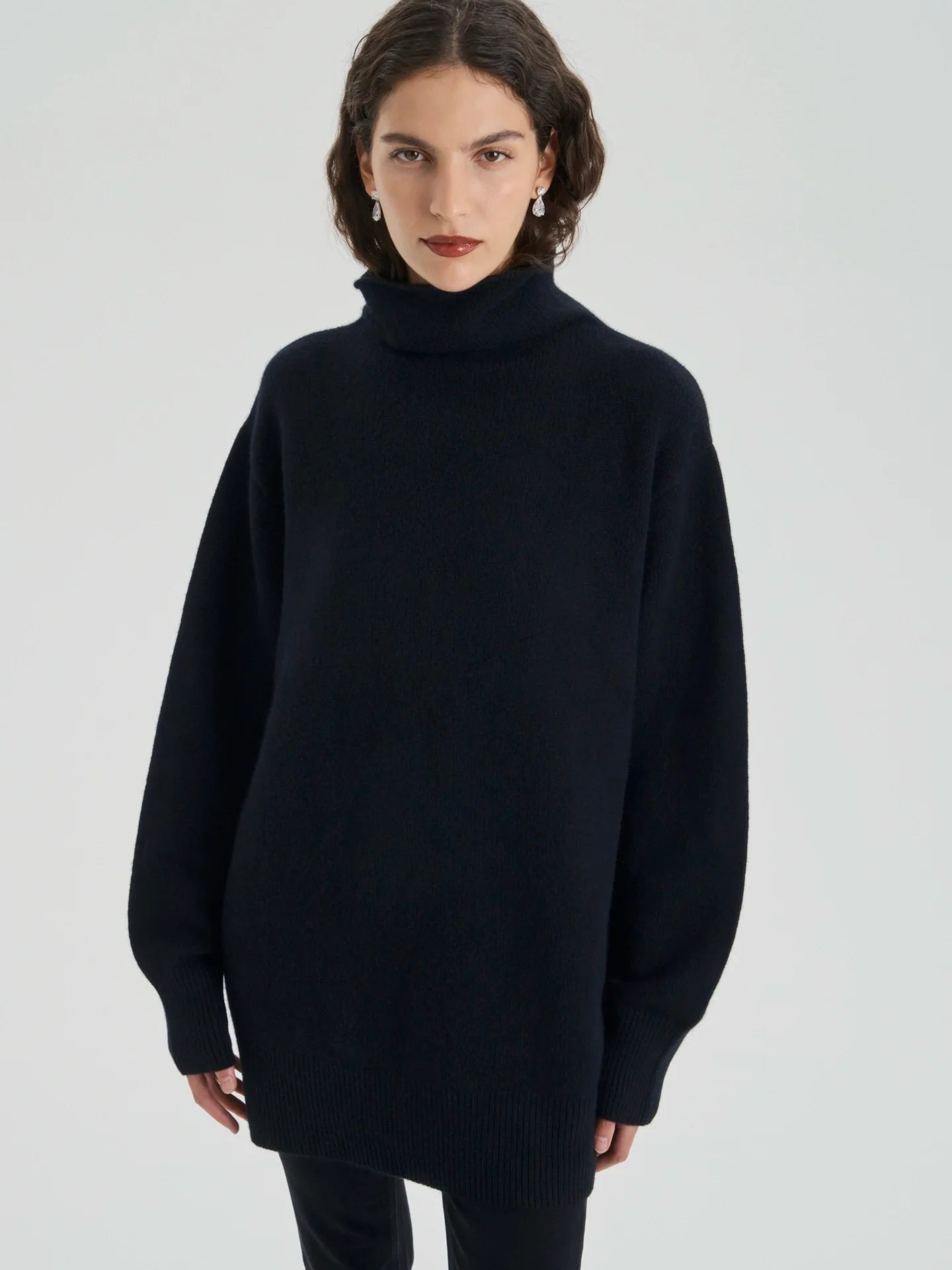 This is an oversized turtleneck sweater with a funnel neck, drop shoulders, and extra long sleeves. Crafted in soft mid-weight cashmere with a smooth jersey stitch, and finished with ribbed hems and a fashioned center back seam.