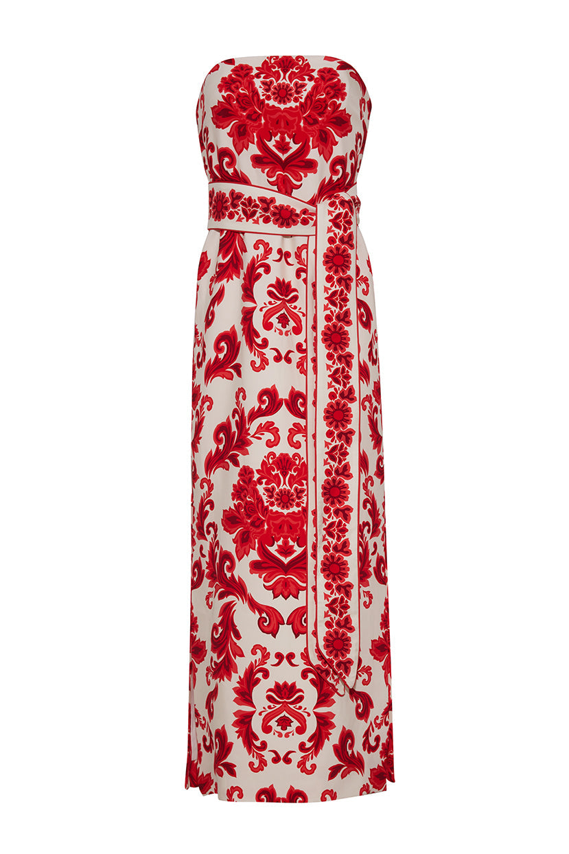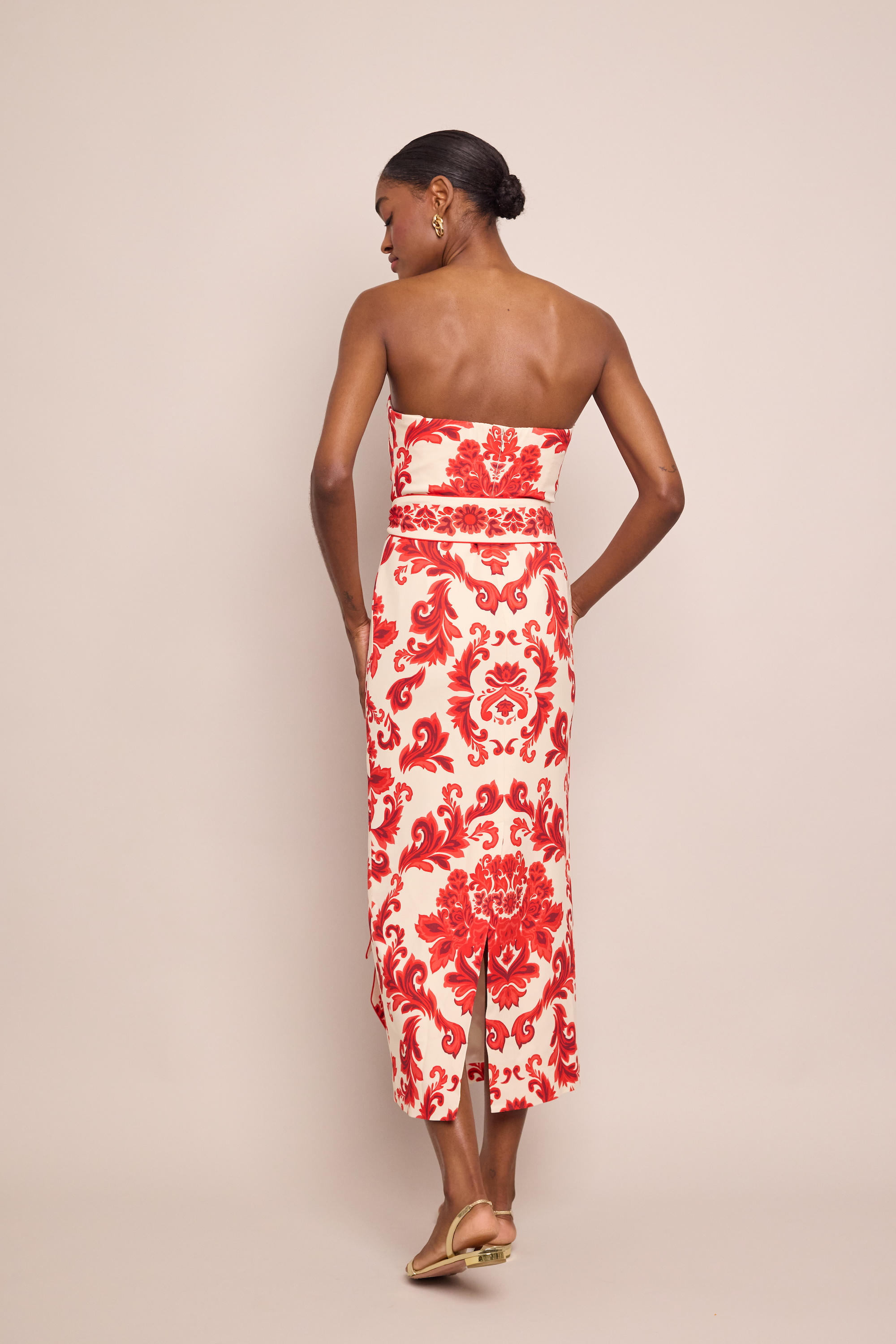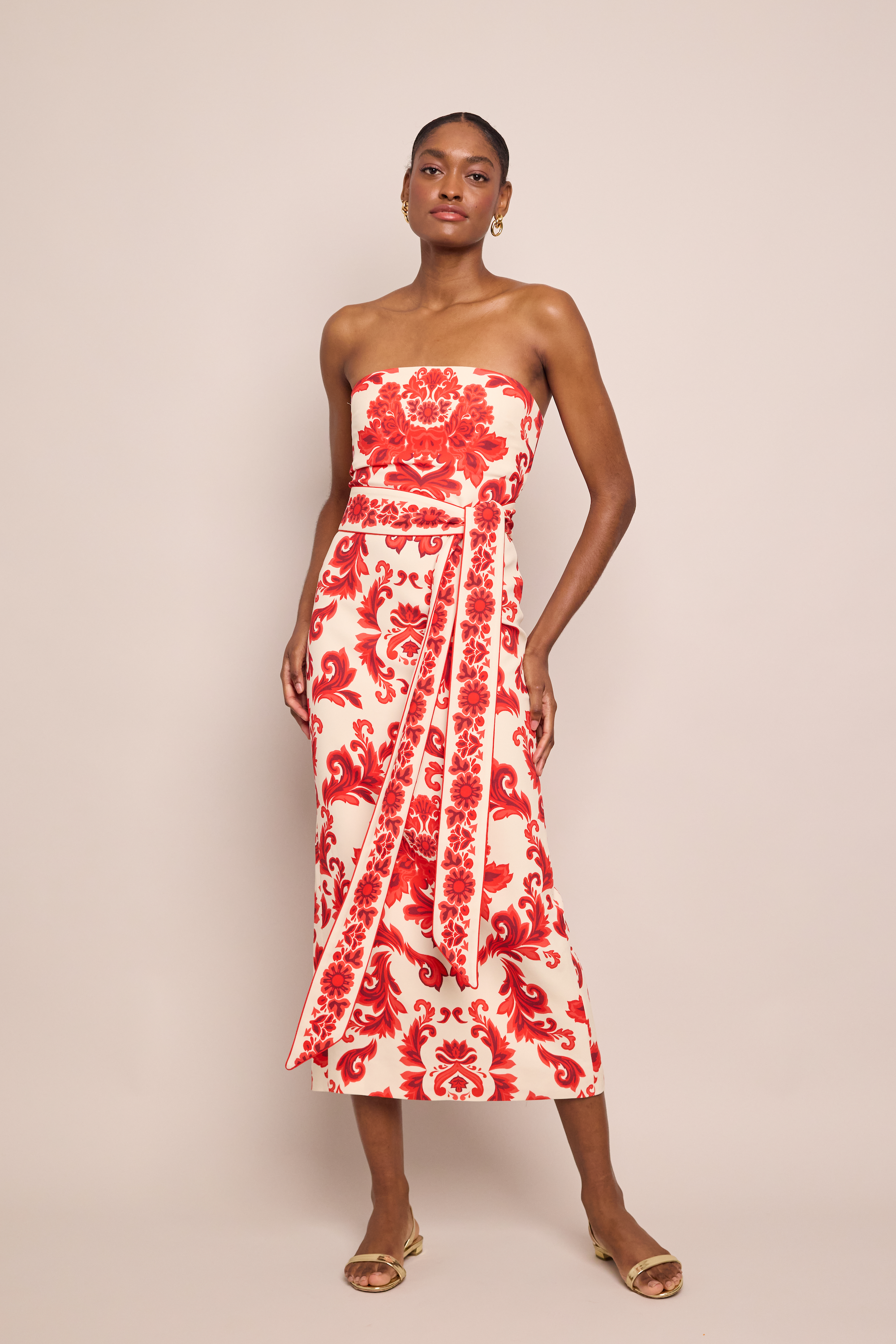 • Strapless stretch crepe column dress with slightly waisted look