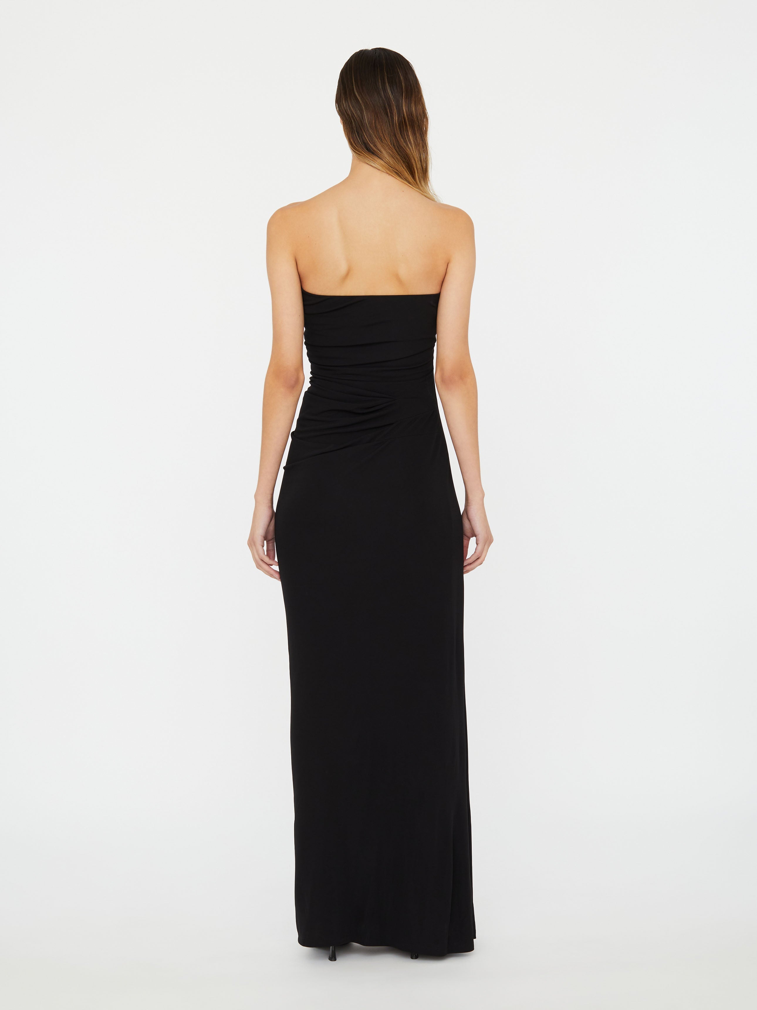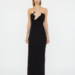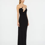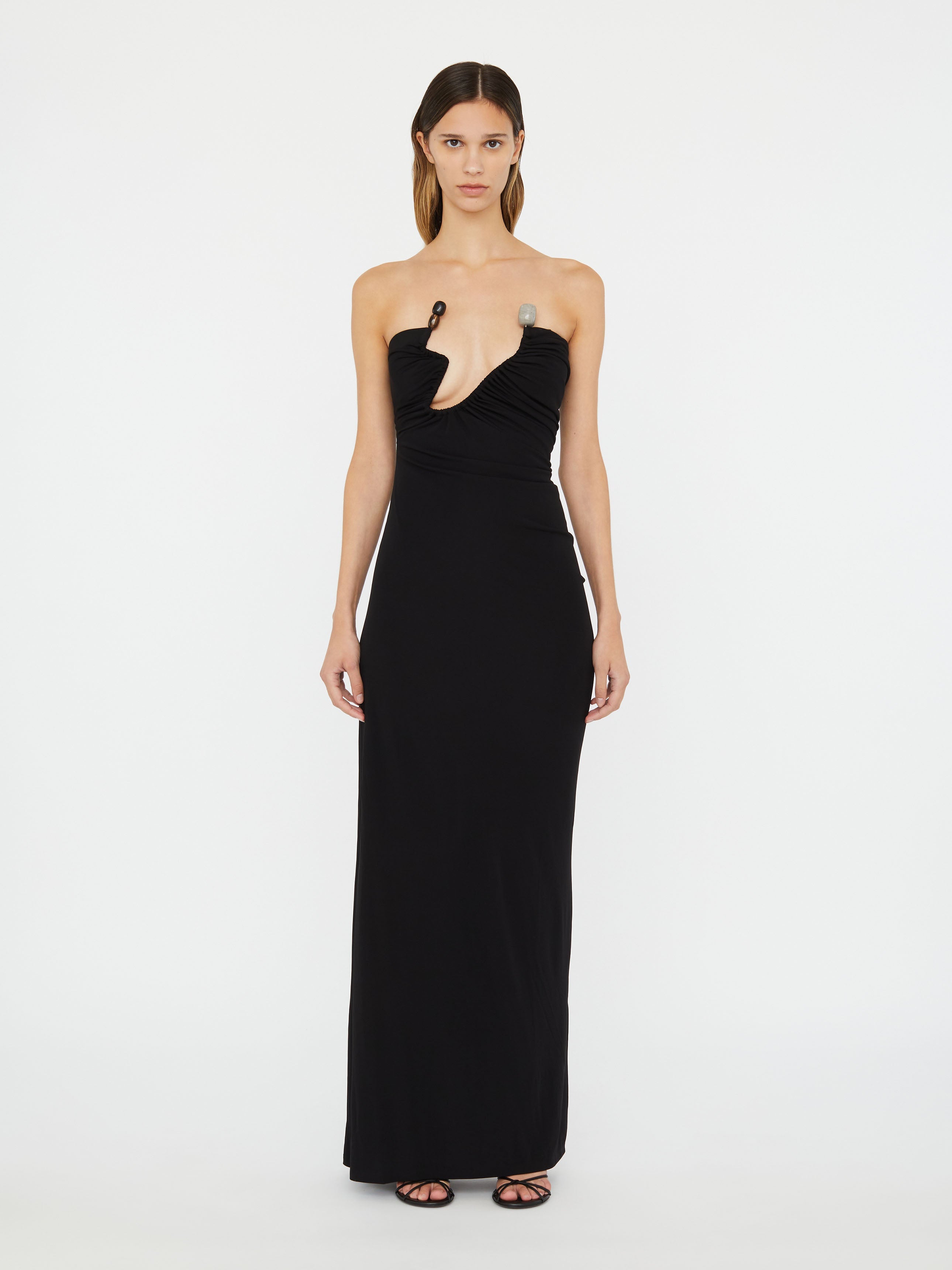 Sculptural hardware evolves to form this arced strapless maxi gown. Adorned with our bespoke natural stones with enhancing properties.