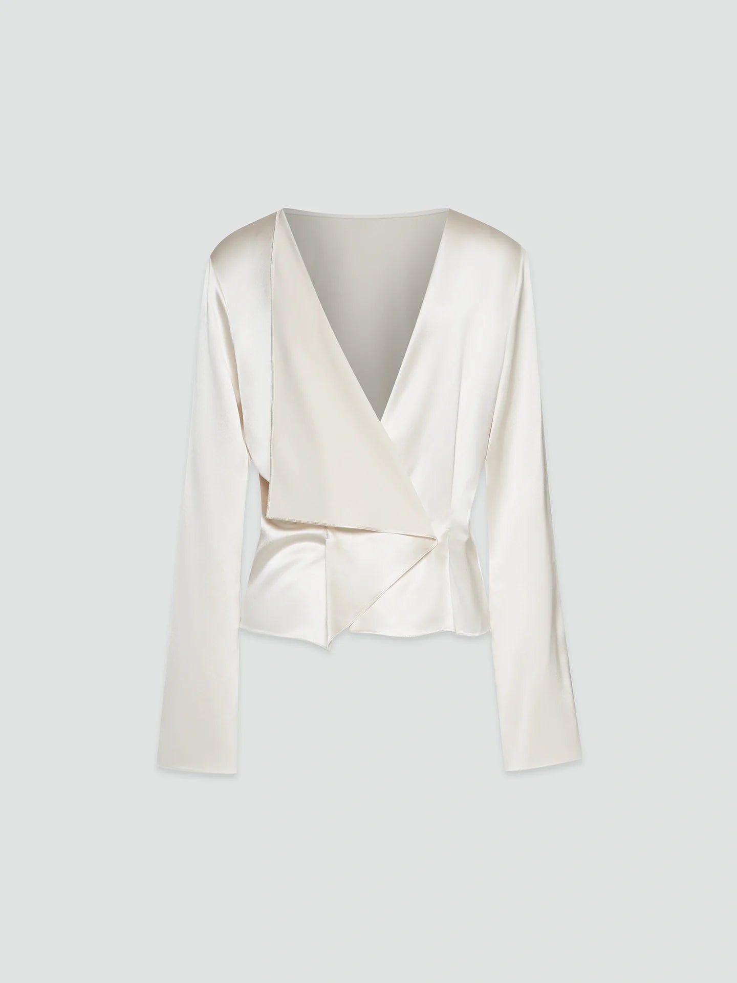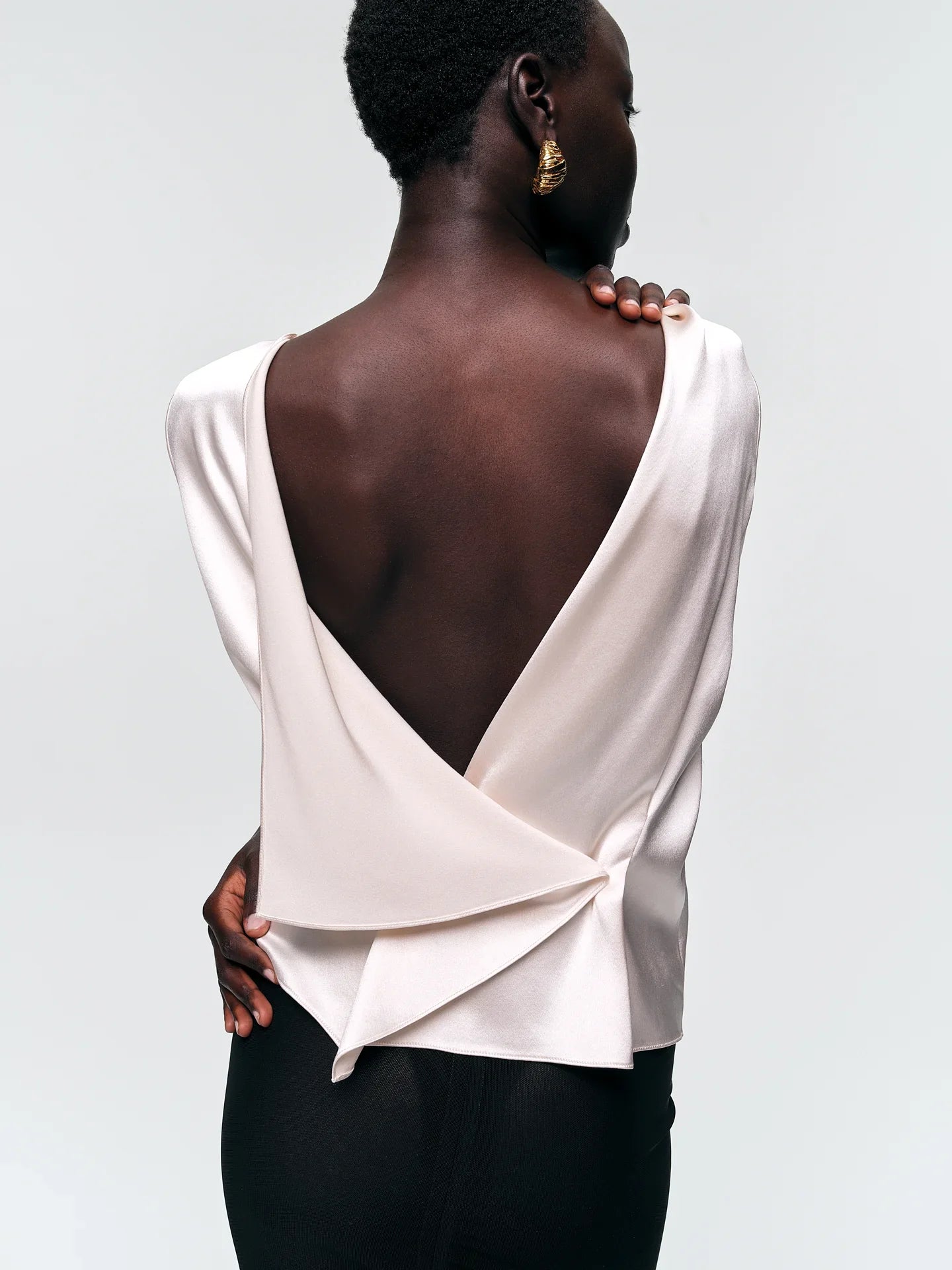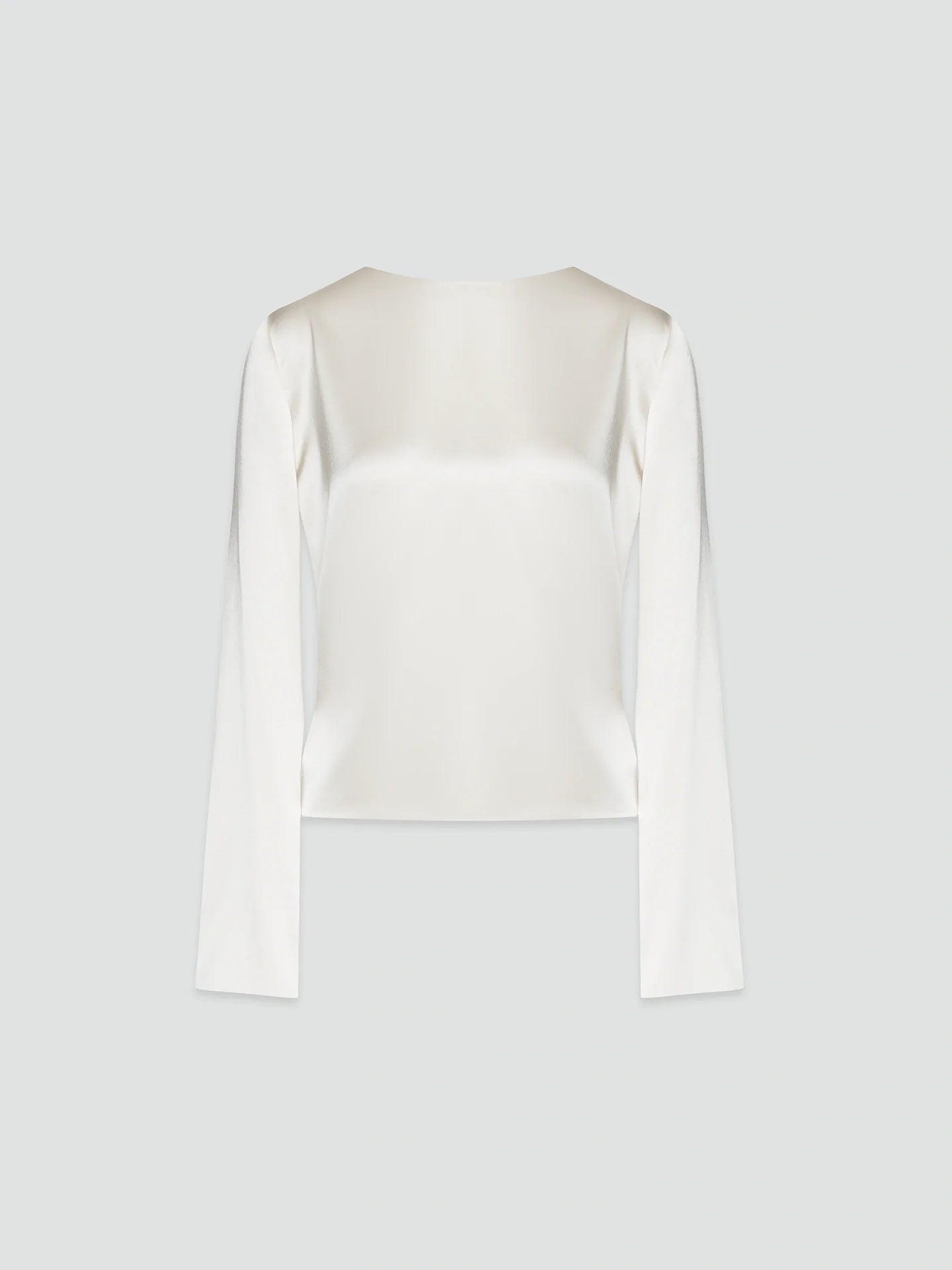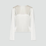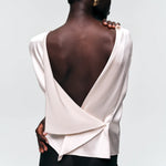 This is a boat neckline top with a hand-draped open back, luxuriously long sleeves, and a slight taper to the body. The heavyweight, glossy silk satin has a liquid softness that enhances the top's rich flowing lines.