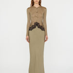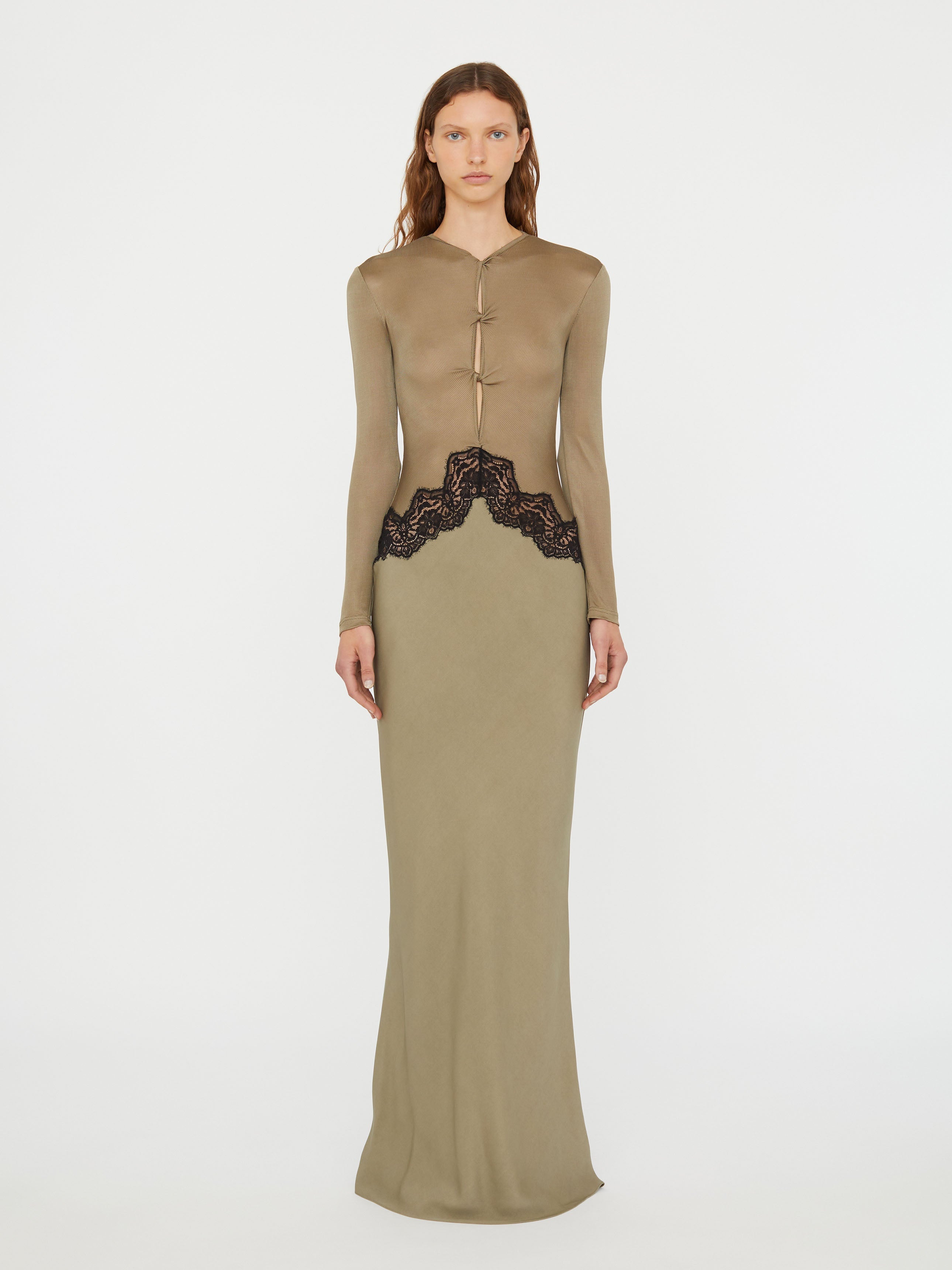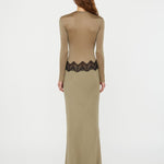 Pragmatic & feminine details combine to form this lace insert long sleeve maxi dress. Fine rib stretches with ease to the body, whilst sheer lace traces the torso. Twist cut out details draw the eye in.