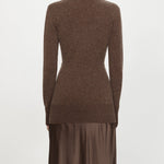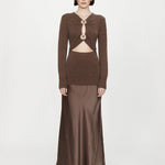 An evolution of the Monument silhouette, the Orbit Ruched Monument Long Sleeve Dress is defined by dual orbit-inspired hardware that gathers the knit through keyhole cut-outs at the centre front. The fitted long-sleeve bodice meets a soft, fluid skirt, creating a balanced interplay of structure, skin and drape.