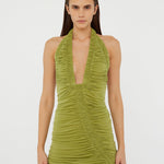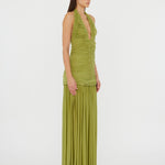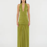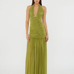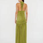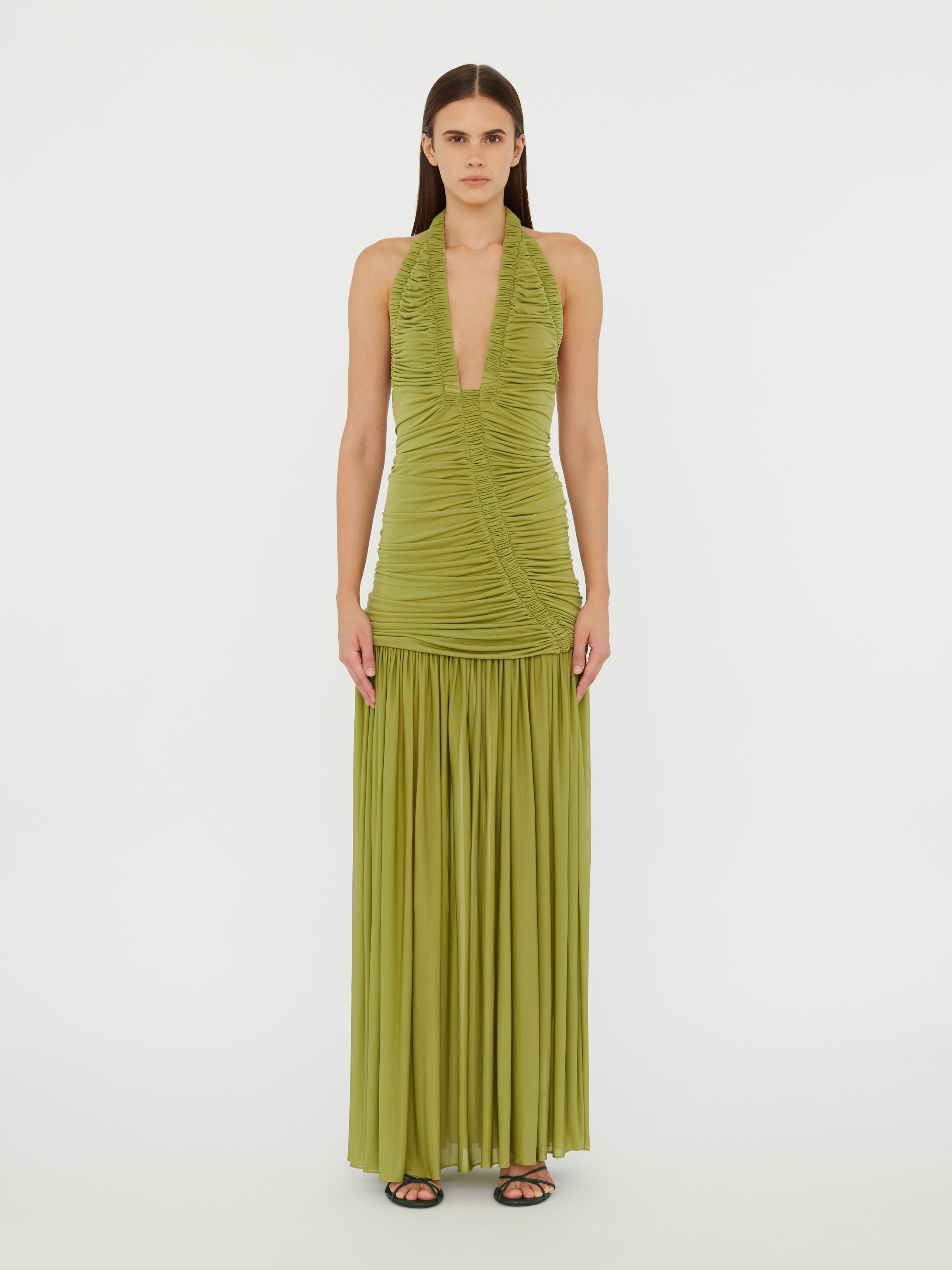 Grafted with free forming line, this richly textured gown is animated by hand sculpted pleats that trace its plunging v neckline and racerback straps.