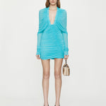 An evolution of the signature Orion line, the Orion Micro Dress is defined by sculpted ruching that shapes the plunging neckline and draws into a contoured, body-skimming silhouette. Long, gauze-like sleeves fall from the shoulder in soft drape, balanced by a gathered mini length that creates subtle volume and textural depth.