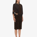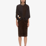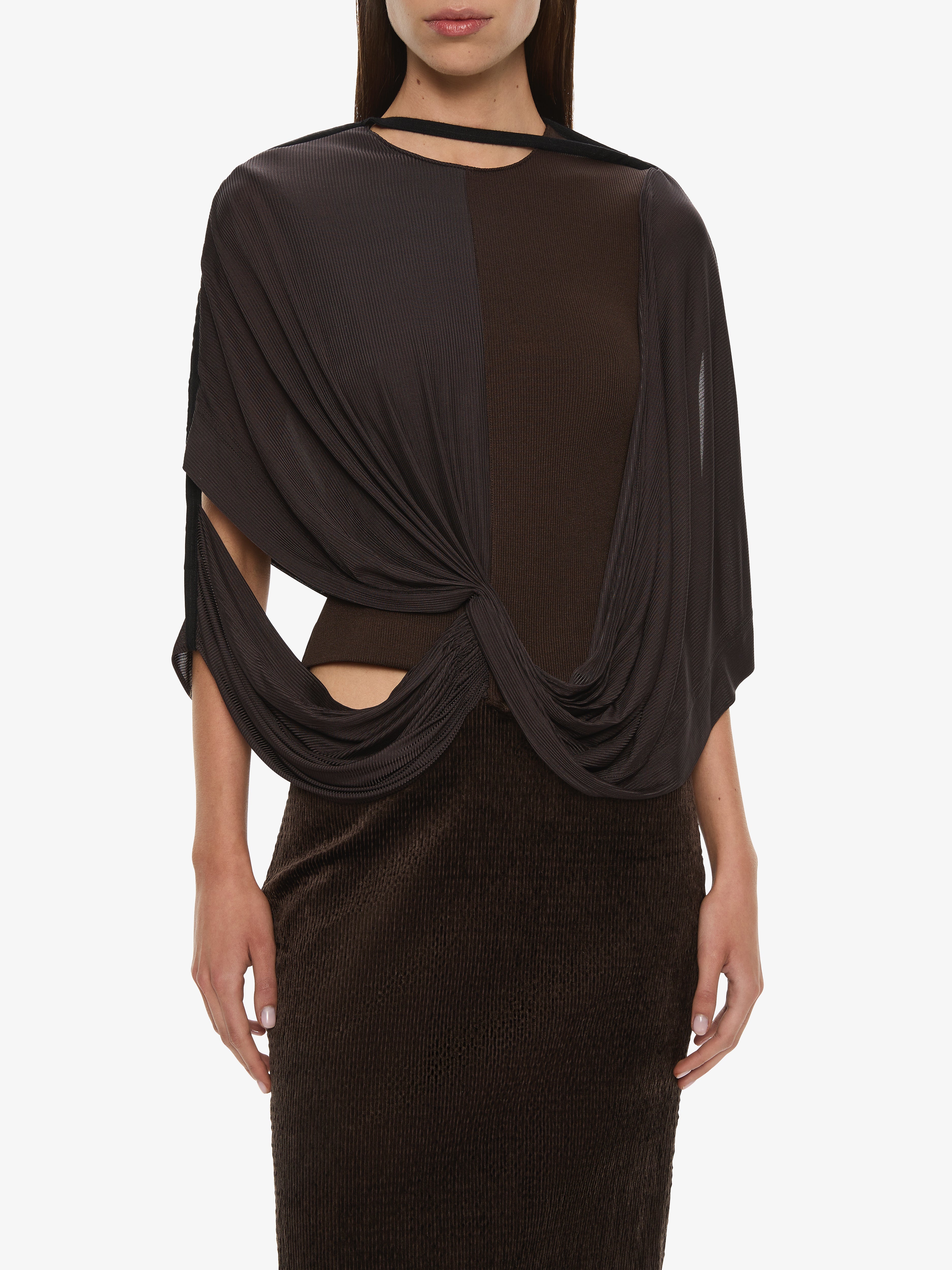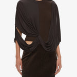 A semi-sheer mesh overlay is gathered and suspended over a stretch rib base, creating an asymmetrical silhouette that reveals the arms through open slits and is anchored by a central knot at the waist. Finished with a high neckline and soft raw edges, contrasts sculptural drape with clean, columnar form.