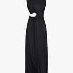 The Paisley Overlay Encased Tank Dress features a fluid maxi silhouette with a bubble hem and sculptural side cutout. The body is softly draped and drawn toward a single curved opening, framed by signature metal paisley hardware. A sheer mesh yoke adds contrast and coverage, while directional ruching enhances movement.