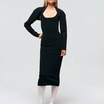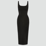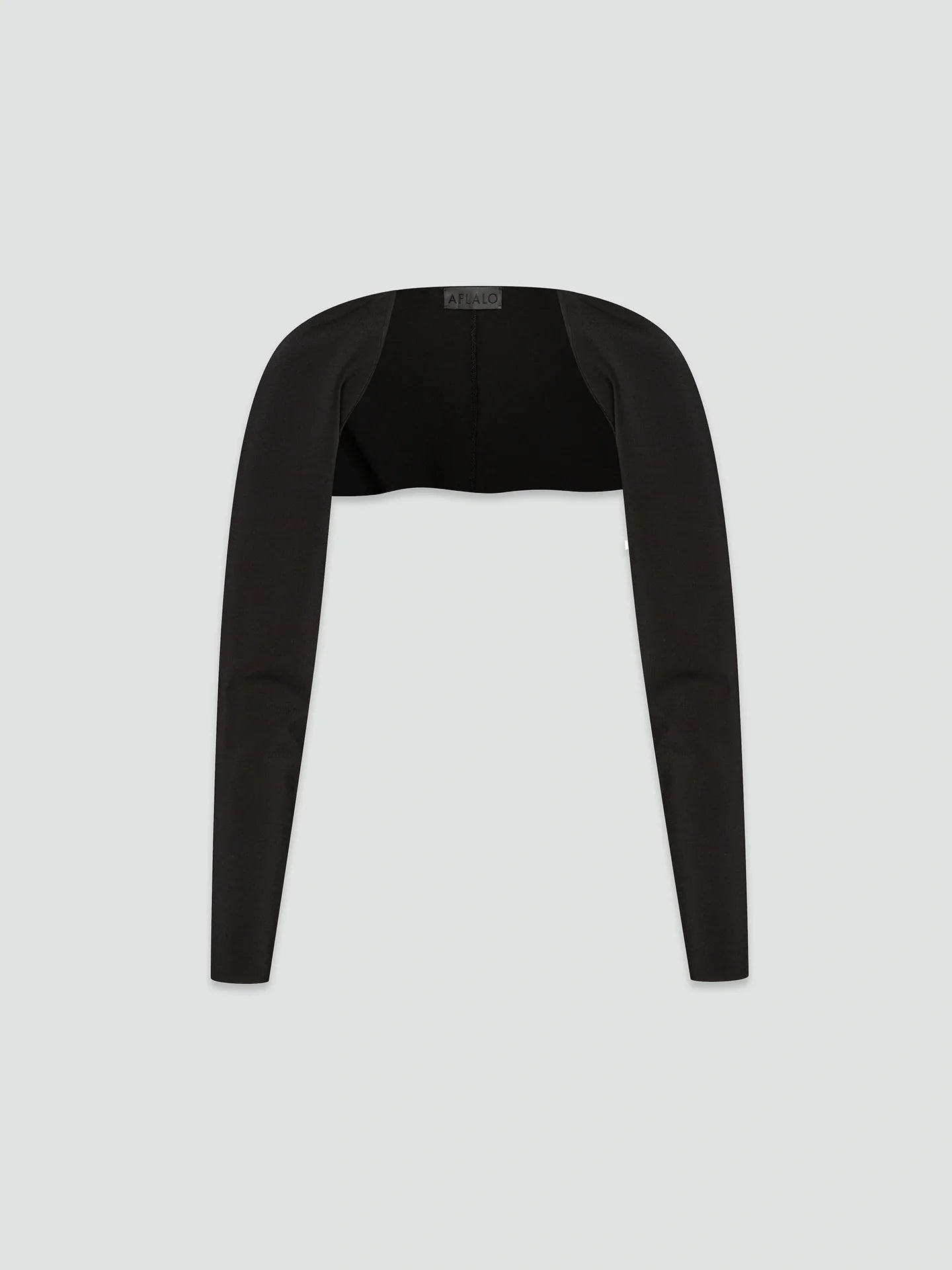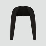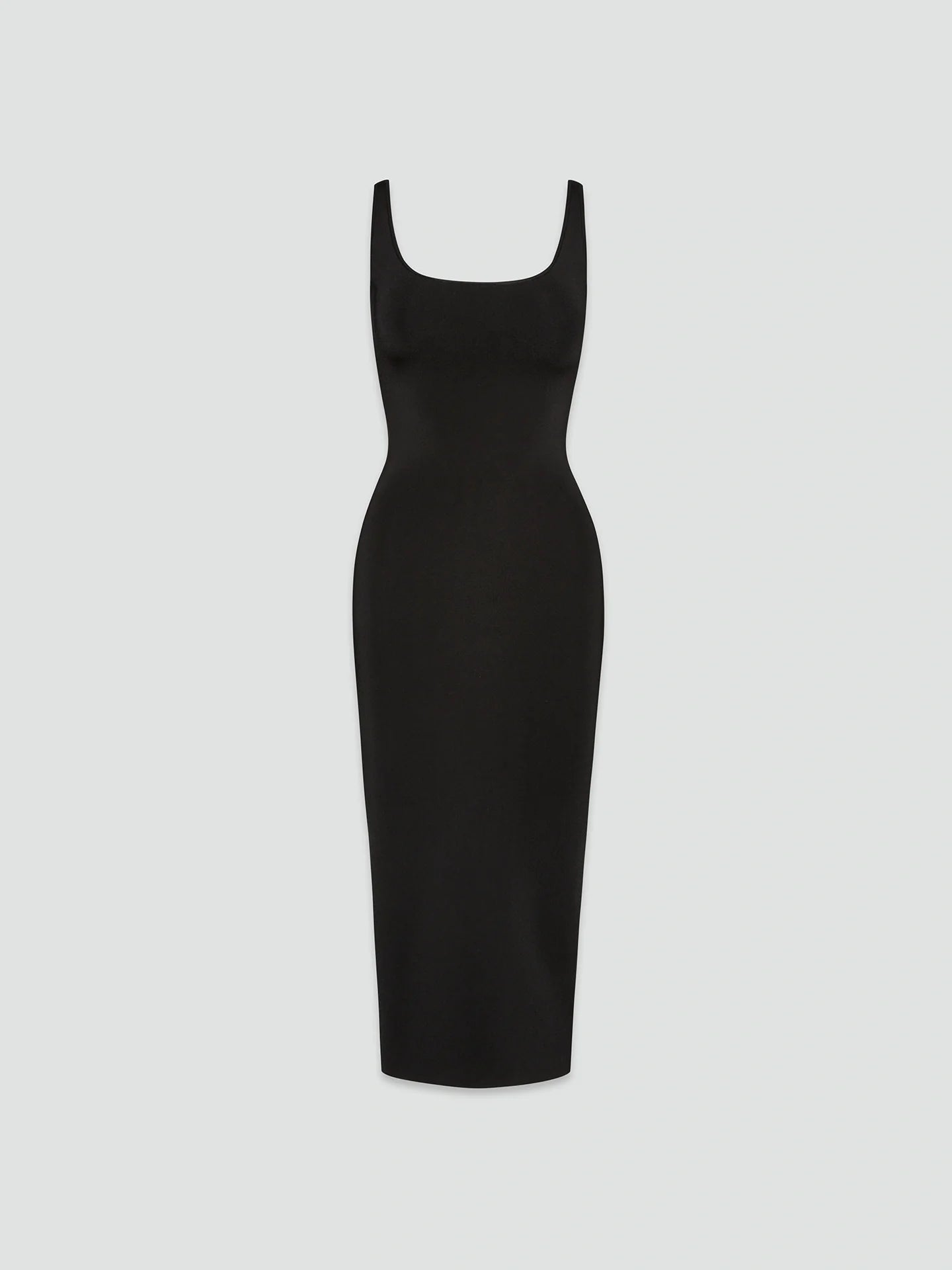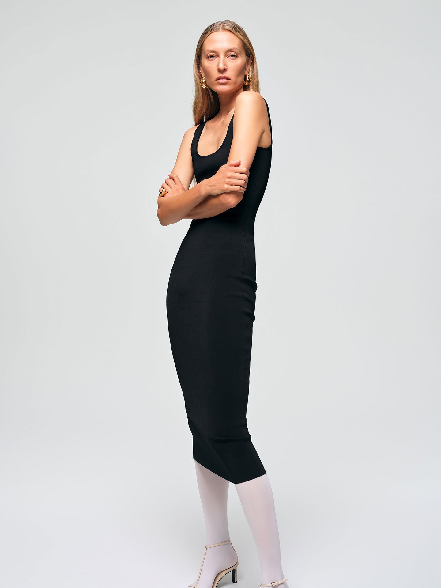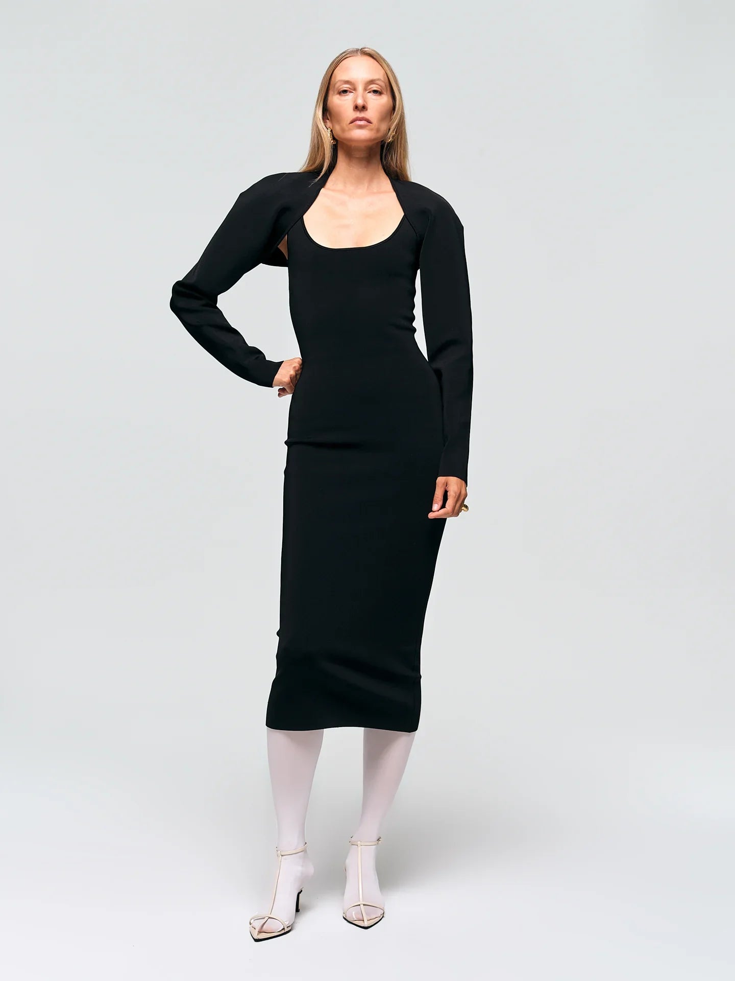 A figure-sculpting dress with a scooped neckline and mid-length hem, accompanied by a bolero that lends subtle drama to the otherwise classic silhouette. This set is knit in a compact interlock stitch with lustre viscose yarn for delicate sheen and a cool, smooth handfeel.