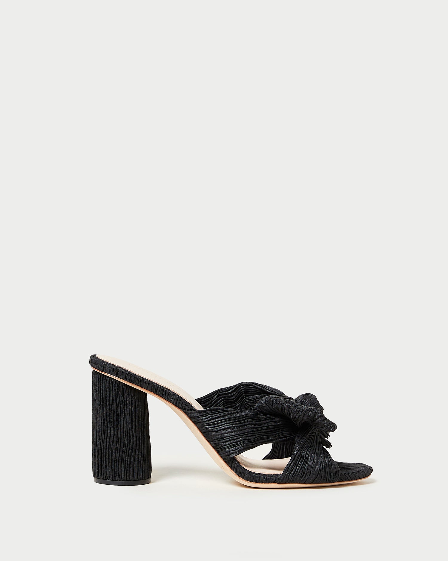 Pleated heeled sandal in black organza fabric topped with our signature knotted bow. Features a padded footbed with gold stamped logo and an open toe. 3.5 inch heel.