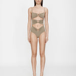 Sculptural orbit hardware pierces matte lycra for elevated poolside dressing. This cut-out front one piece is ruched at the centre and features signature orb hardware.