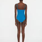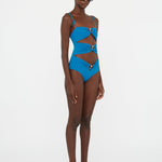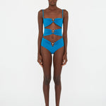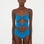 Sculptural orbit hardware pierces matte lycra for elevated poolside dressing. This cut-out front one piece is ruched at the centre and features signature orb hardware.