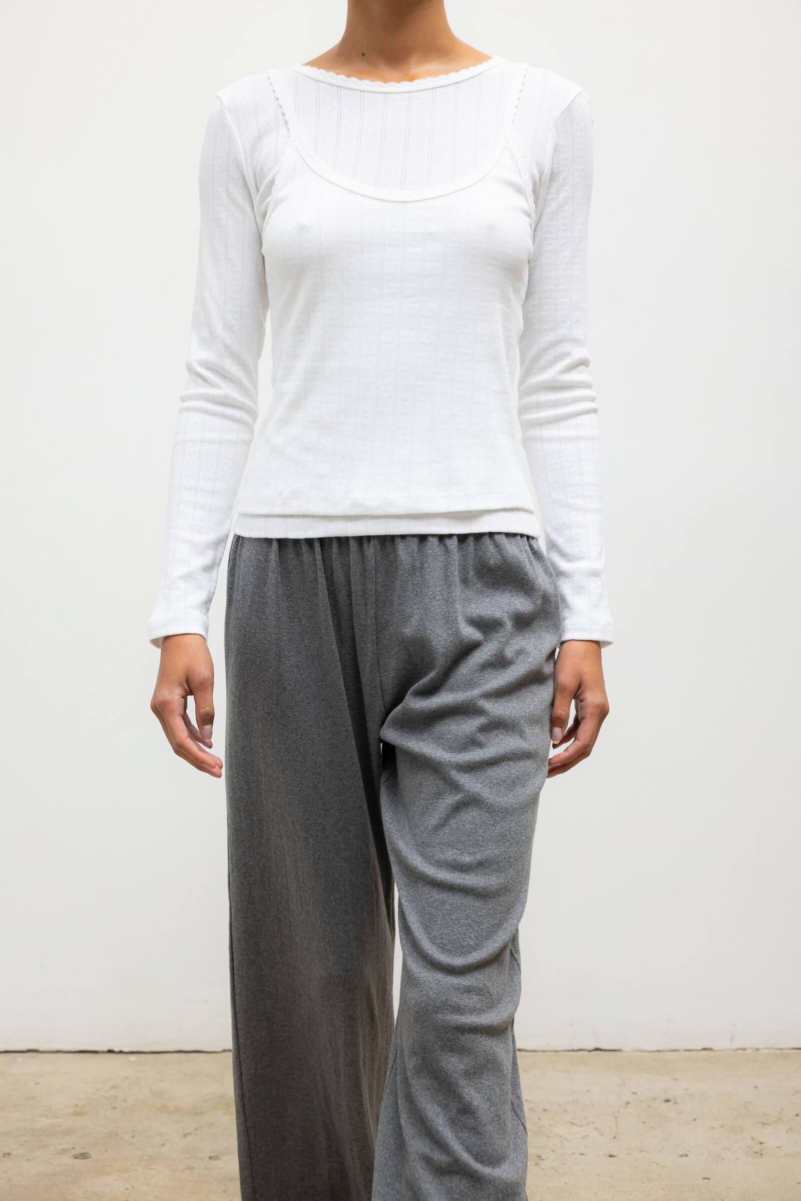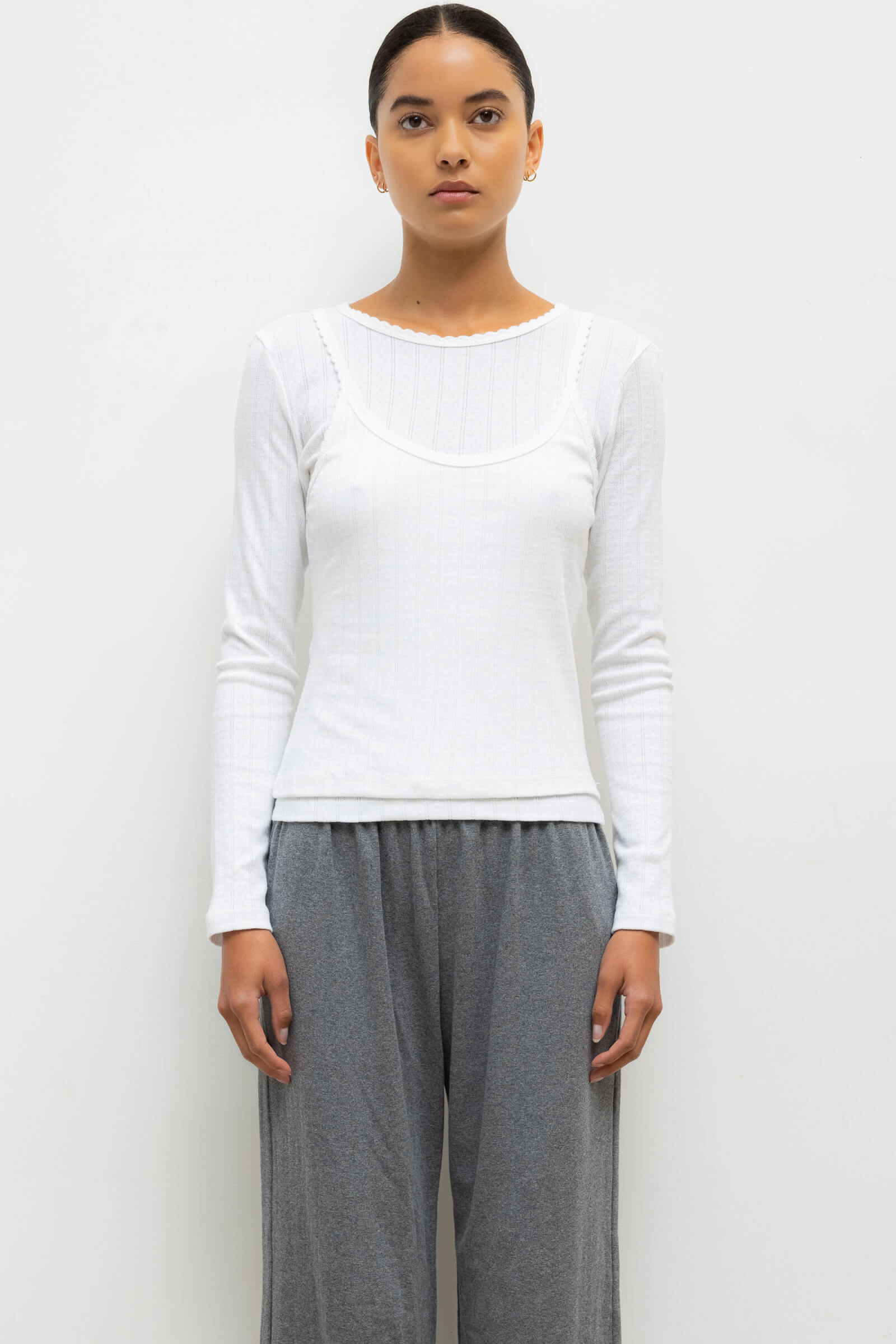 Cut in our nostalgic Pointelle Cotton, The Pointelle Layered Long Sleeve Top combines two of our bestselling Pointelle styles into one - a classic spaghetti strap tank over a high neck slim fit long sleeve. Mix it with The Yoshi Set in Mocha Brown - or complete the set with any Pointelle bottom.