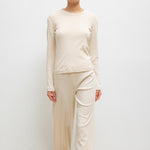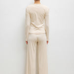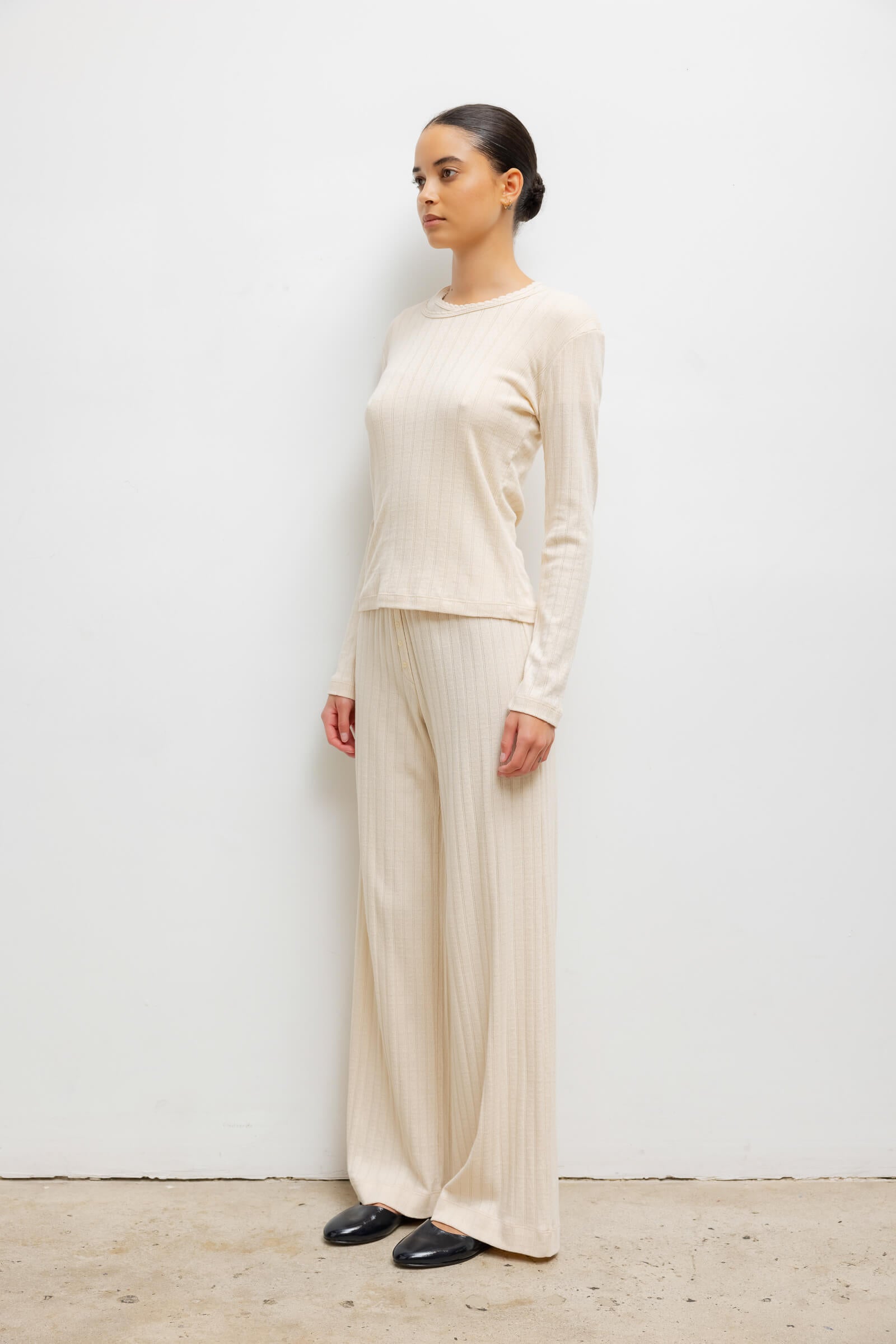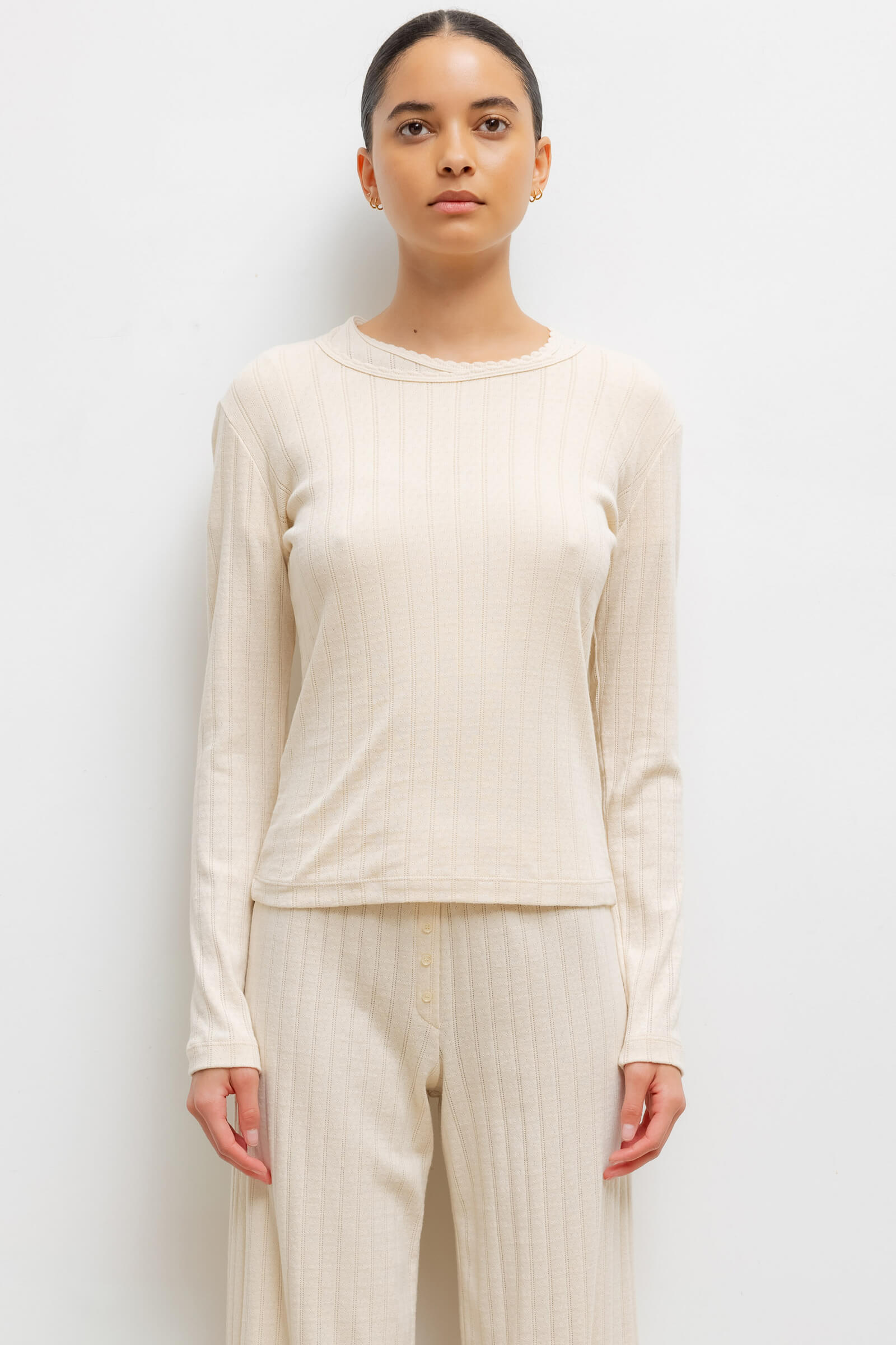 Cut in our nostalgic Pointelle Cotton, The Pointelle Slim Fit Long Sleeve features a classic crew neckline with our signature pinhole stripes, dainty eyelets, and scalloped edging. Full length with fitted long sleeves.