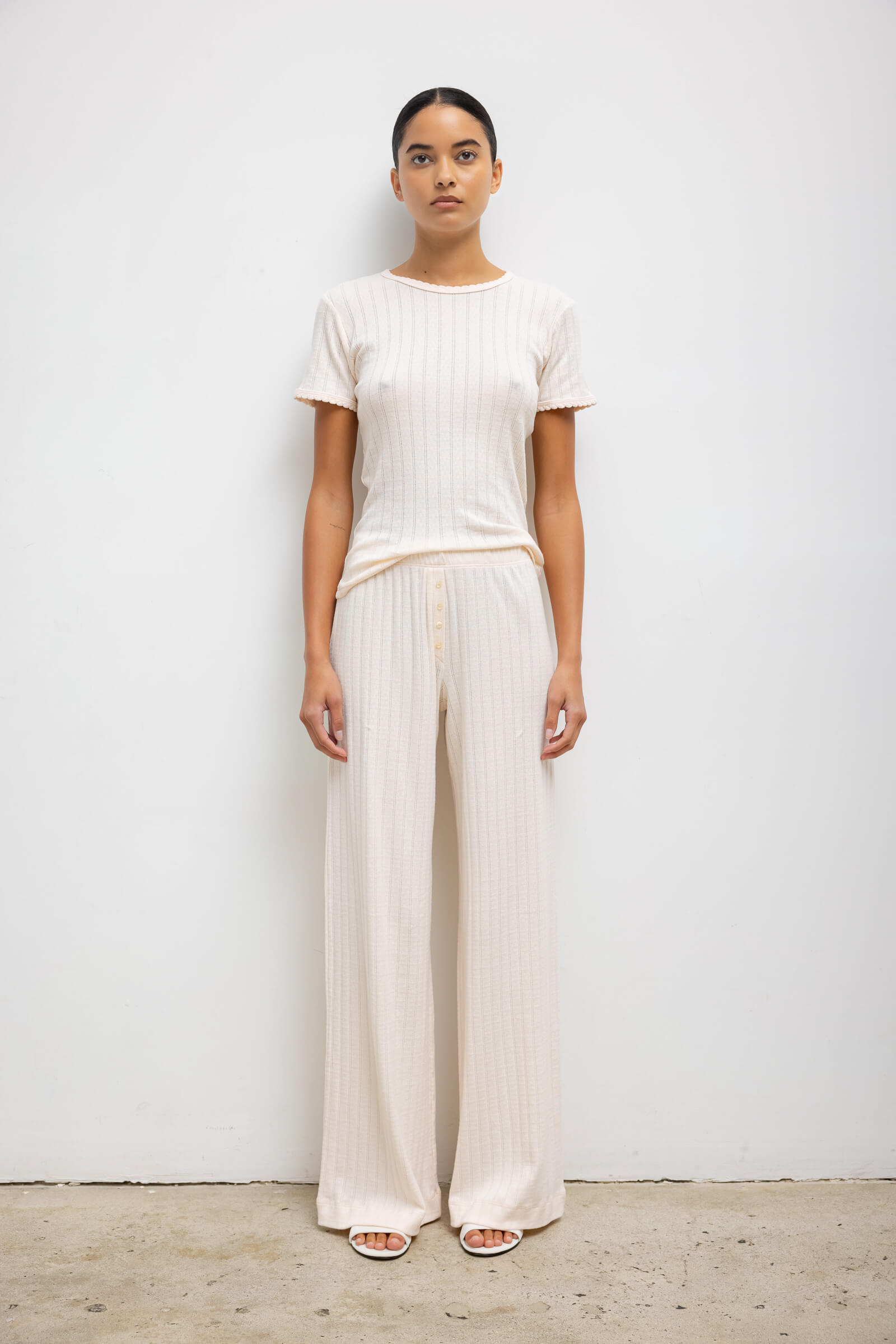 Cut in our nostalgic Pointelle Cotton, The Pointelle Slim Fit Tee features a classic crew neckline with our signature pinhole stripes, dainty eyelets, and scalloped edging.