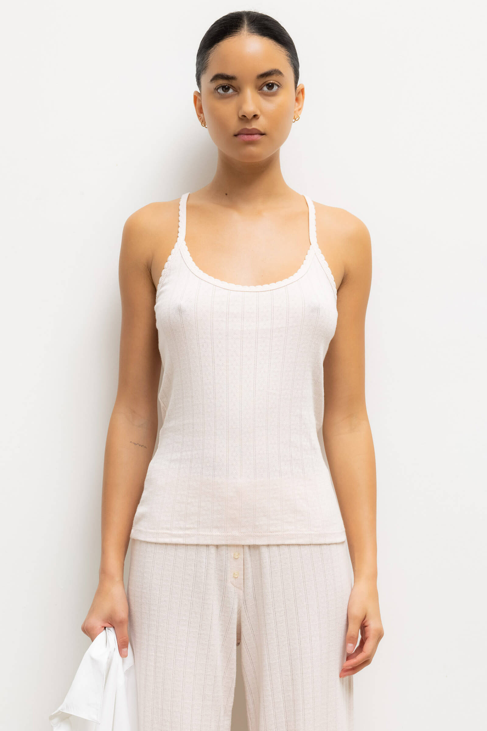 Cut in our nostalgic Pointelle Cotton, The Pointelle Tank is a classic spaghetti strap silhouette, featuring our signature pinhole stripes, dainty eyelets and scalloped edging. Wear this by itself, or layered underneath button downs and sweaters.