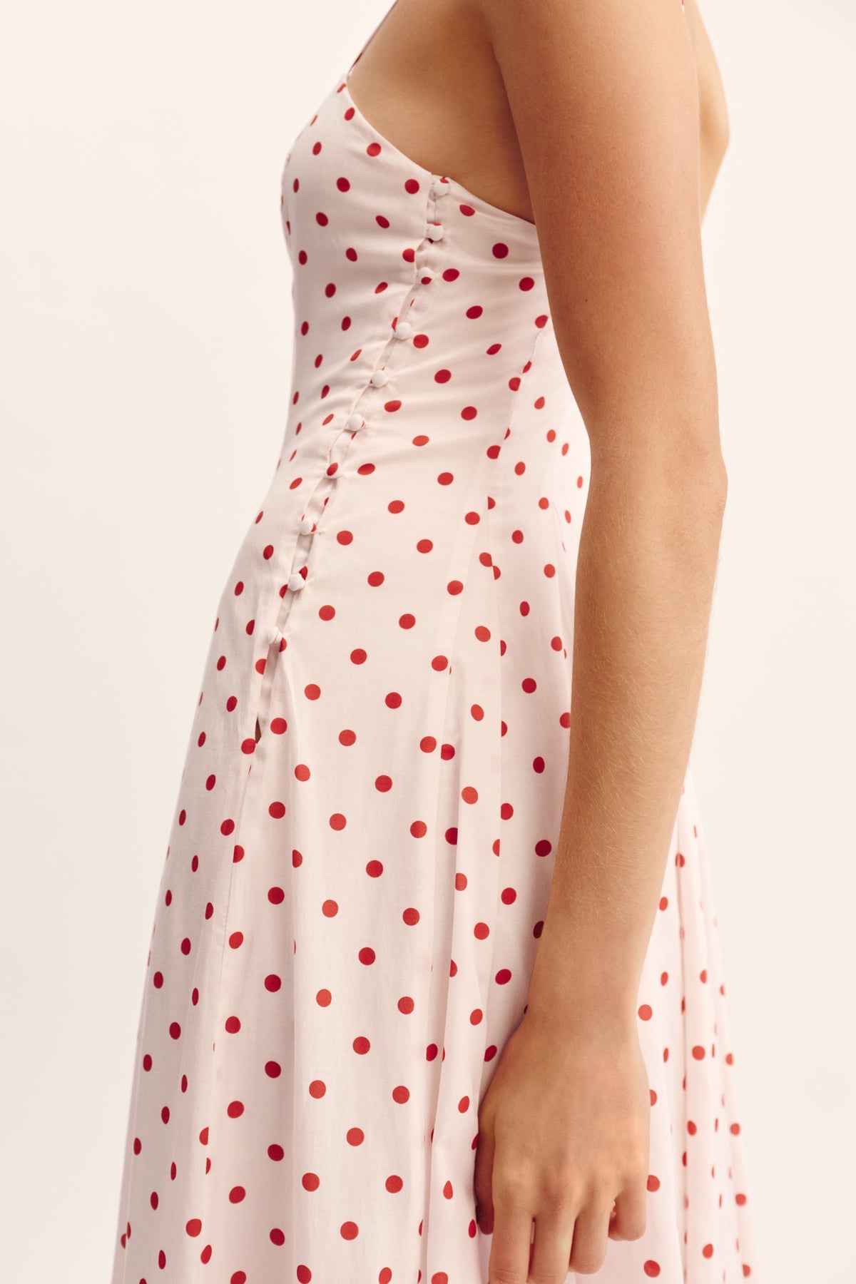 Patterned with classic polka-dots, the Paloma Dress is crafted from a luxurious tencel blend. It has a fitted waist framed with petite buttons on one side and falls to a floaty maxi skirt.