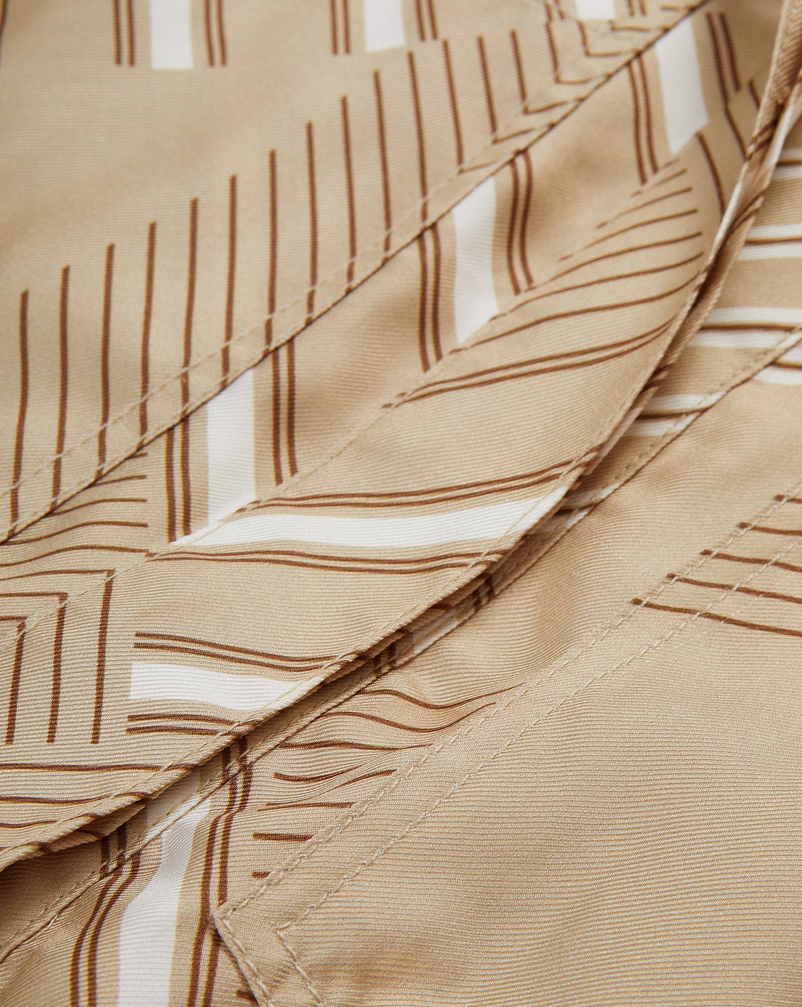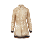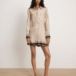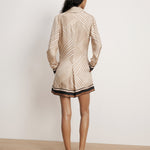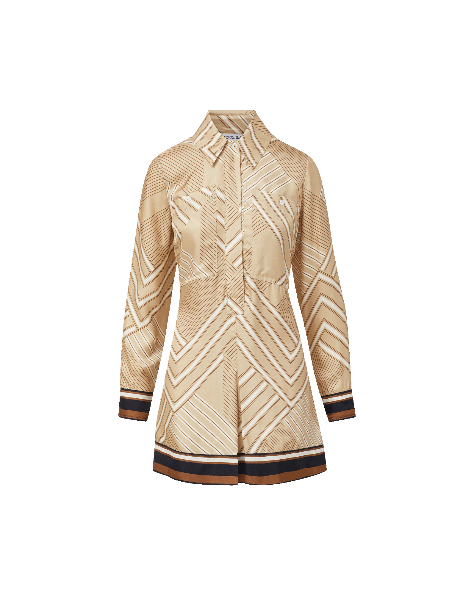 A versatile mini to wear now—and later. Crafted from a premium silk blend with a bold geometric pattern, Pryce is a relaxed, long-sleeve mini dress with a subtle A-line silhouette and front pleating. A collared hidden button placket, oversized front patch pockets, and striped hems complete the look. Pair with sandals for summer ease; layer over pants or tights once temperatures start to drop.