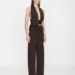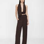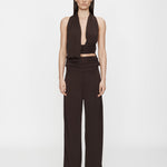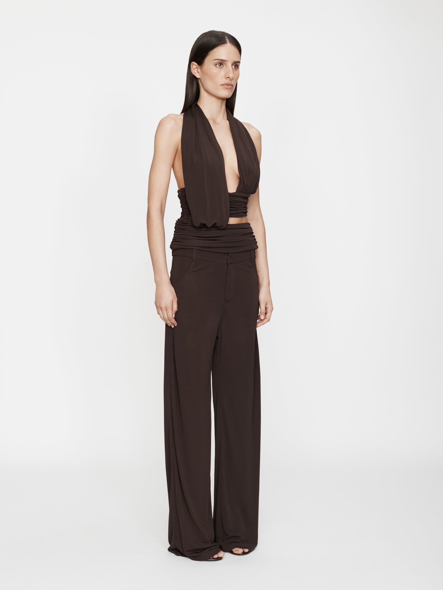A tailored approach to fluid fabrication, a mid-rise waist and an elongated, straight-leg silhouette. Minimal detailing and clean lines offer effortless pairing with statement tops or matching jersey pieces.