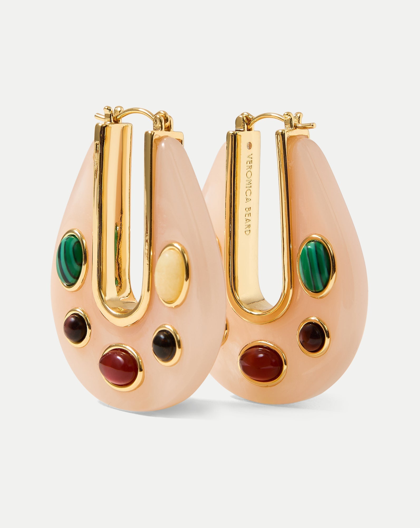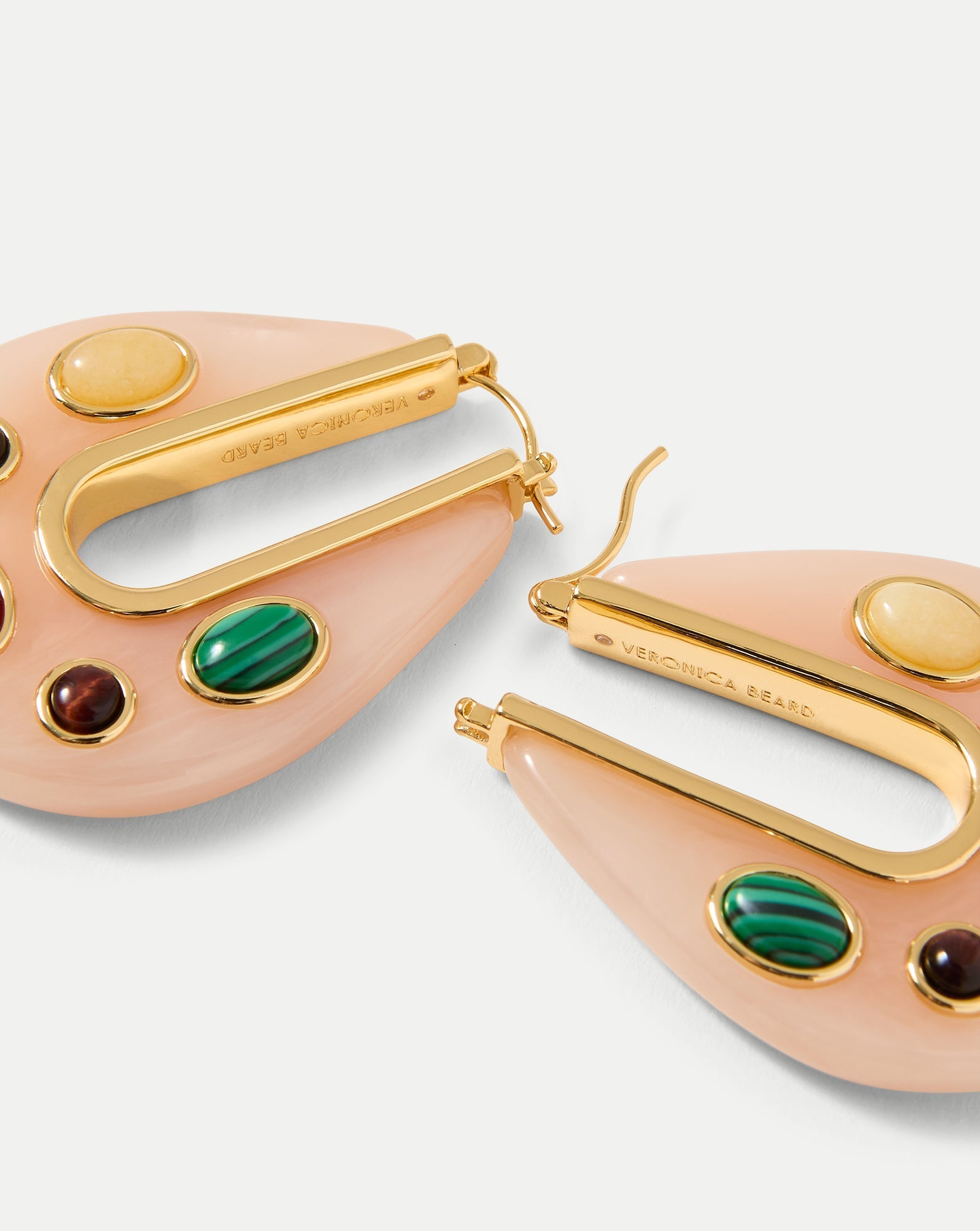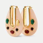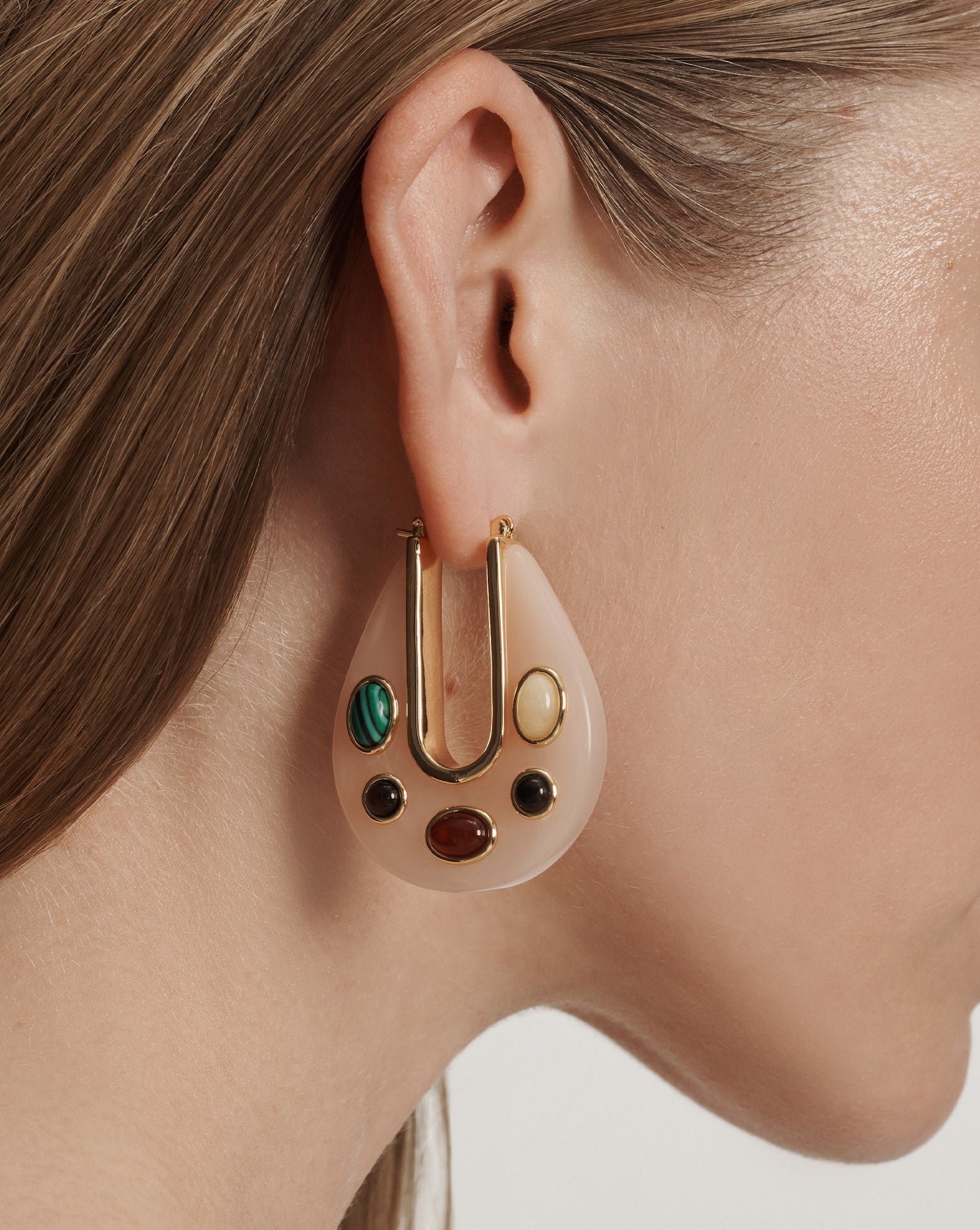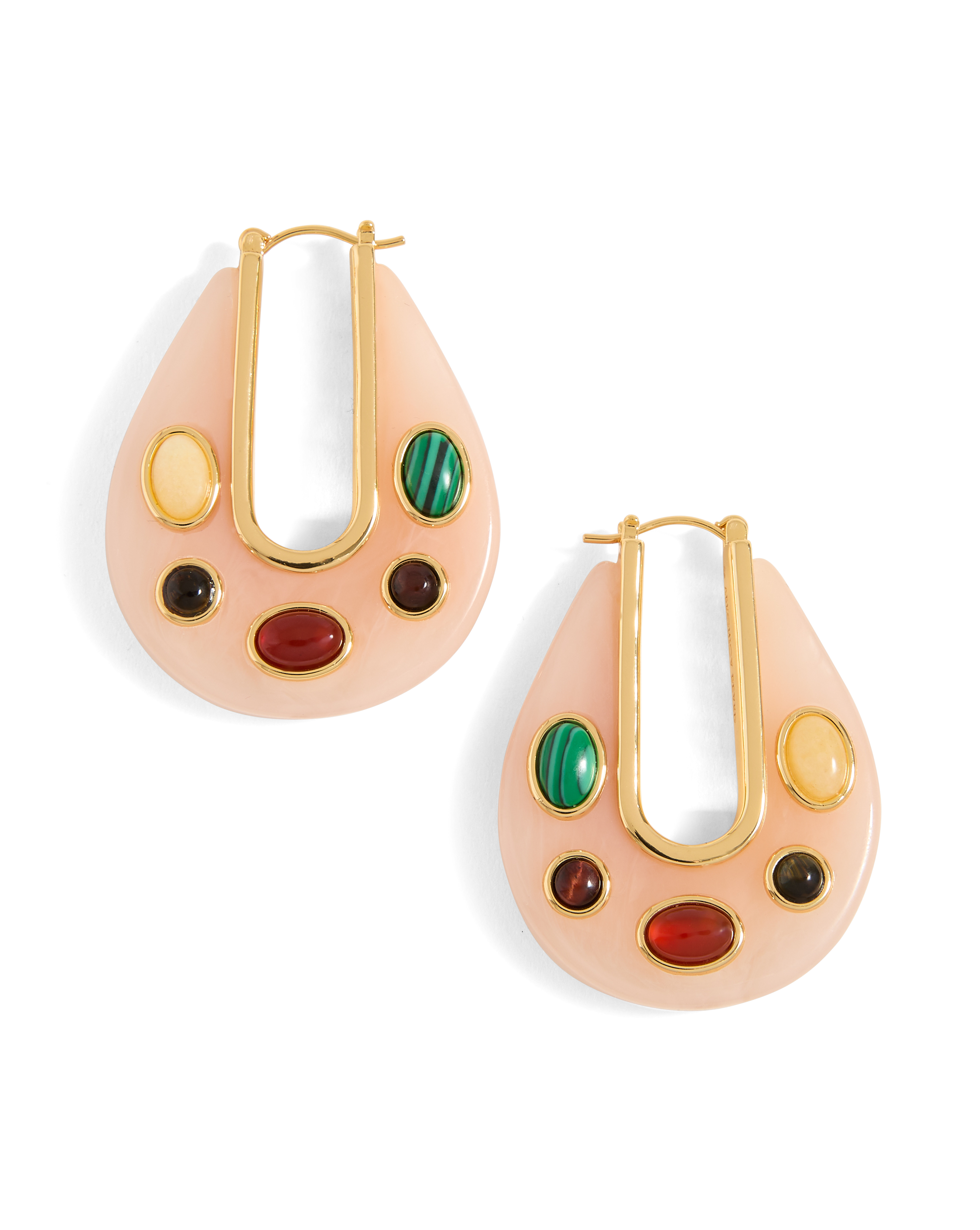 Our signature drop hoop—reimagined with a boho twist. Featuring bezel-set cabochon stone details, it’s finished with a 12k gold-plated brass inner rim and a click-top closure for easy wear. Style it back to casual outfits and night-out looks alike.