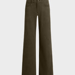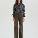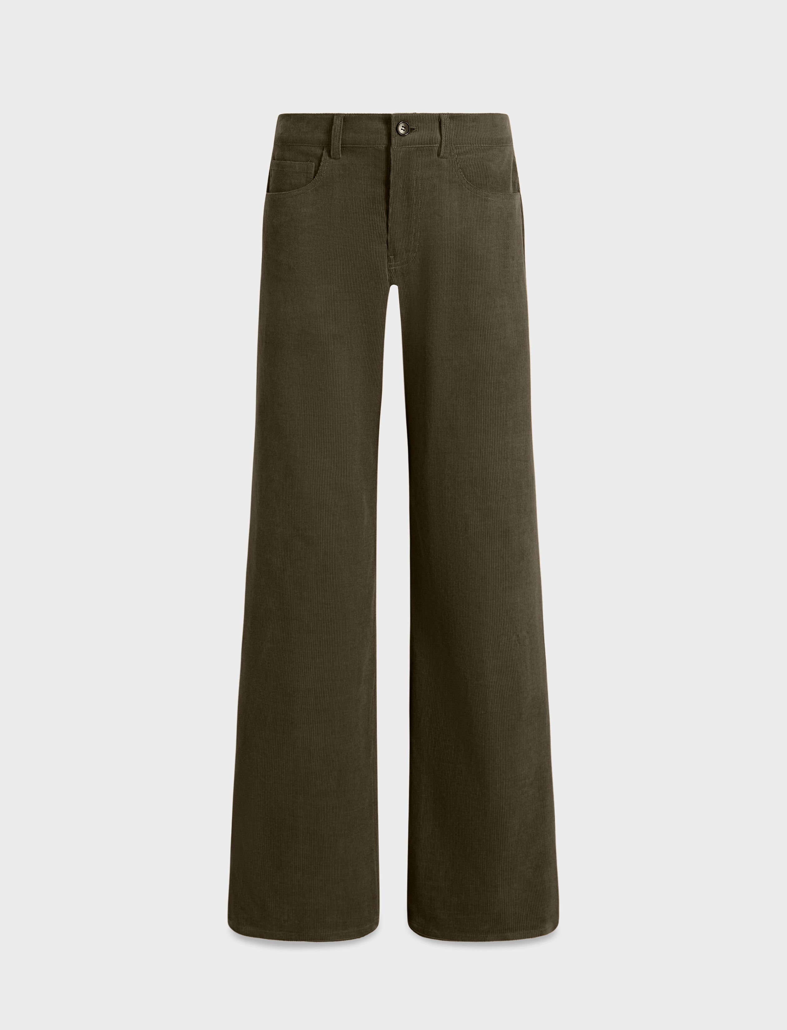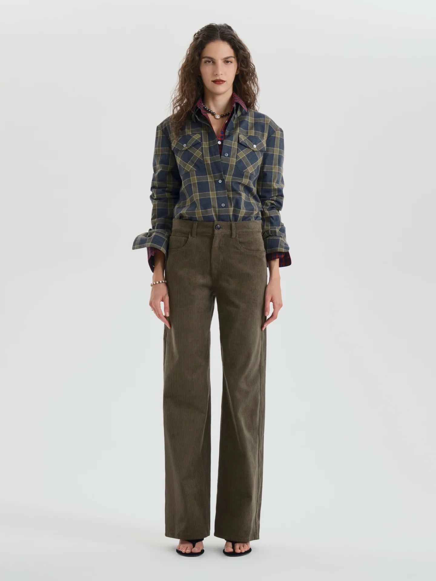 This is a mid-rise pant with a straight, wide leg that falls cleanly from hip to hem. Tailored in cotton corduroy with a structured drape and soft, velvety hand.