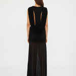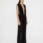 Cut in a signature draped jersey, this featherweight slink jersey drape gown features elongated suspended panels with ruched and twist detail.