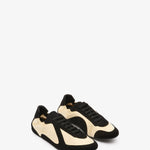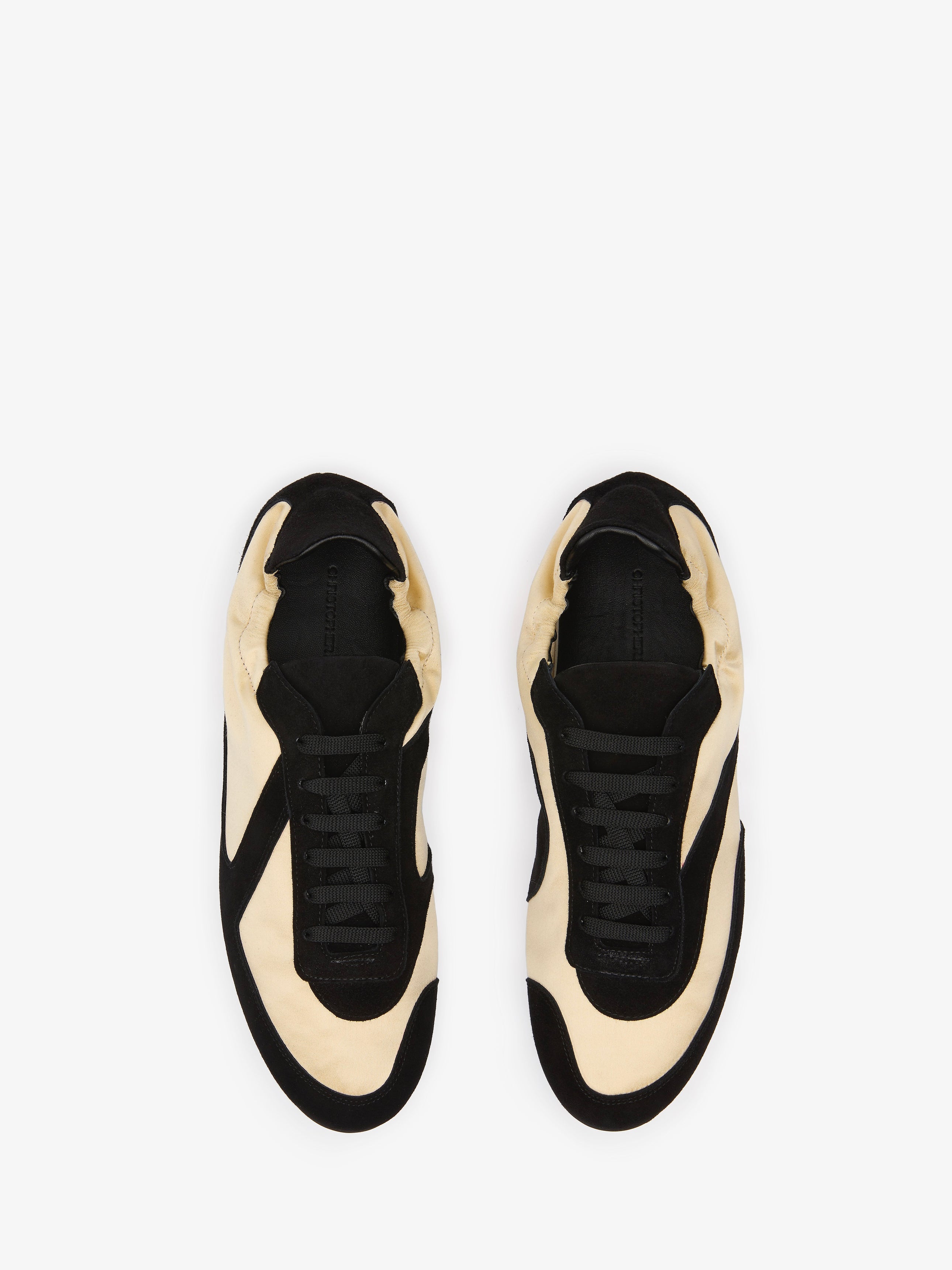 Constructed in matte satin with fluid black suede overlays, the silhouette nods to vintage athletic forms, softened and contoured to the foot with an elasticated back and contrast sole. A study in tension between precision and ease.