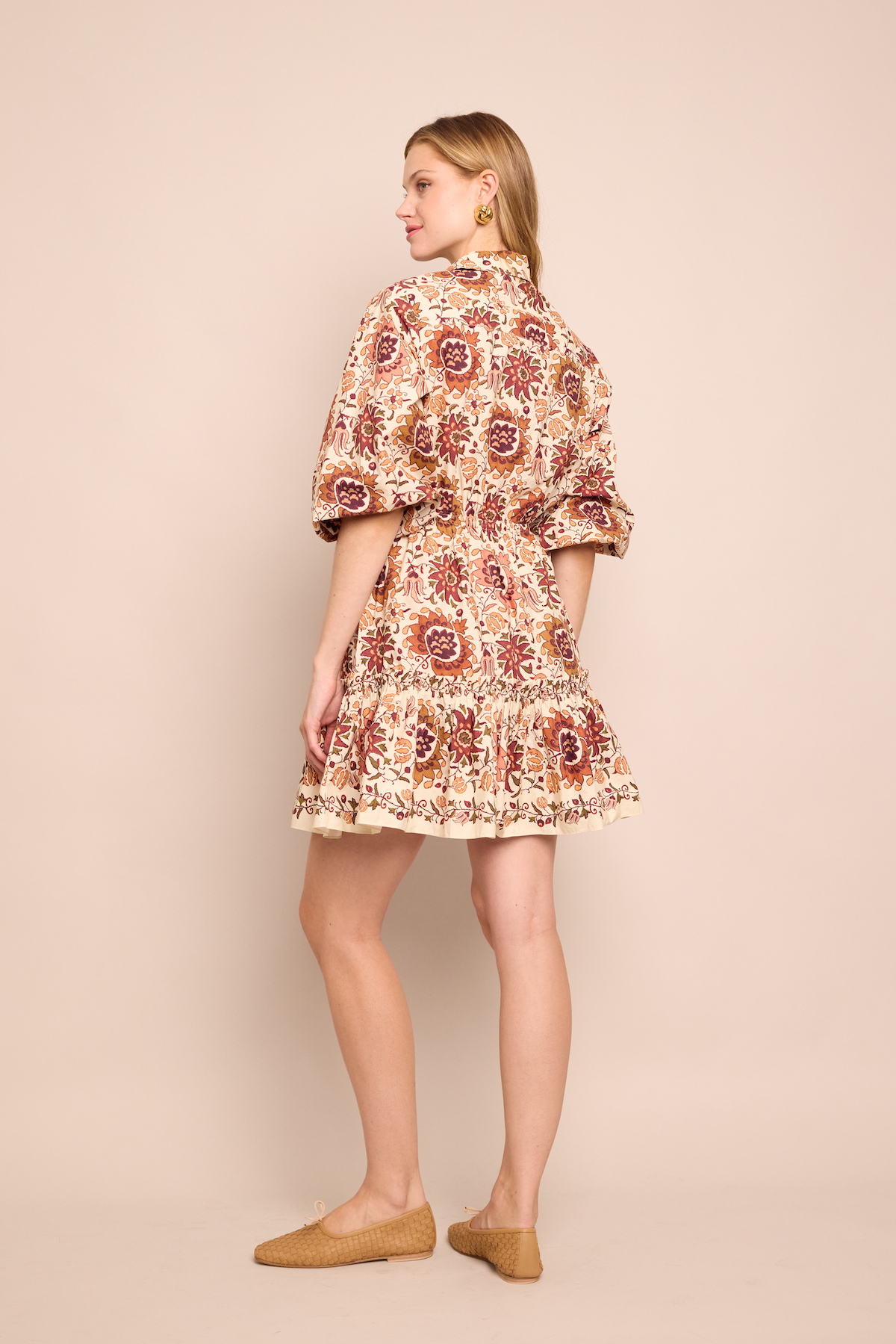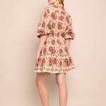 Collared neckline. Drawstring waistband. Puffed sleeves. Hem falls above the knee. Unlined. Sized for an easy fit. Placed print at border hem.