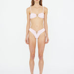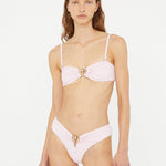 Sculptural orbit hardware pierces matte lycra for elevated poolside dressing. This wide band brief is cut high at the waist and ruched at the centre.