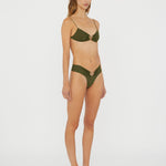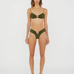 Sculptural orbit hardware pierces matte lycra for elevated poolside dressing. This minimal bikini top features fine elongated ties that adjust for ease of wear.